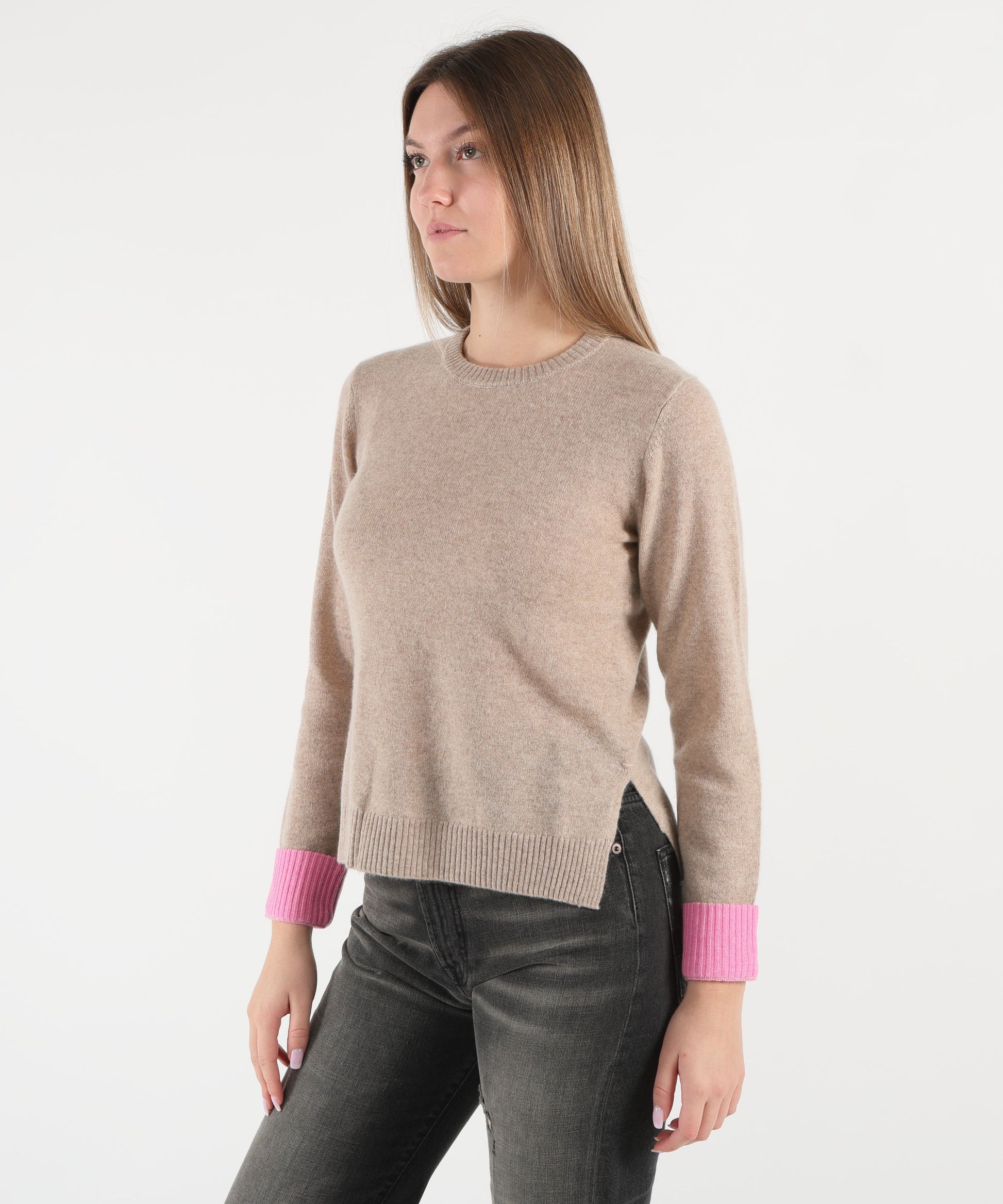 Maglia dal girocollo classico con giromanica e ampiezza regolare, caratterizzata da spacchetti laterali sul fondo per maggiore comfort e libertà di movimento. Le maniche terminano con polsini risvoltati in rosa a contrasto, che aggiungono un dettaglio femminile e contemporaneo, rendendo la maglia ideale per outfit casual chic o look da giorno sofisticati.