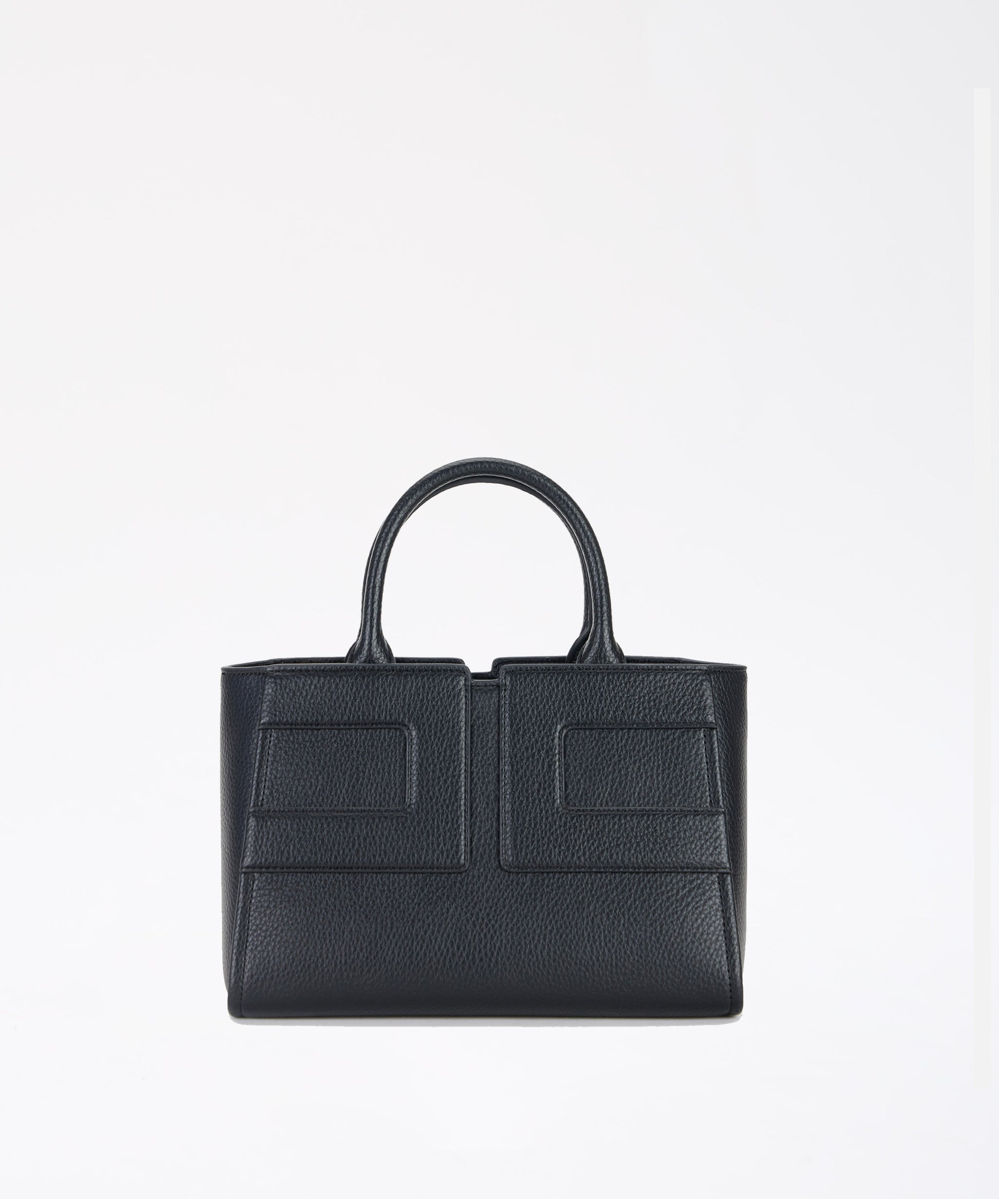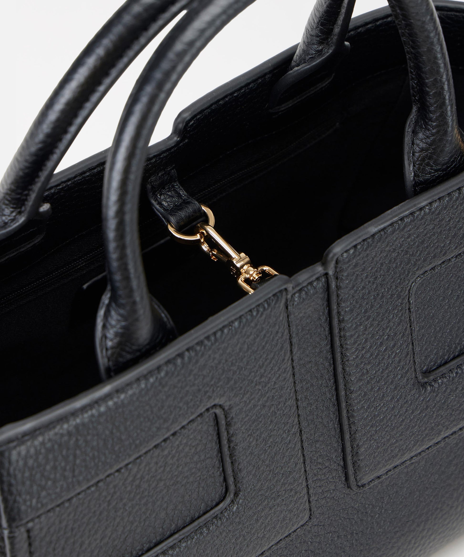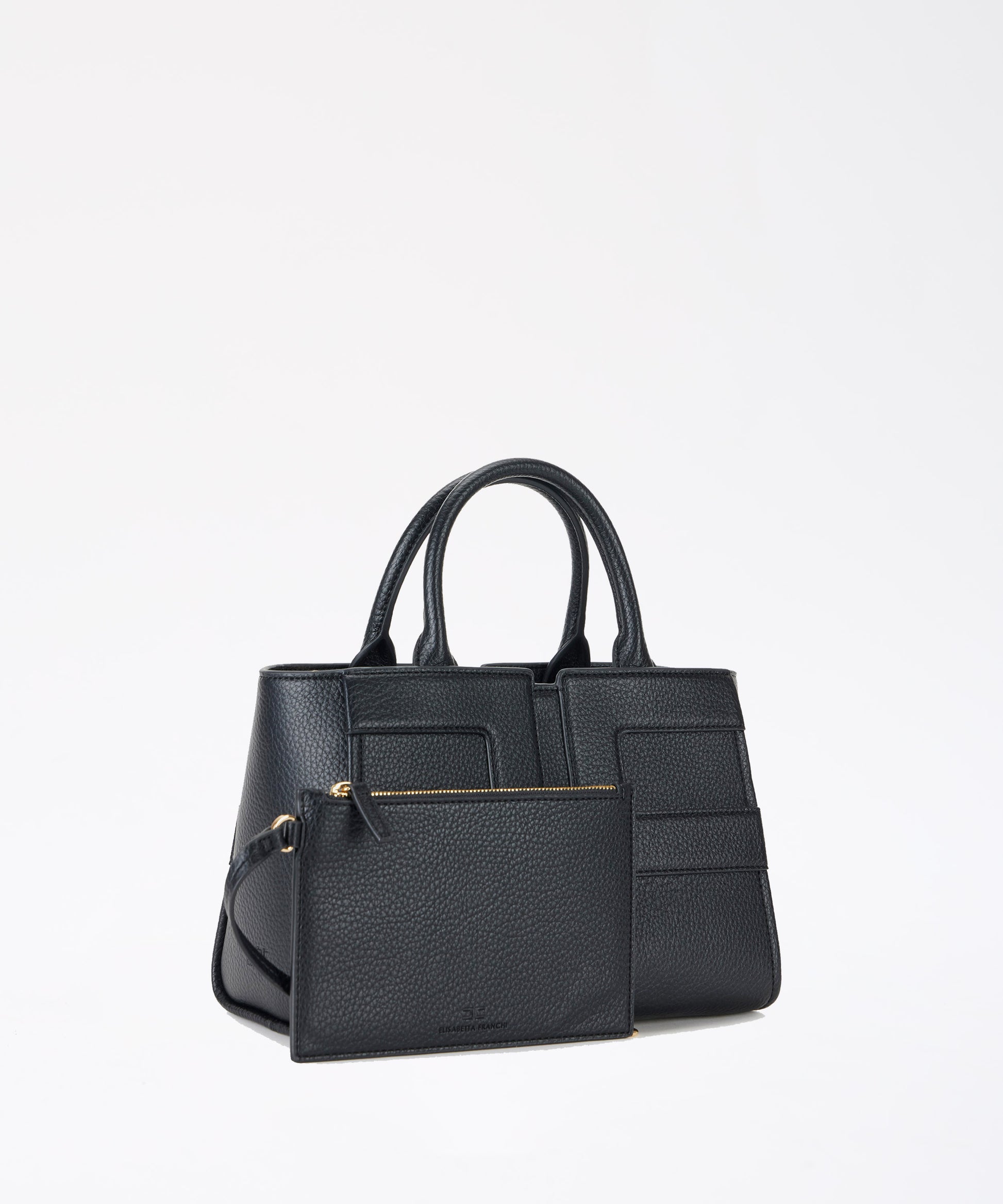 Borsa strutturata con silhouette trapezoidale, manici arrotondati e tracolla regolabile con moschettone dorato. Include pochette interna con zip. Elegante e versatile, perfetta per look da ufficio o tempo libero. Dimensioni: 25 x 20 x 13 cm. Stagione autunno/inverno.