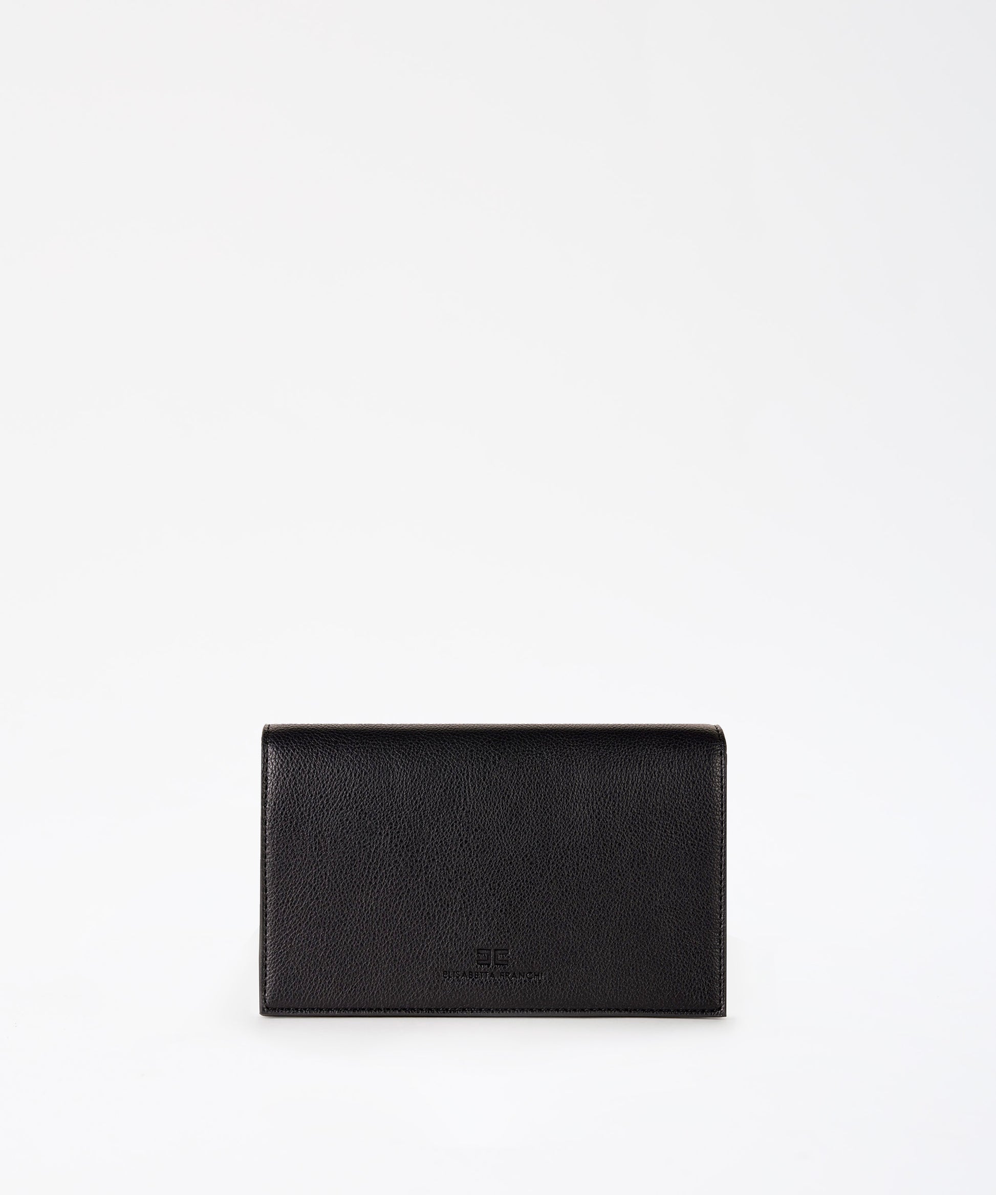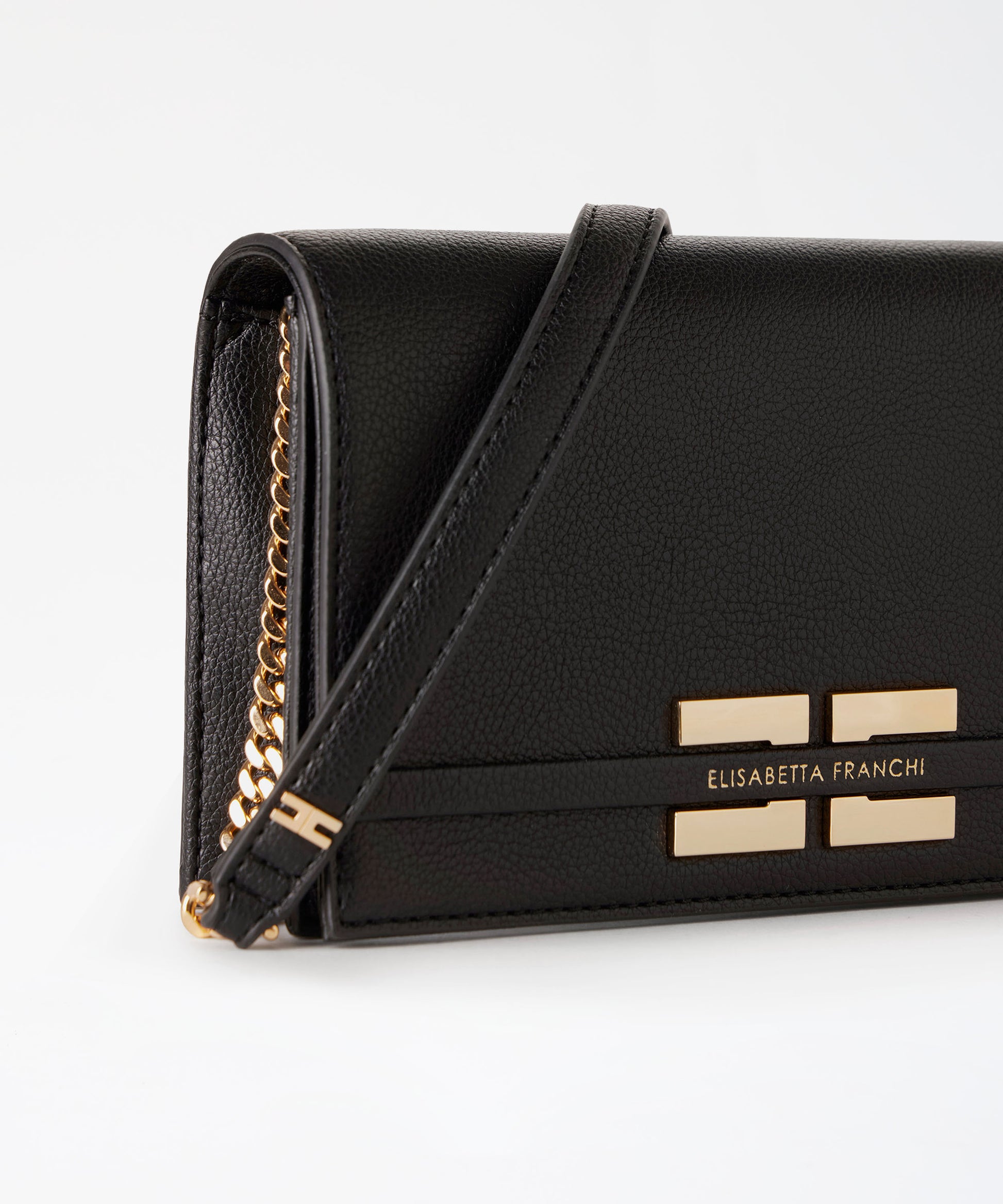 Borsa a tracolla compatta in materiale sintetico effetto pelle, con catena groumette con spallaccio e placca in metallo dorato con logo. Dimensioni 12 × 19 × 3 cm.