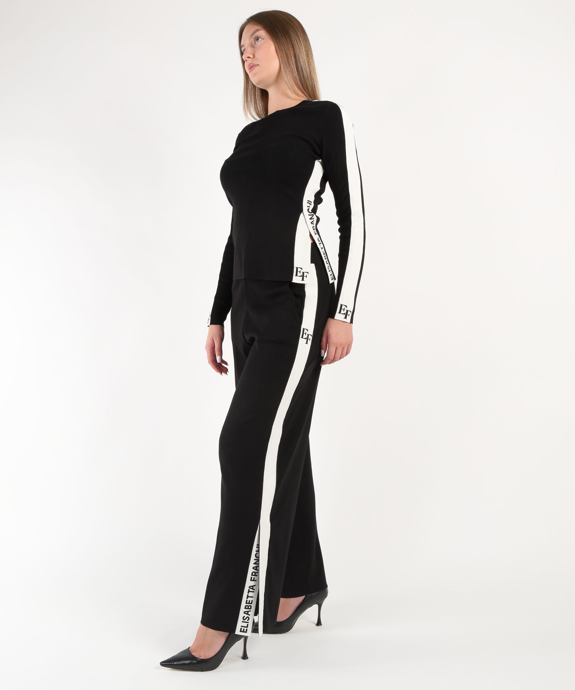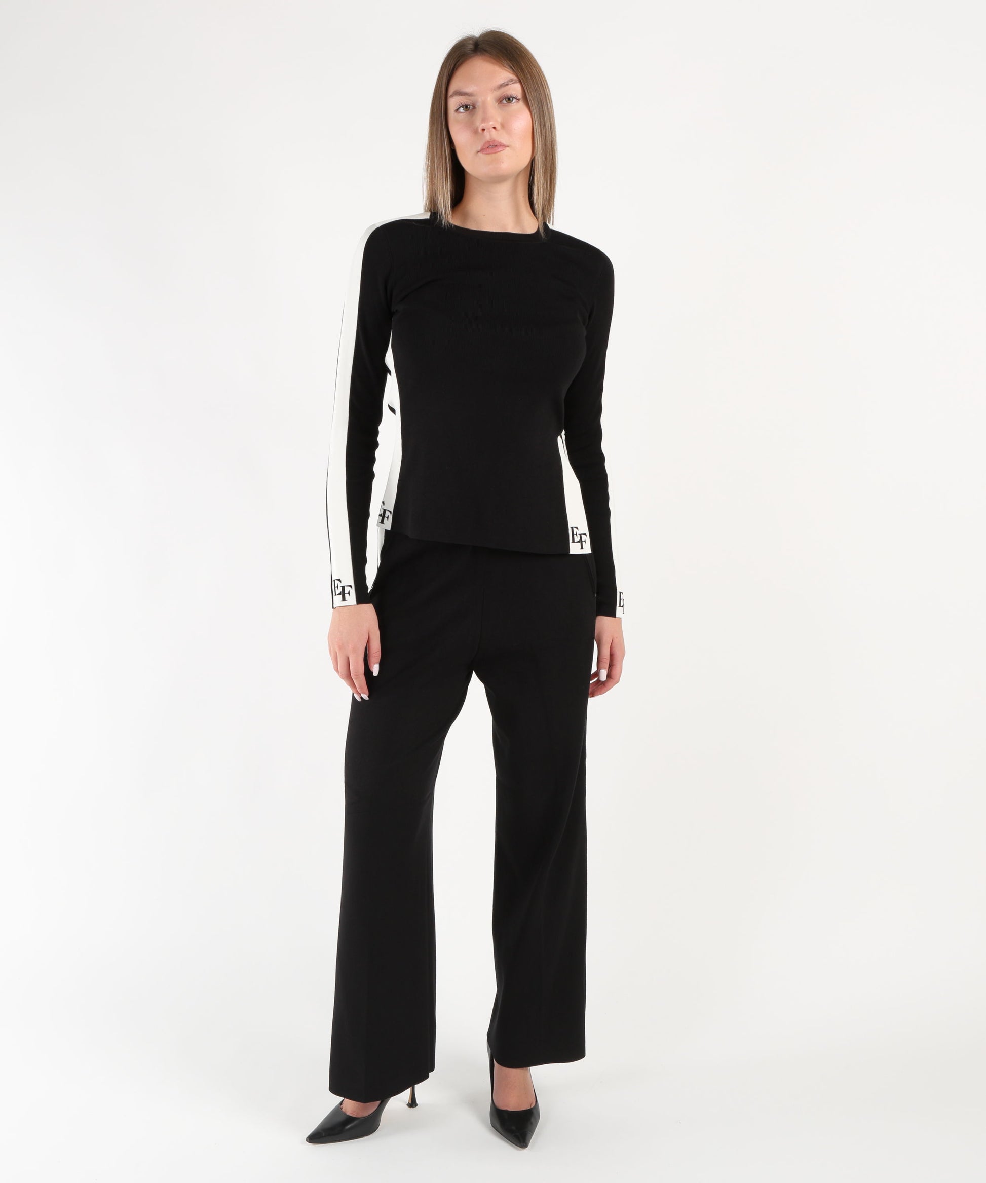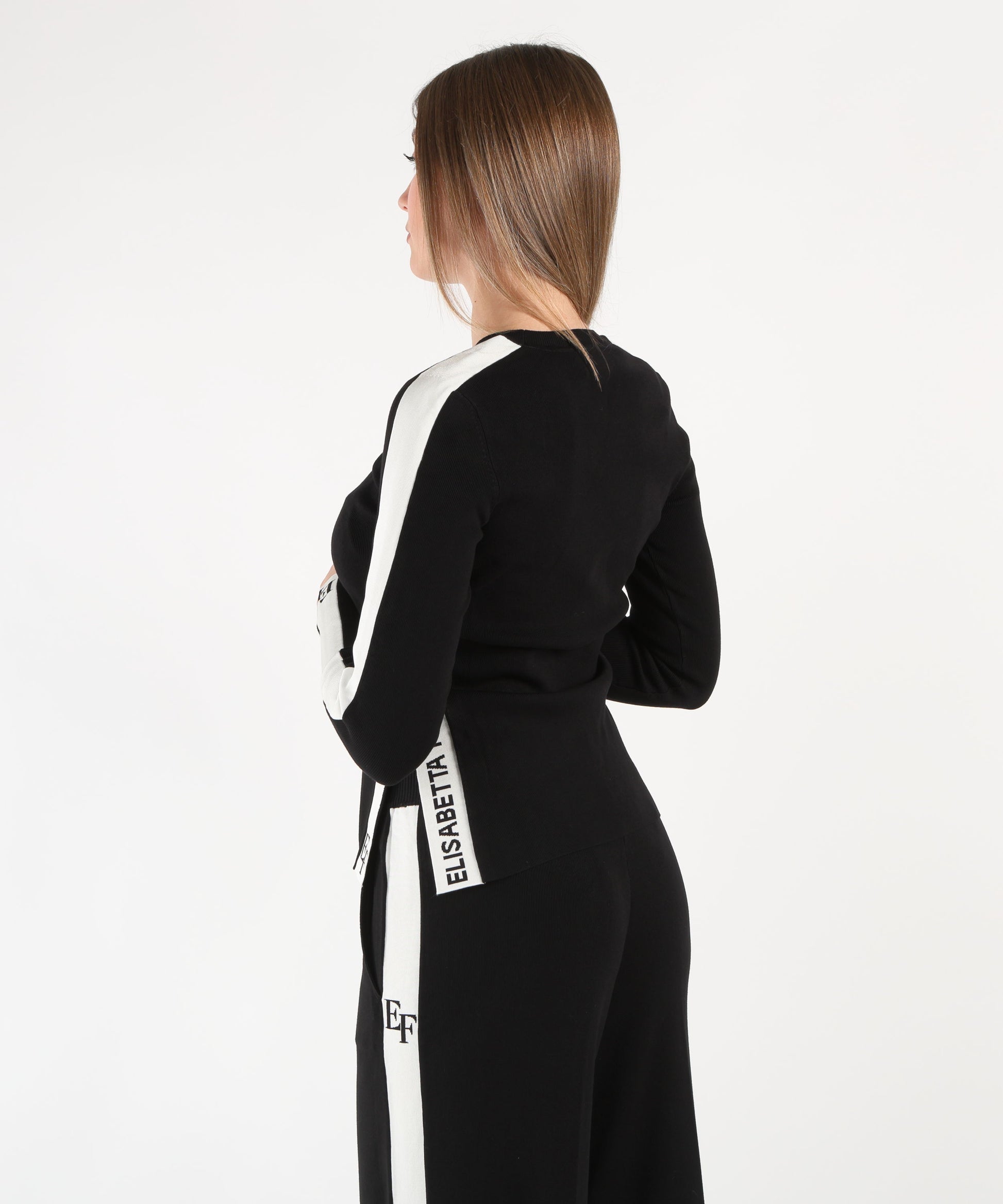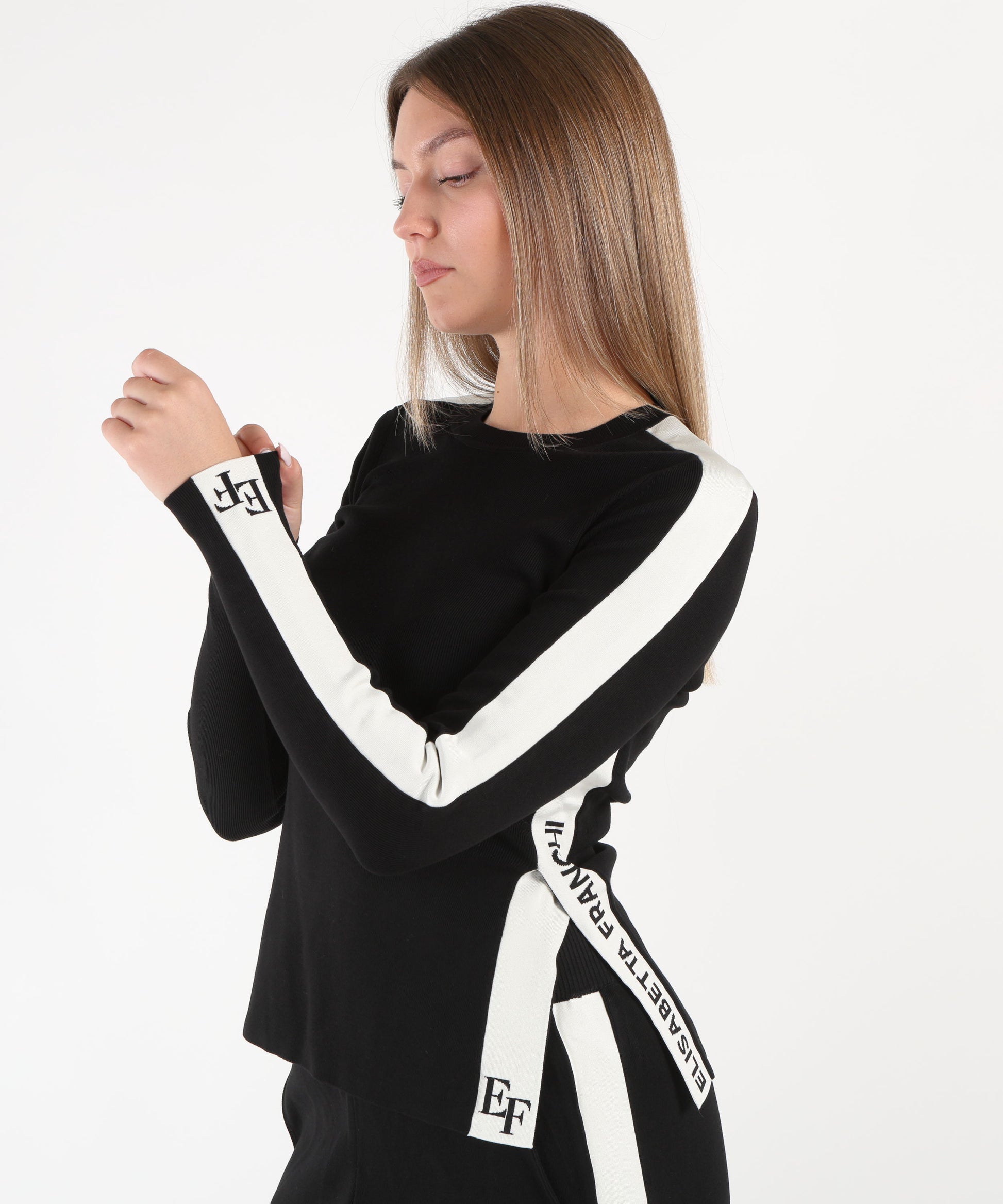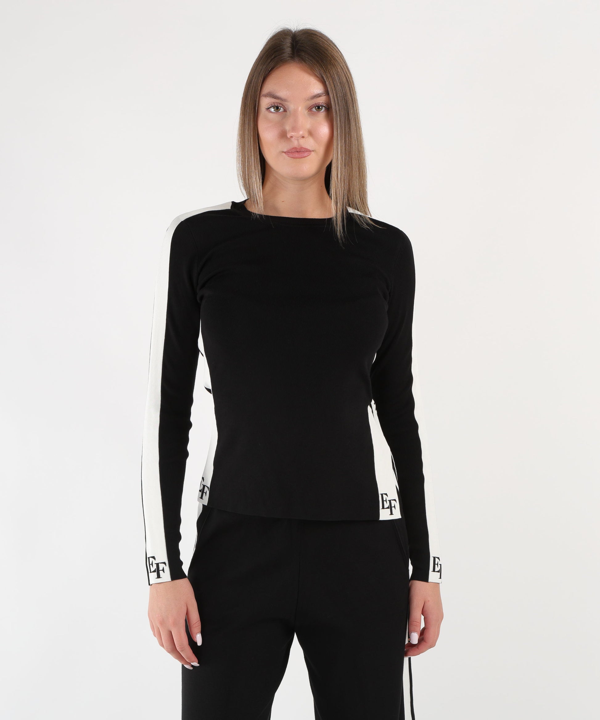 Maglia aderente in viscosa, caratterizzata da un design elegante e moderno. Presenta un girocollo classico e maniche lunghe per un comfort totale. Le bande rifinite in viscosa lucida creano un raffinato contrasto di texture, mentre i loghi intarsiati in colori a contrasto aggiungono un tocco grafico distintivo. Lo spacco laterale, impreziosito da un dettaglio logo, dona movimento e un tocco finale di stile. Perfetta per look sofisticati e versatili, adatta sia a occasioni casual che più formali.