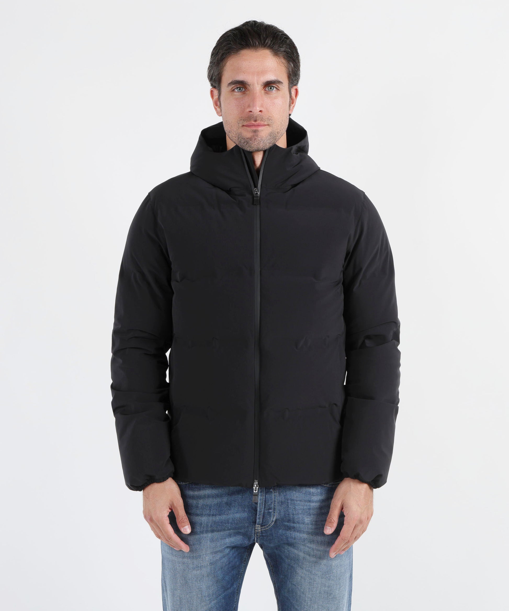 Piumino "New Impact" functional wardrobe, nero, con cappuccio, zip frontale e tasche laterali, caldo e leggero, perfetto per l’uso quotidiano.