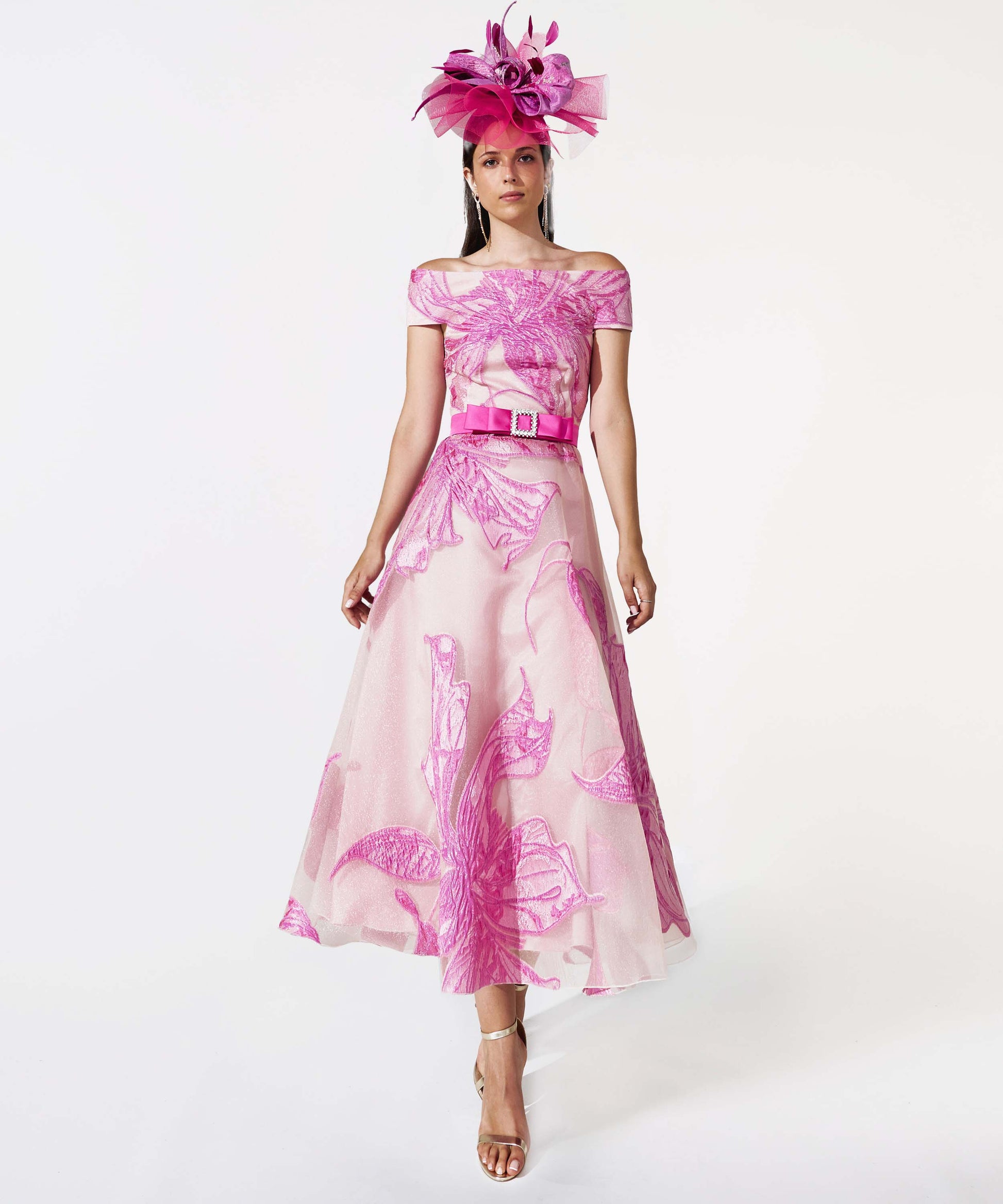 Abito godet alla caviglia con elegante scollo omerale sul retro, che aggiunge un tocco sofisticato e contemporaneo. La cintura in vita è arricchita da una fibbia con cristalli, che dona luce e raffinatezza al look. Perfetto per occasioni speciali, questo abito unisce comfort e stile con un design fluido che valorizza la figura.