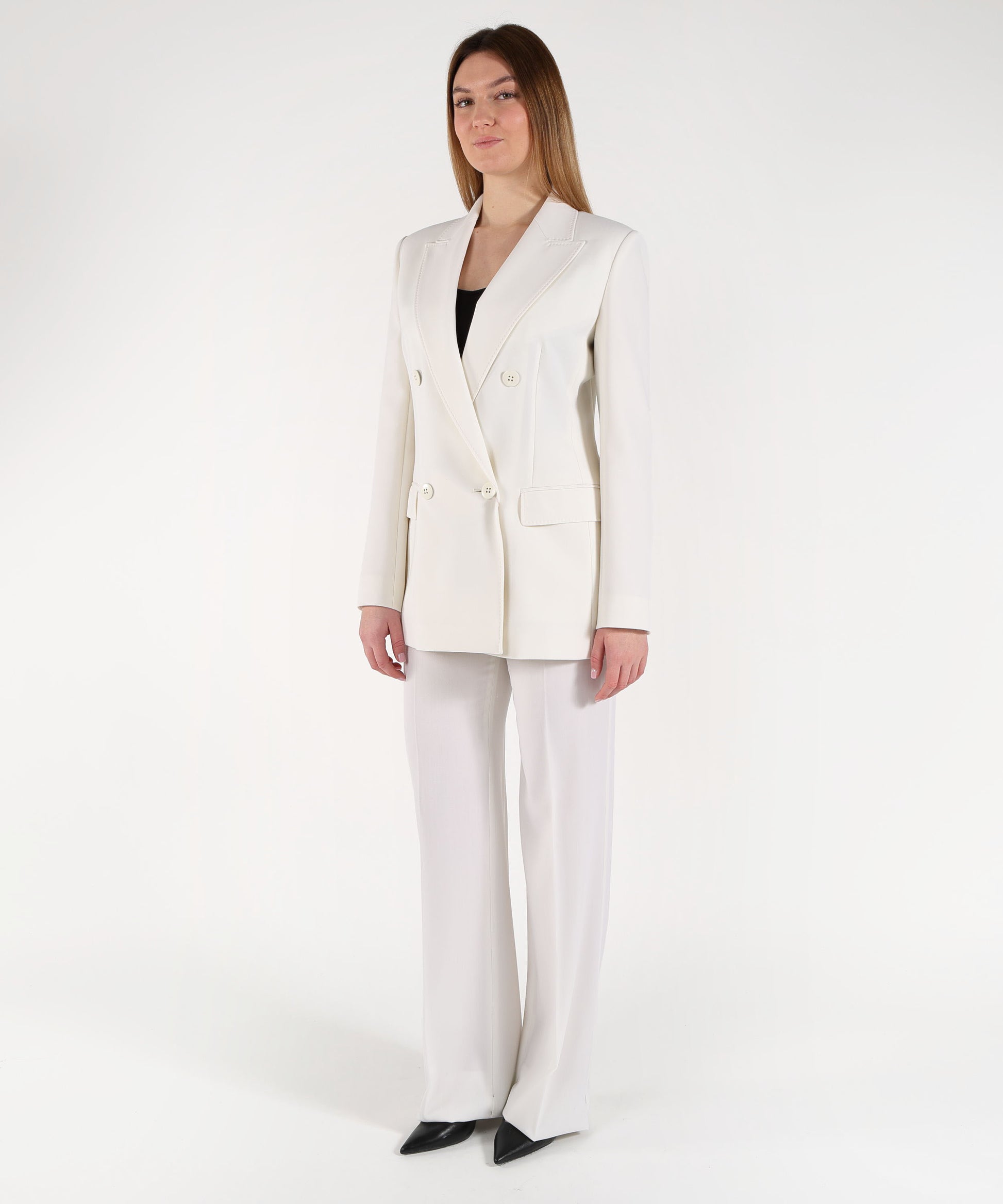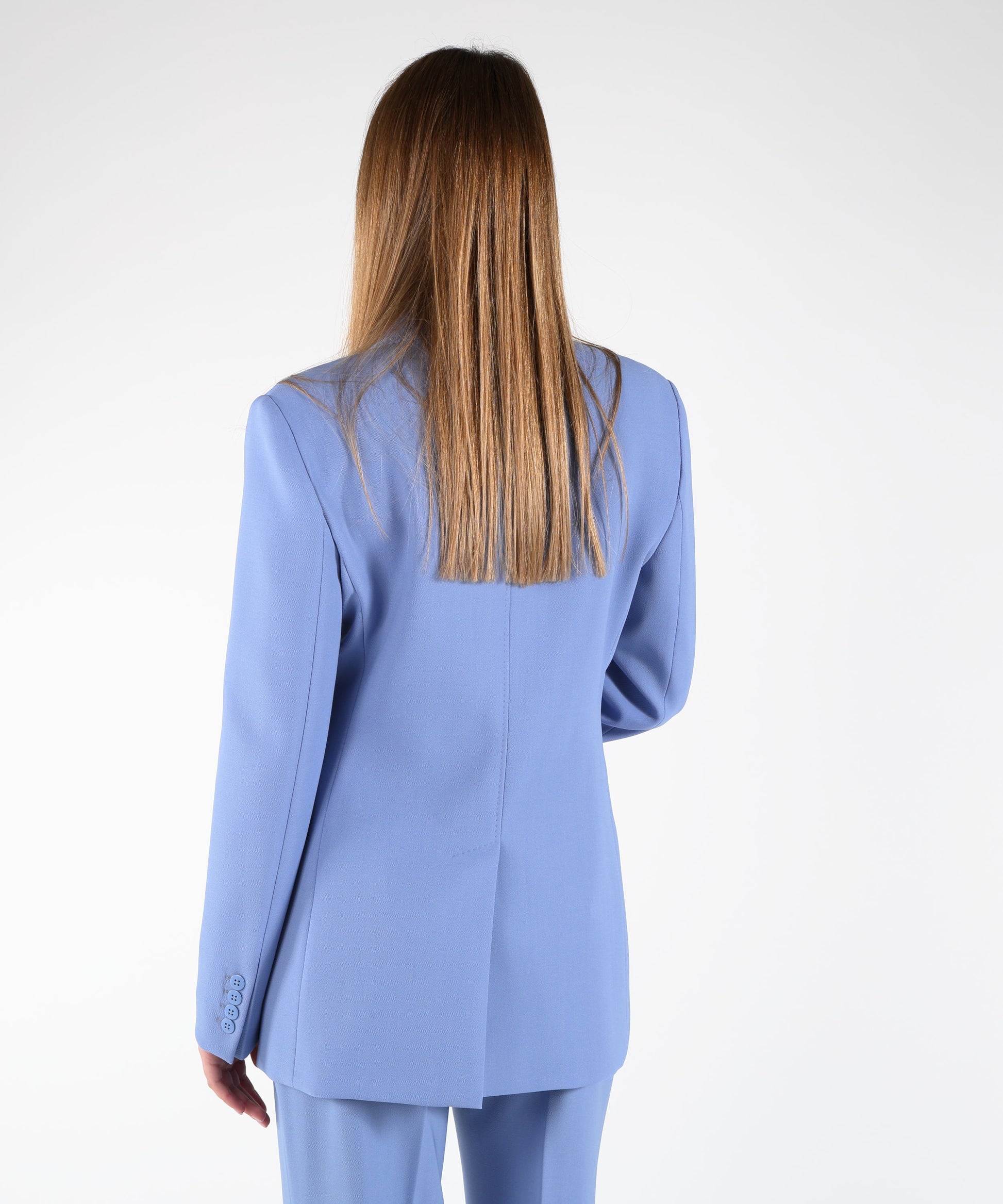 Blazer doppiopetto d’ispirazione sartoriale in crêpe satin di pura lana comfort, caratterizzato da una silhouette femminile e sfiancata. Presenta collo rever a lancia, maniche lunghe con bottoni sul fondo, chiusura frontale con bottoni a vista, tasche con patta e spacco centrale sul retro. Completamente foderato, elegante e raffinato.