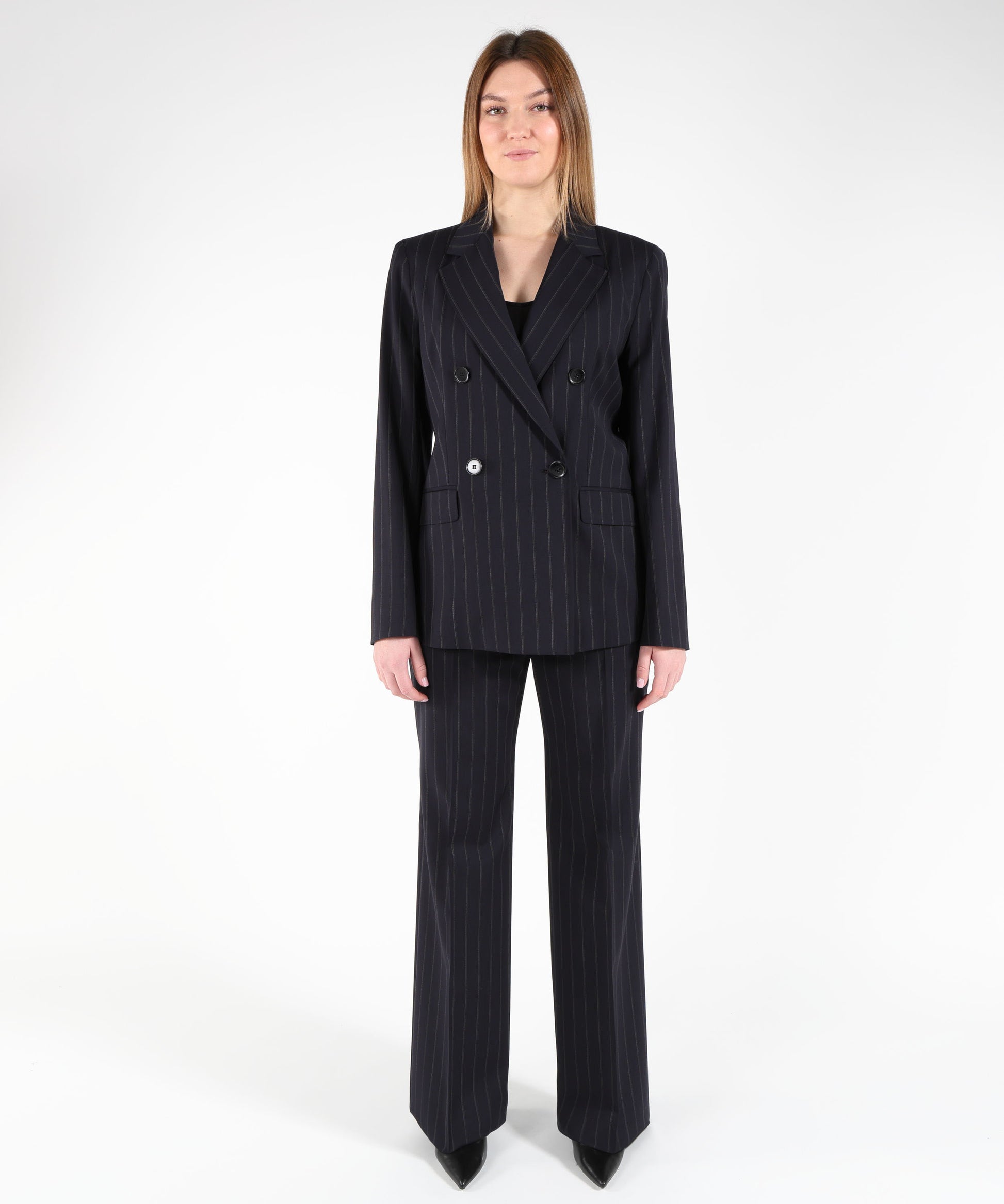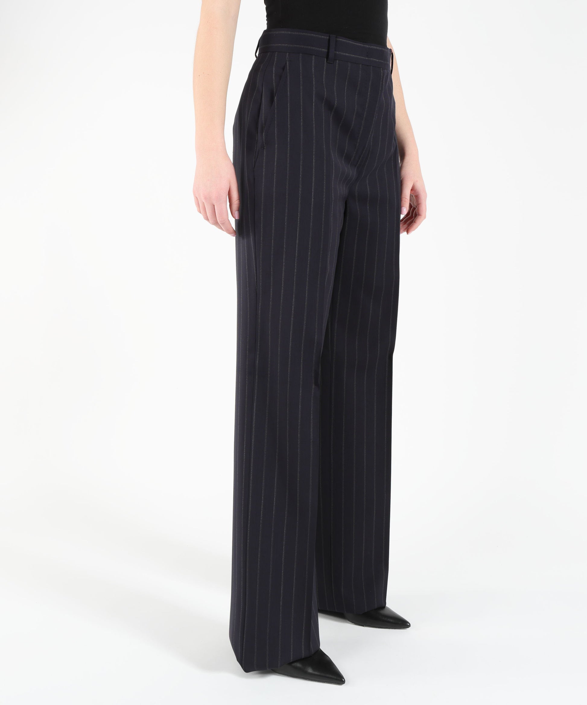 Pantalone d’ispirazione sartoriale in tela di lana gessata, caratterizzato da una linea dritta ed elegante. Rifinito con puntino sartoriale, presenta listino alto in vita con chiusura a zip con patta e gancetto, tasche alla francese sui fianchi, passanti per cintura e piega stirata per un look curato e raffinato.