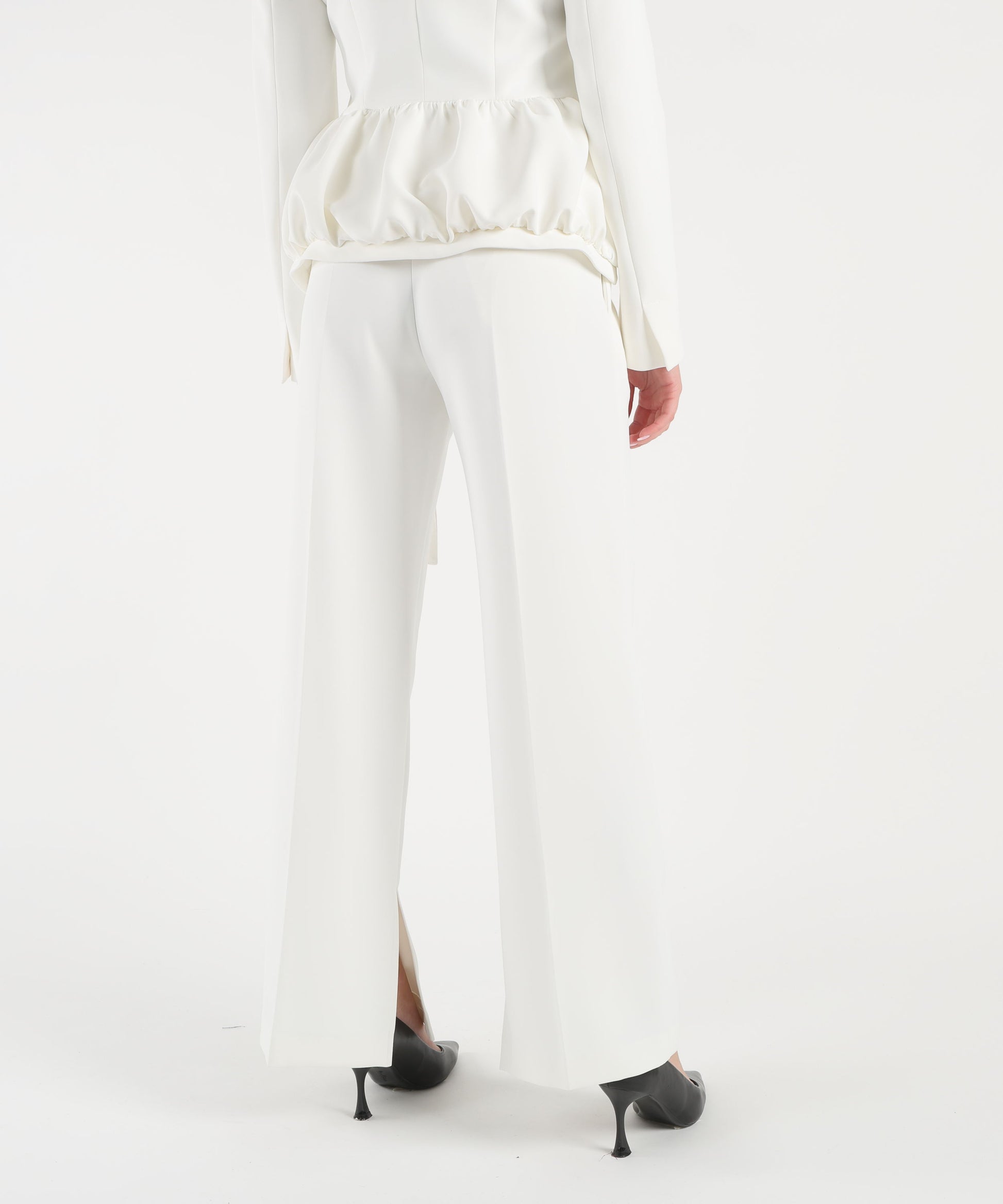 Pantalone ampio con pinces orizzontali sulle ginocchia, zip a scomparsa e cintura nello stesso tessuto con fibbia argento satinato, elegante e moderno.