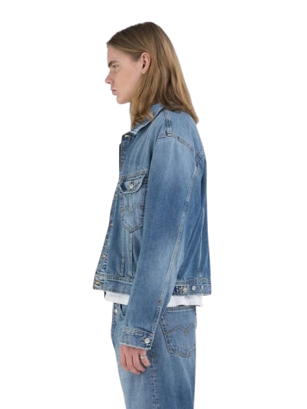 Giubbino dal look vintage anni '90 riproposto in chiave contemporanea e realizzato in indigo denim di cotone riciclato 12 oz certificato GRS.
