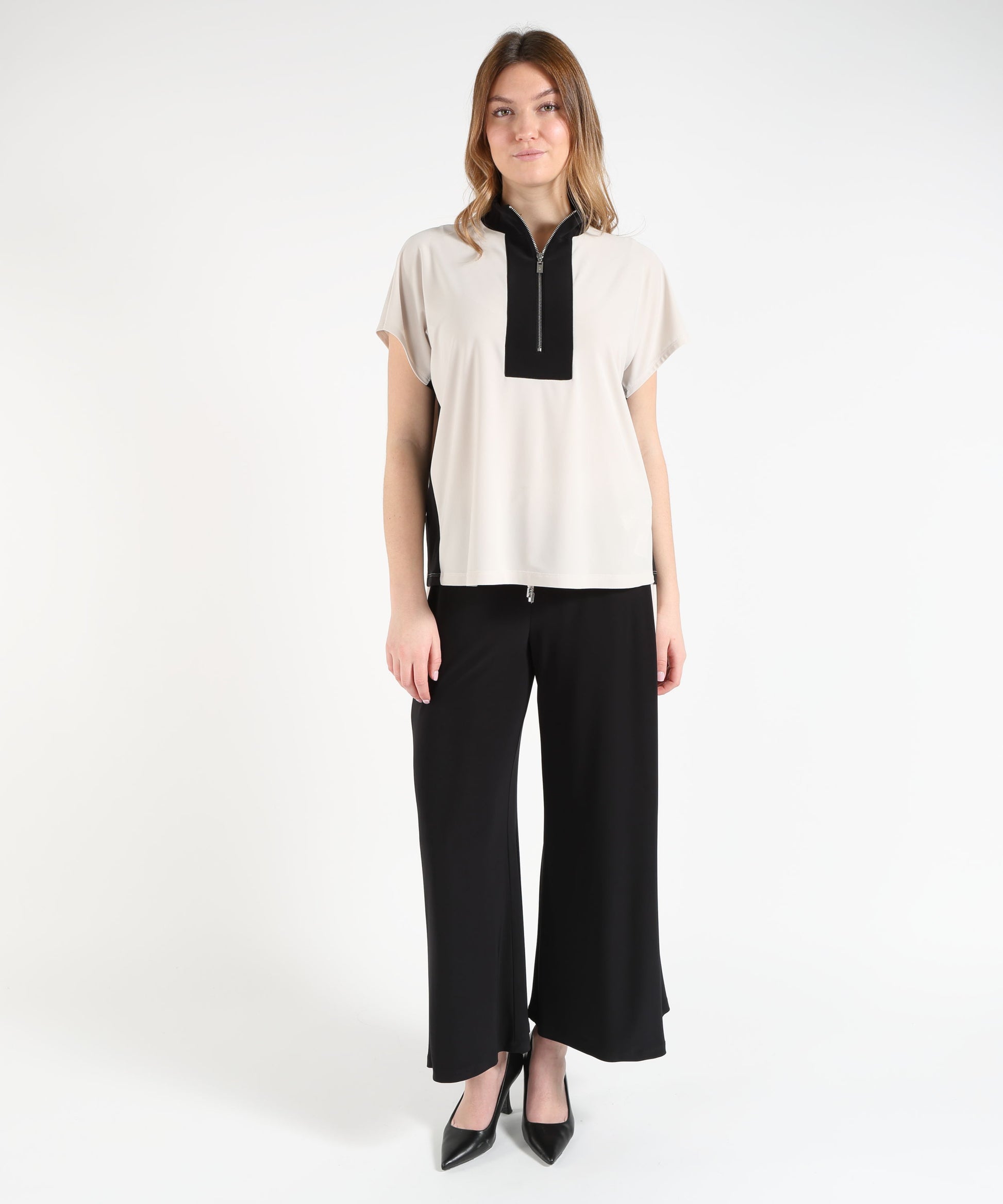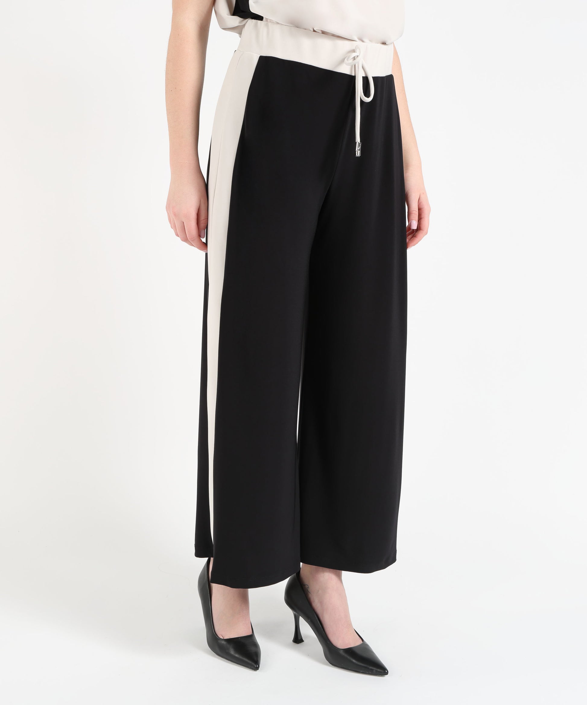 Pantaloni a gamba larga in maglia effetto seta con design color block, fascia elastica in vita con coulisse JR e piccoli spacchi laterali. Modello sfoderato, comodo e moderno.