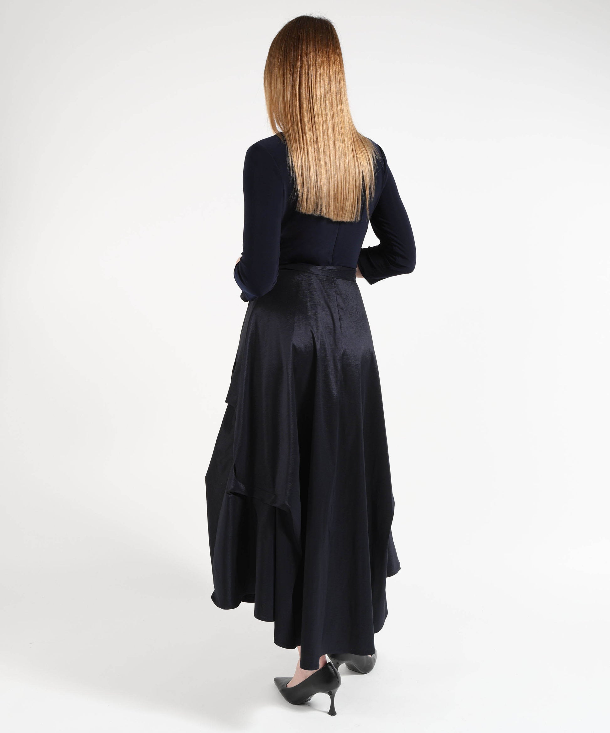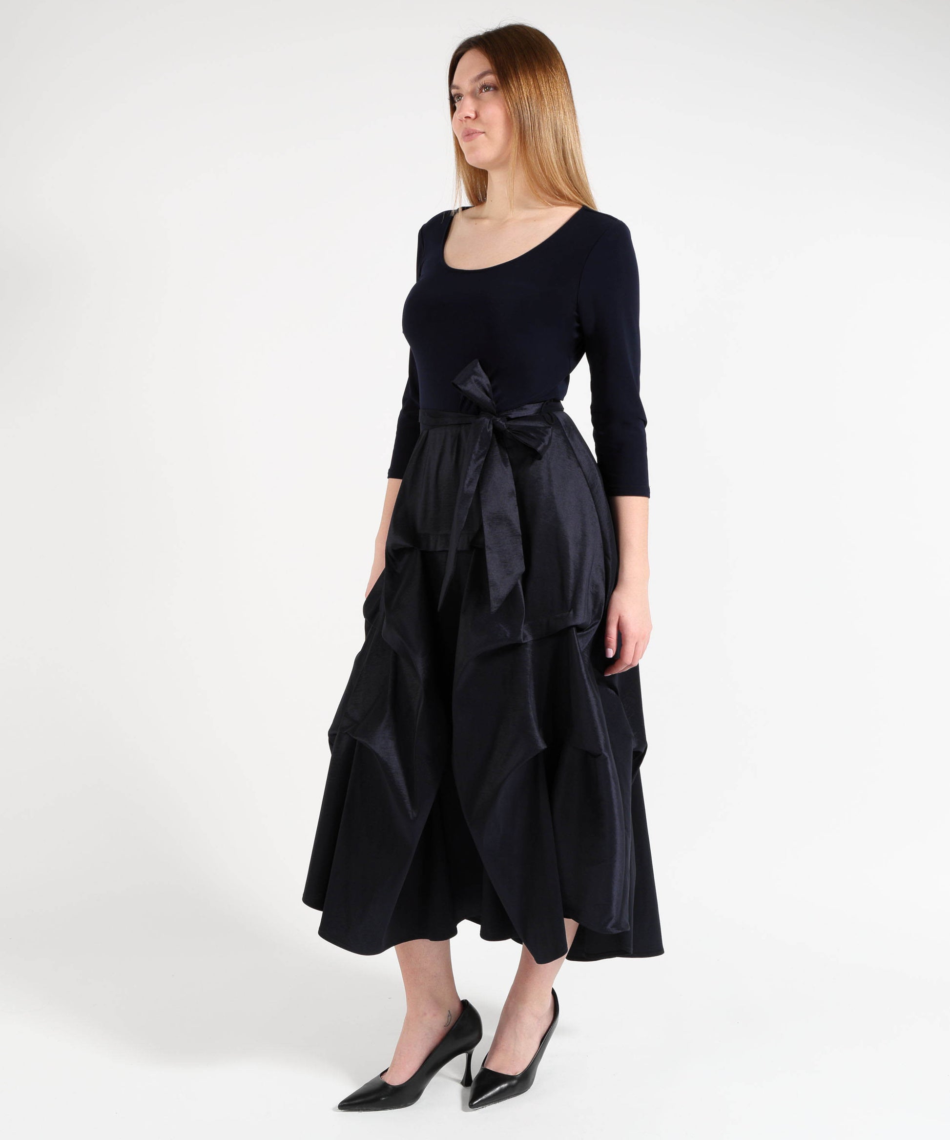 Abito Signature con corpetto in maglia effetto seta e gonna in taffetà plissettata, arricchito da fusciacca in vita. Scollo rotondo, maniche a tre quarti, zip invisibile sul retro. Sfoderato, leggero e fluido, perfetto per occasioni eleganti.