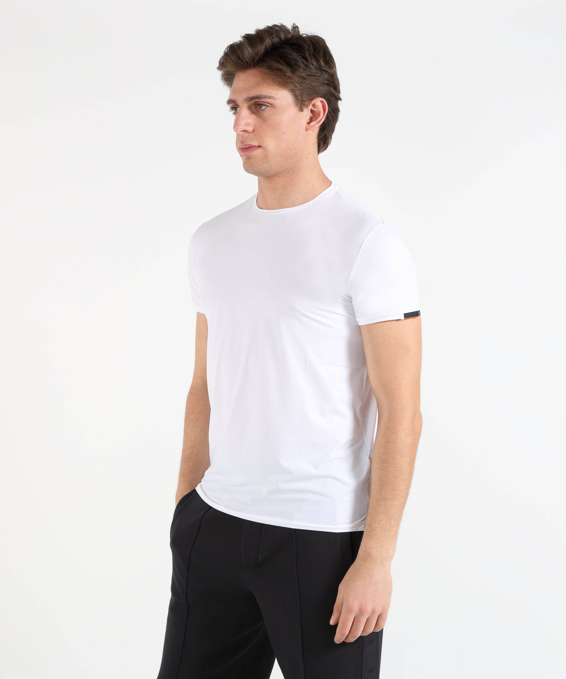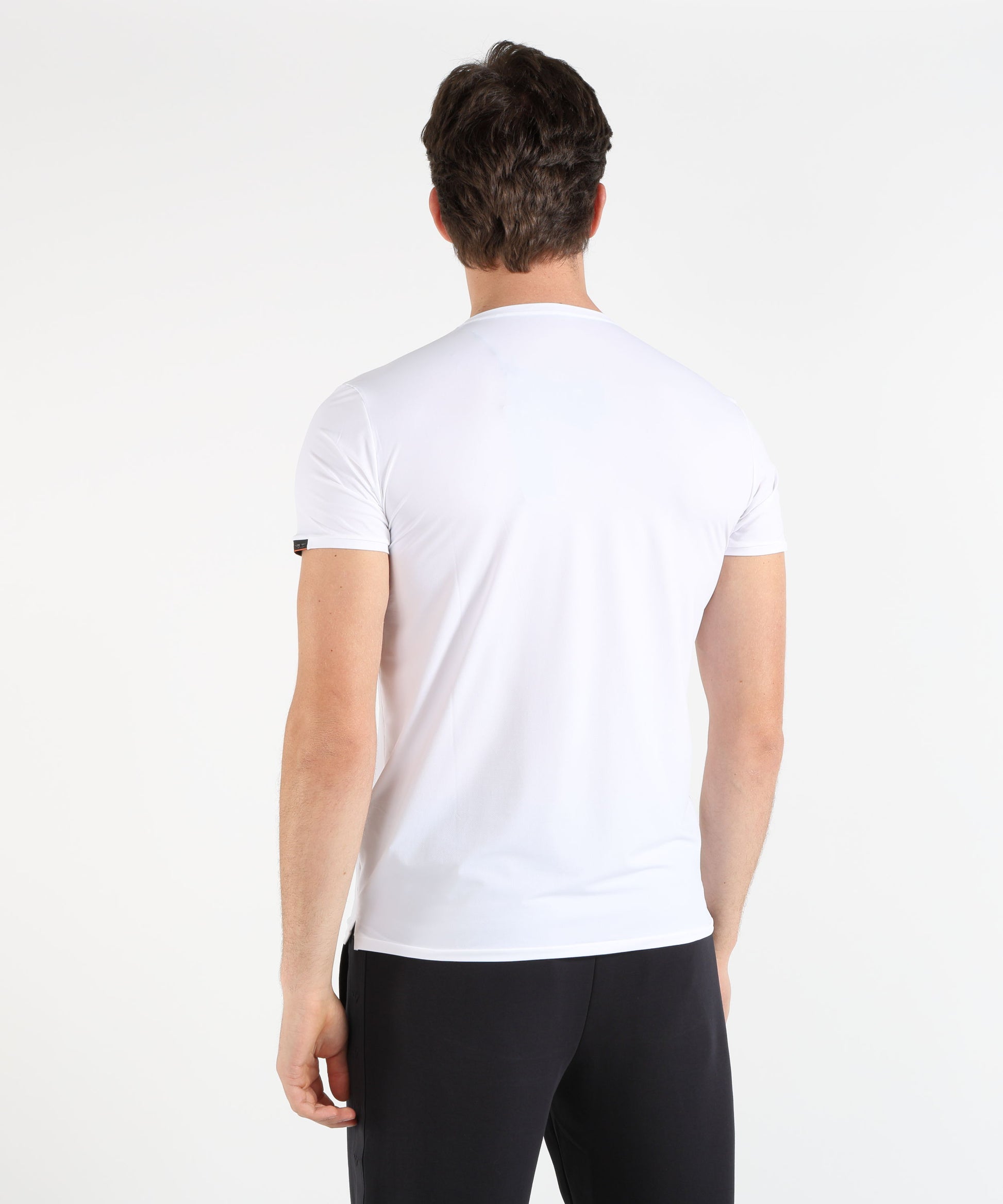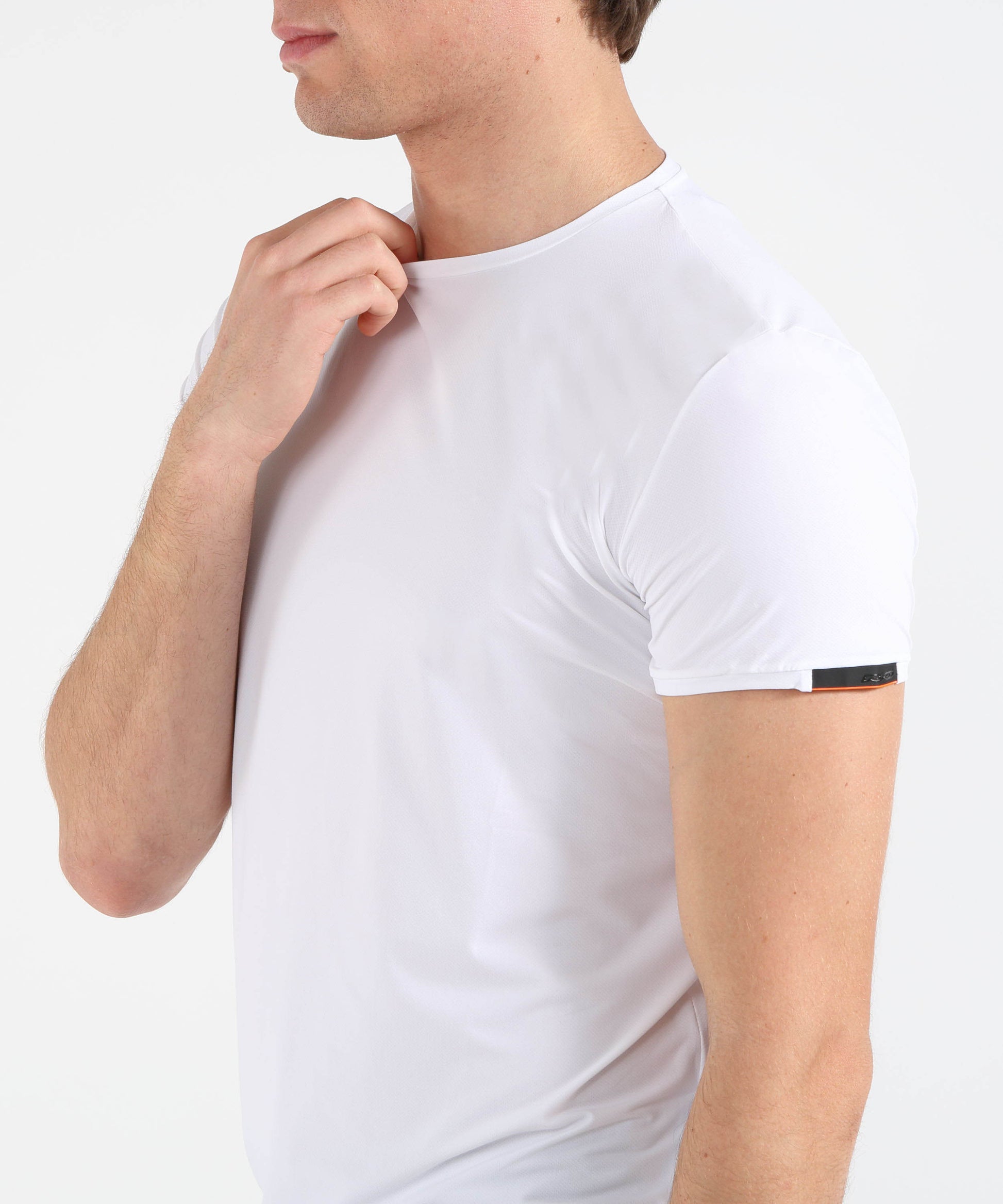 T-shirt monocroma in tessuto Oxford leggero ed elasticizzato, traspirante e a rapida asciugatura. Vestibilità regolare con micro spacchi laterali, logo sulla manica e dettaglio fluo sul fondo per uno stile casual versatile, adatto anche sotto il blazer.