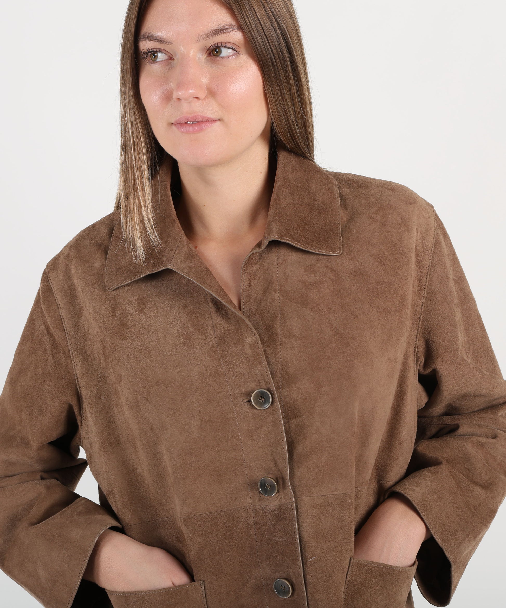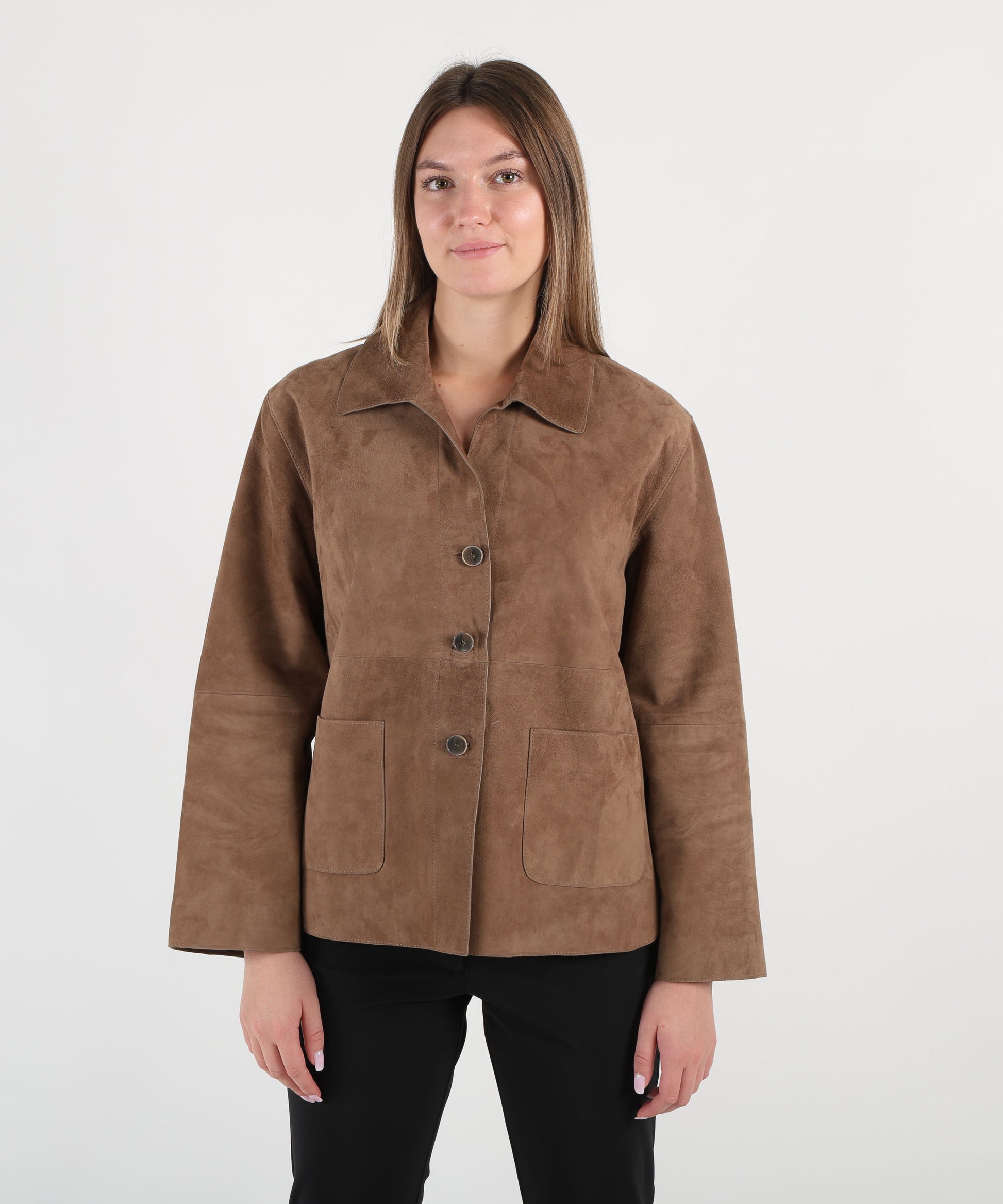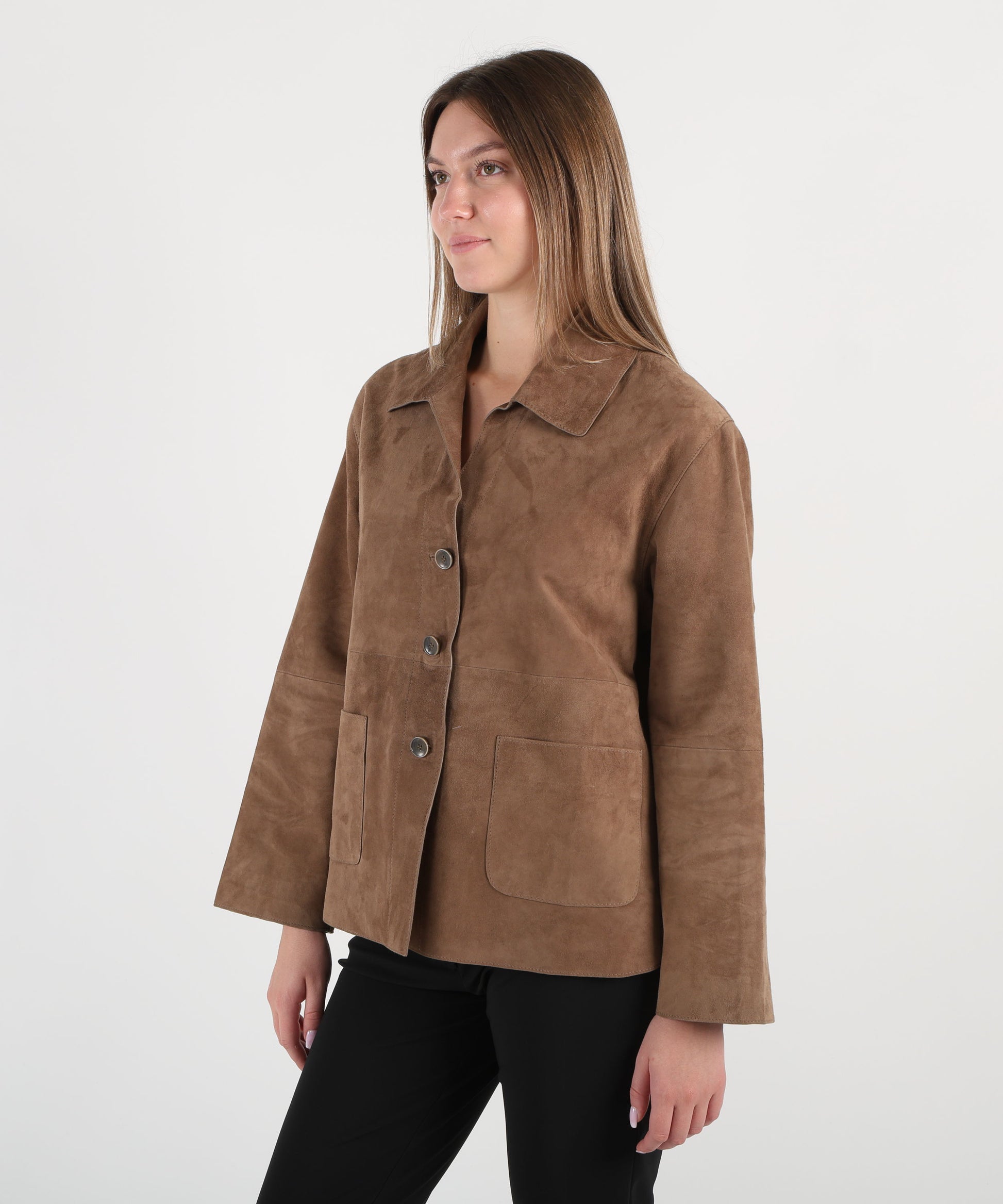 Realizzata in morbida suede con tagli e impunture in stile pelletteria, questa giacca unisce artigianalità e design contemporaneo. La linea cropped valorizza la silhouette, mentre le tasche applicate sul davanti aggiungono un tocco pratico e sofisticato. Perfetta con pantaloni a vita alta o gonne midi per un look moderno e raffinato.