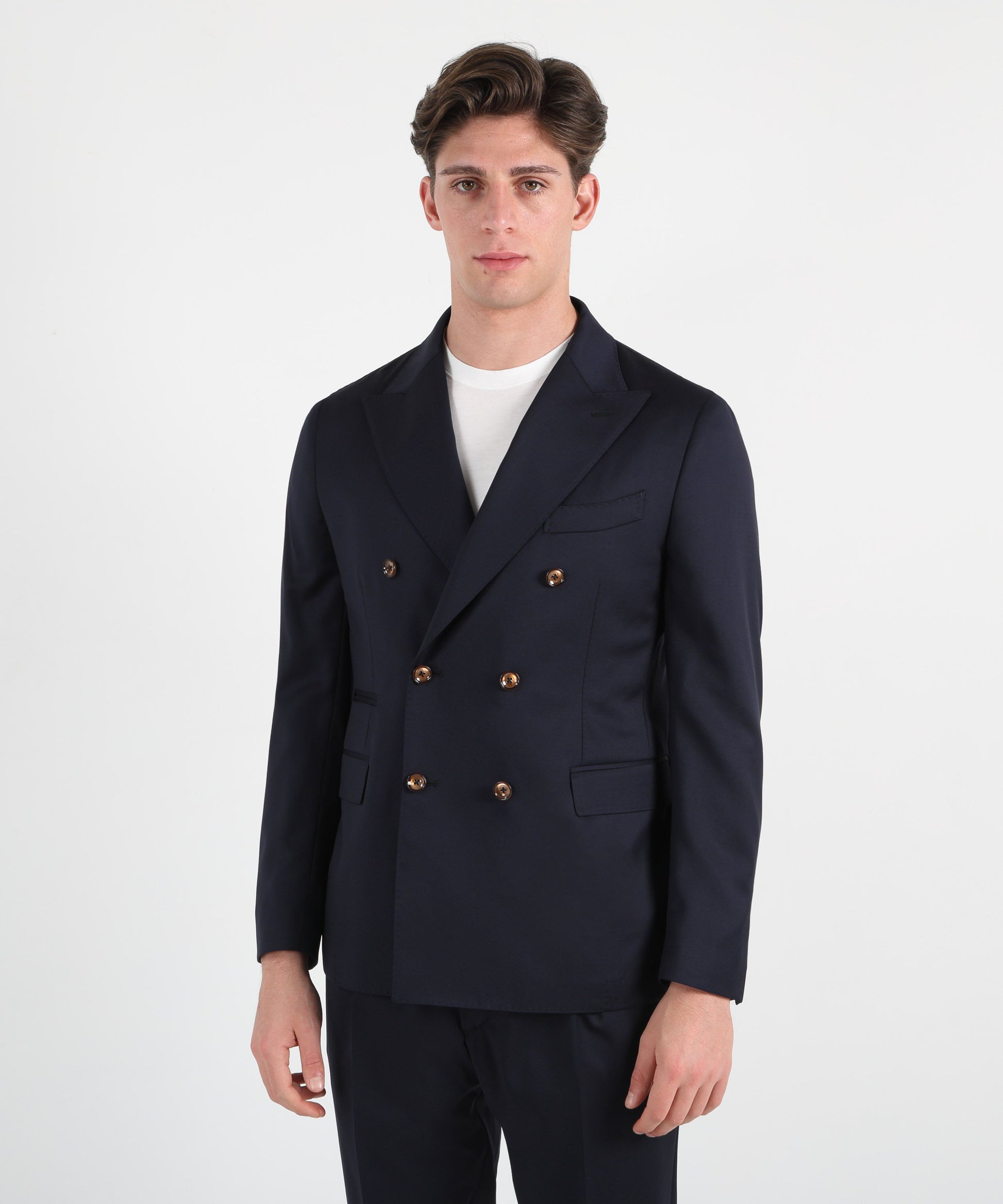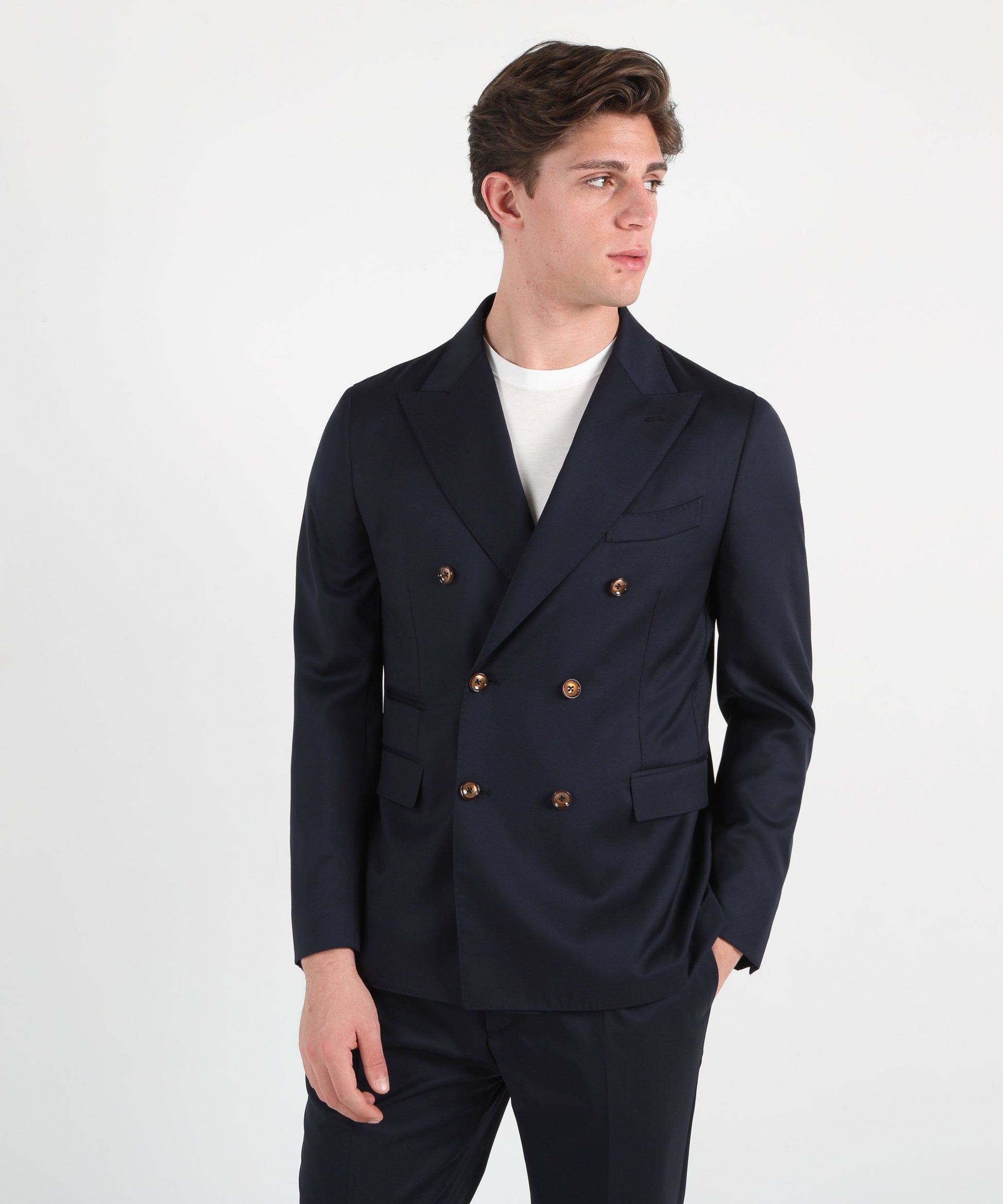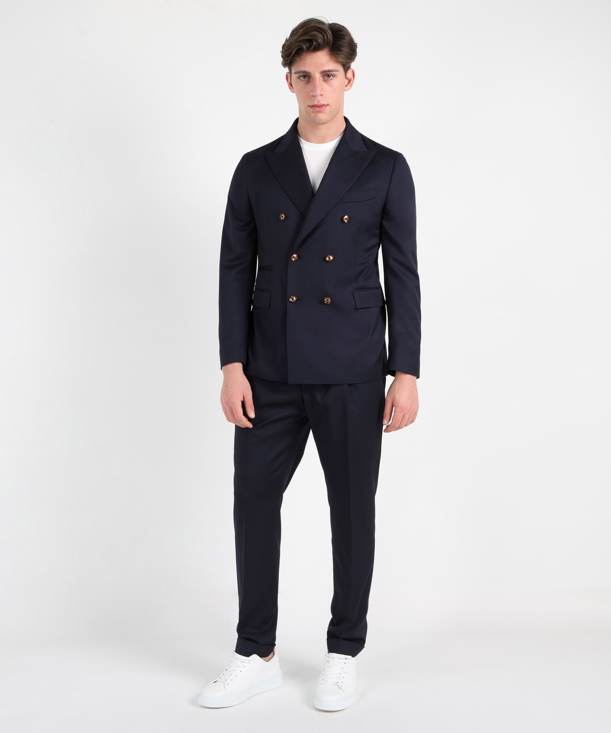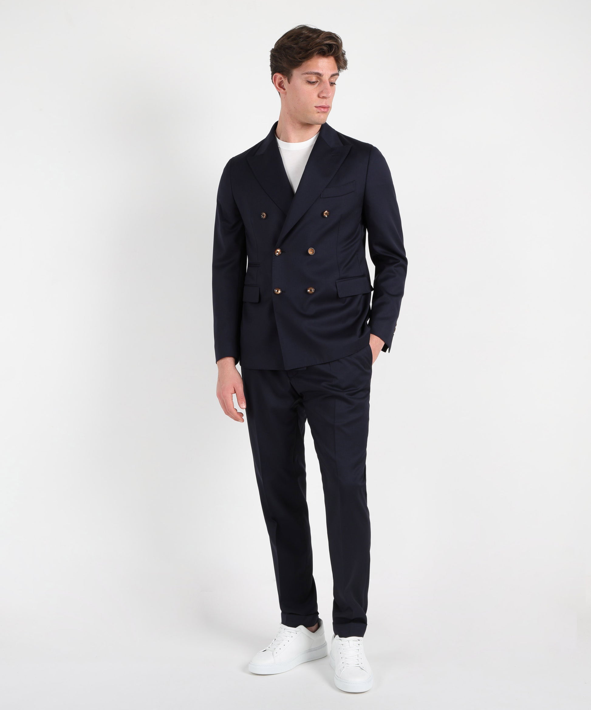 Abito doppiopetto elegante con rever a lancia e tasca ticket pocket, arricchito da bottoni in madreperla nocciola che ne esaltano il design sofisticato. La giacca presenta spacchi laterali per una vestibilità ottimale. I pantaloni, con tasche all'americana e 1 pinces, sono caratterizzati da un fondo da 18 cm con risvolto 4, aggiungendo un tocco di classe e modernità. Ideale per eventi formali e occasioni eleganti.