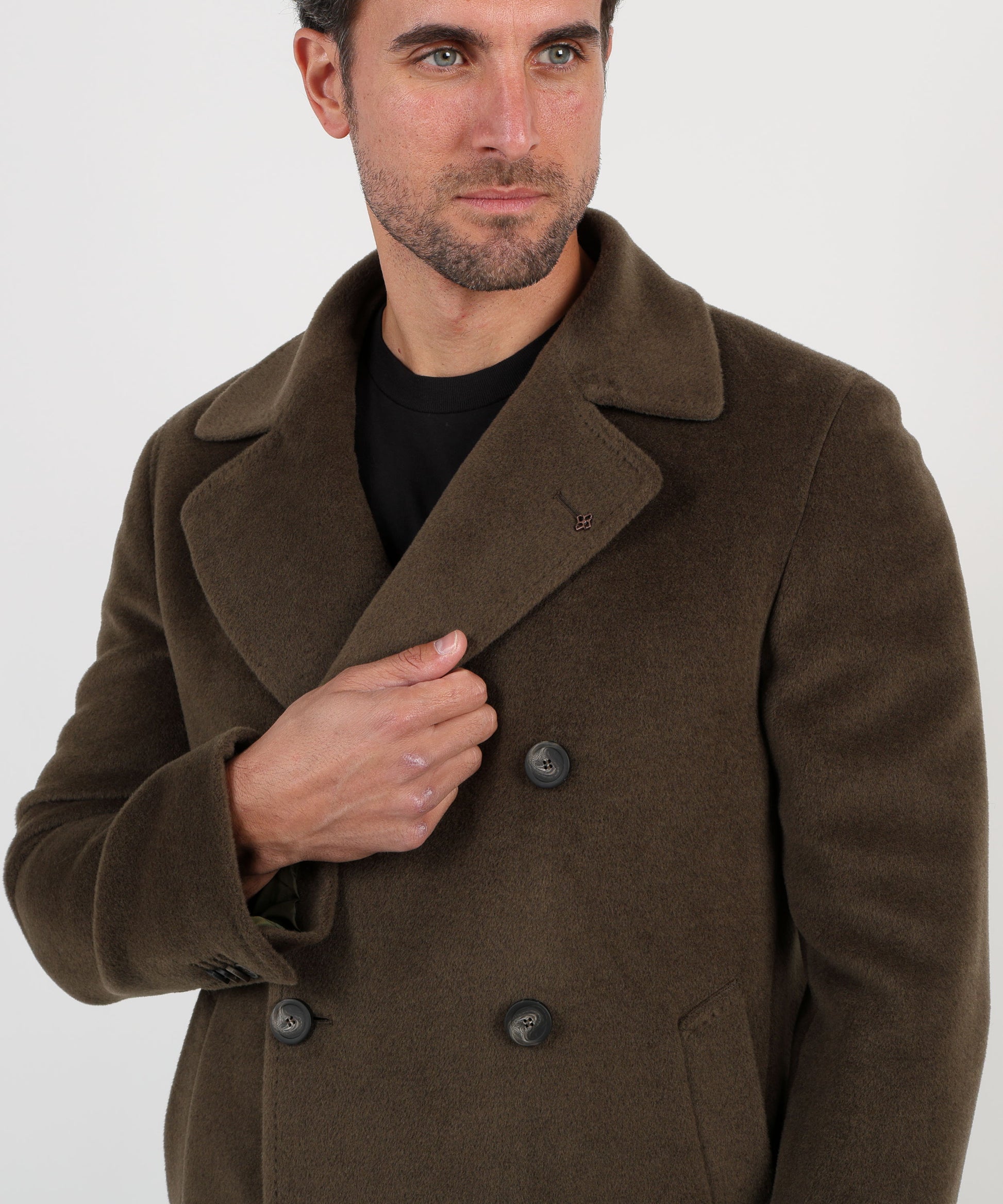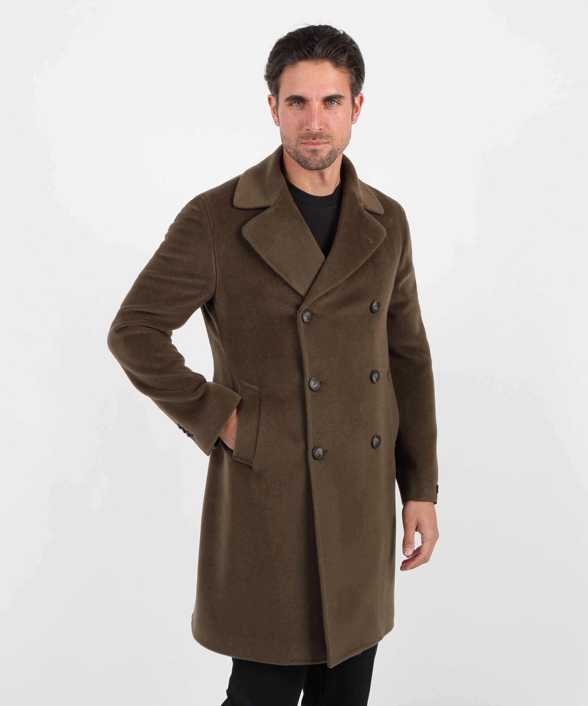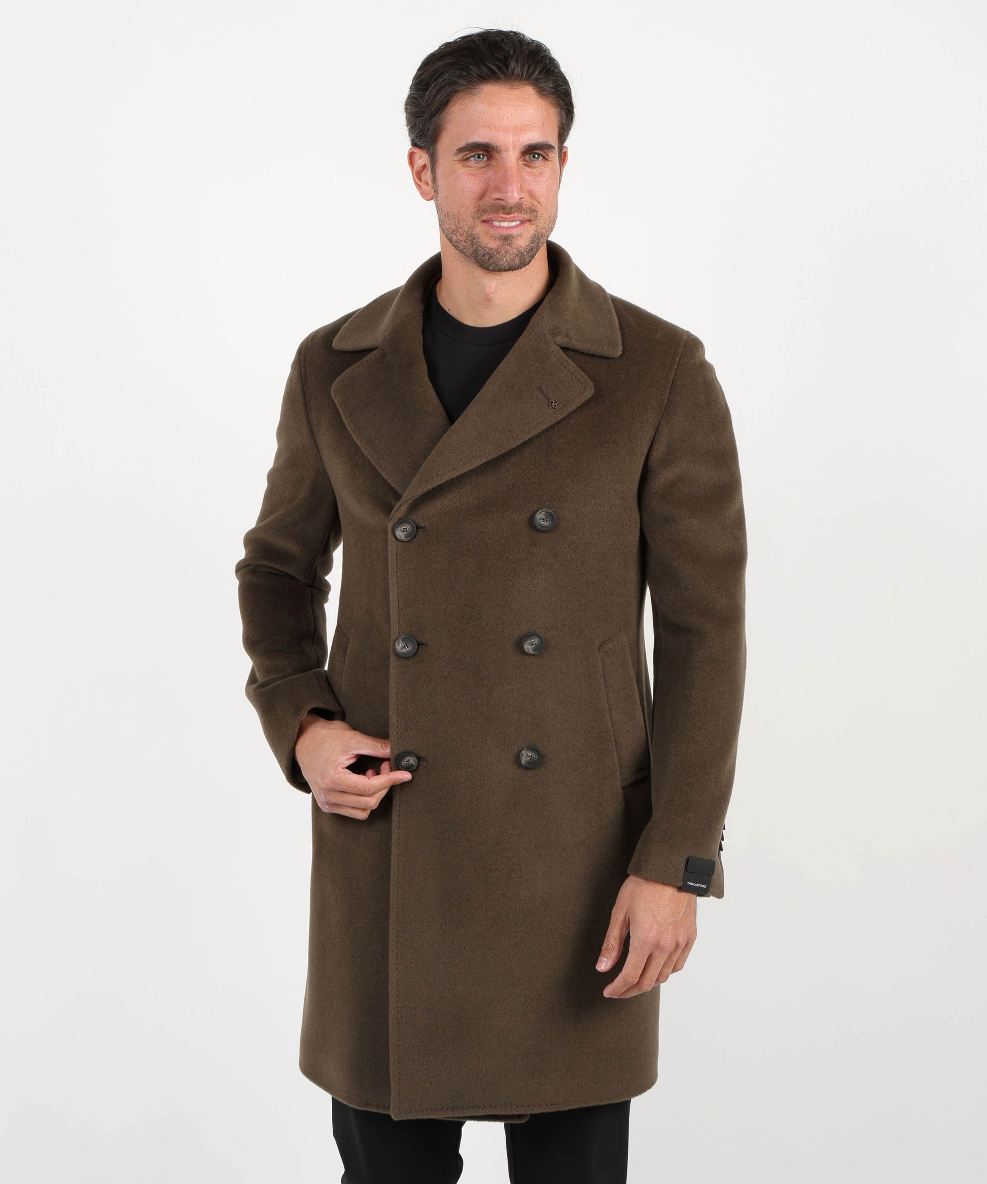 Cappotto uomo sfoderato modello Bruce lungo, doppiopetto a 6 bottoni con 2 occhielli. Dotato di trapunta interna per calore leggero, spalla centrale e martingala sul retro. Design elegante con tasche a pattina, ideale per un look formale e versatile.