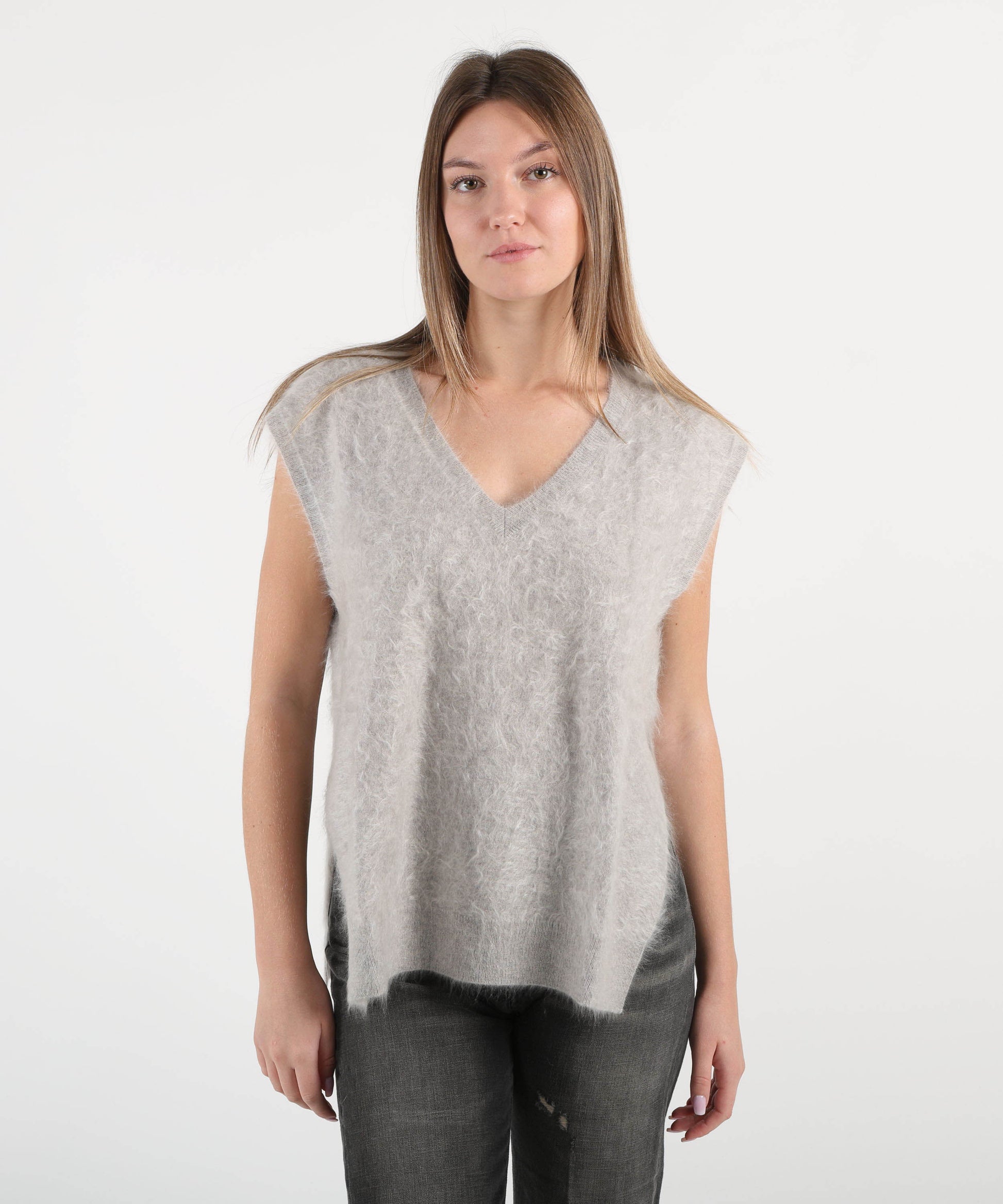 Gilet ampio in lana effetto peloso con scollo e spacchi laterali molto alti. Morbido, confortevole e versatile, perfetto per look autunnali e invernali dal fascino moderno.