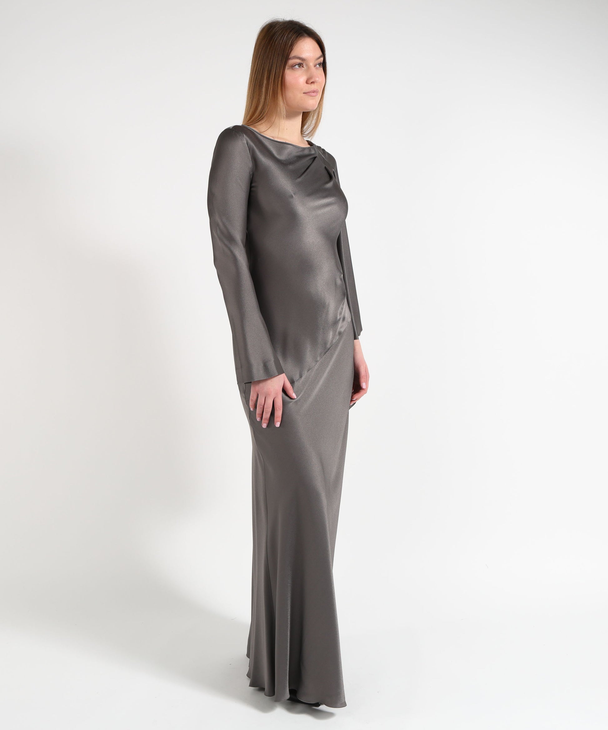 Abito lungo in raso dal taglio fluido, con maniche ampie e silhouette elegante. La lunghezza estesa crea un raffinato piccolo strascico al fondo.