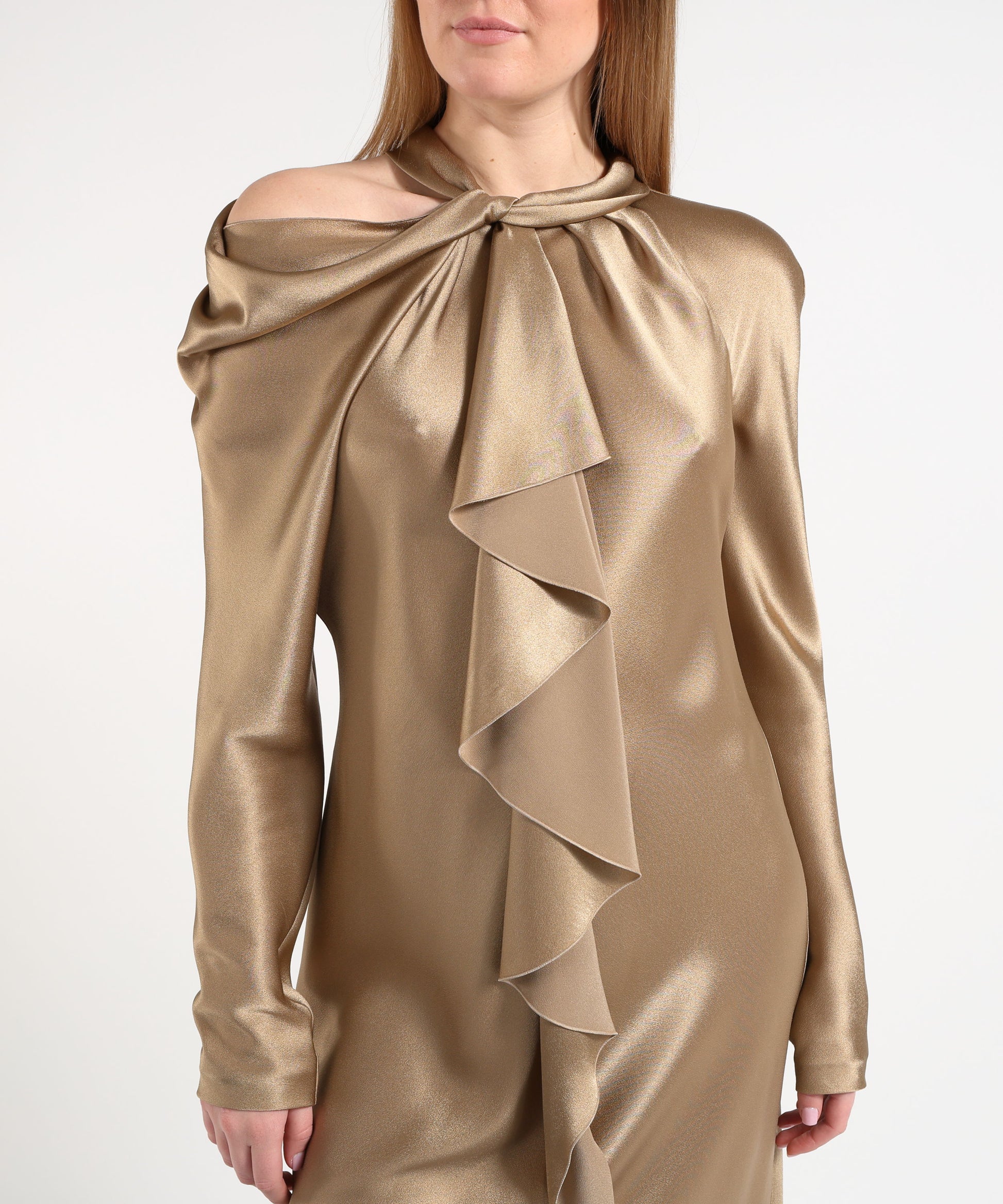 Abito midi in raso dalla linea fluida, arricchito da nodi, drappeggi e ruches che donano un’eleganza romantica e femminile.