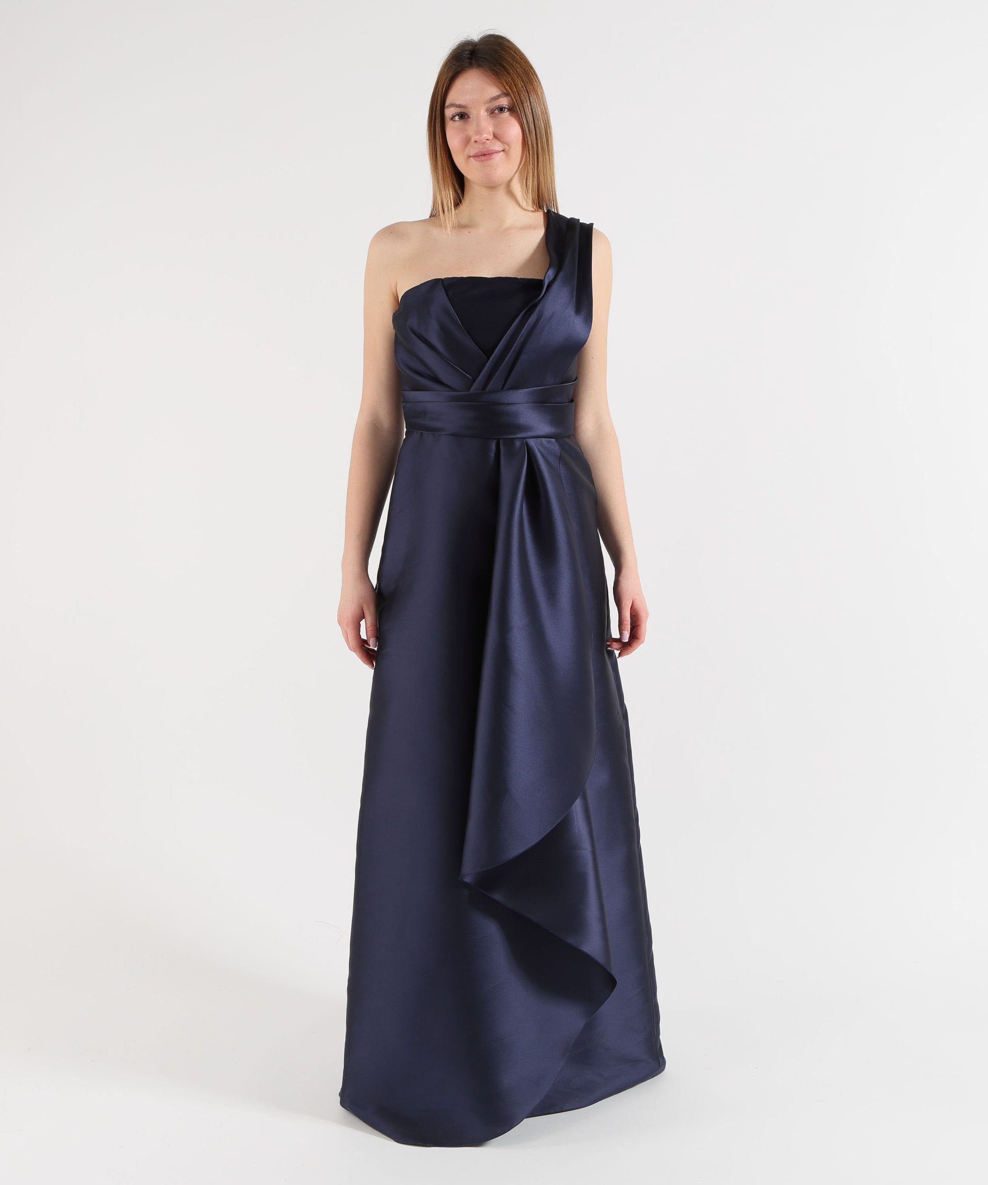 Eleganza senza tempo con l’abito Mikado midi a monospalla, perfetto per cerimonie e cocktail. Il design a campana valorizza la silhouette, mentre la vita drappeggiata aggiunge un tocco sofisticato. La chiusura laterale con zip a scomparsa garantisce una vestibilità impeccabile e discreta. Realizzato in misto seta, combina comfort e stile raffinato.