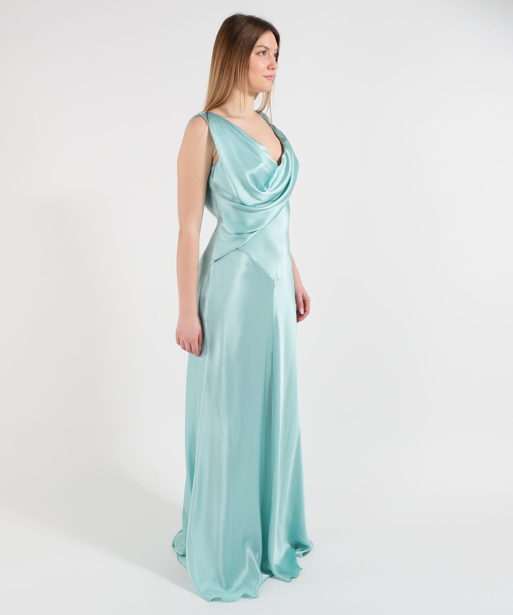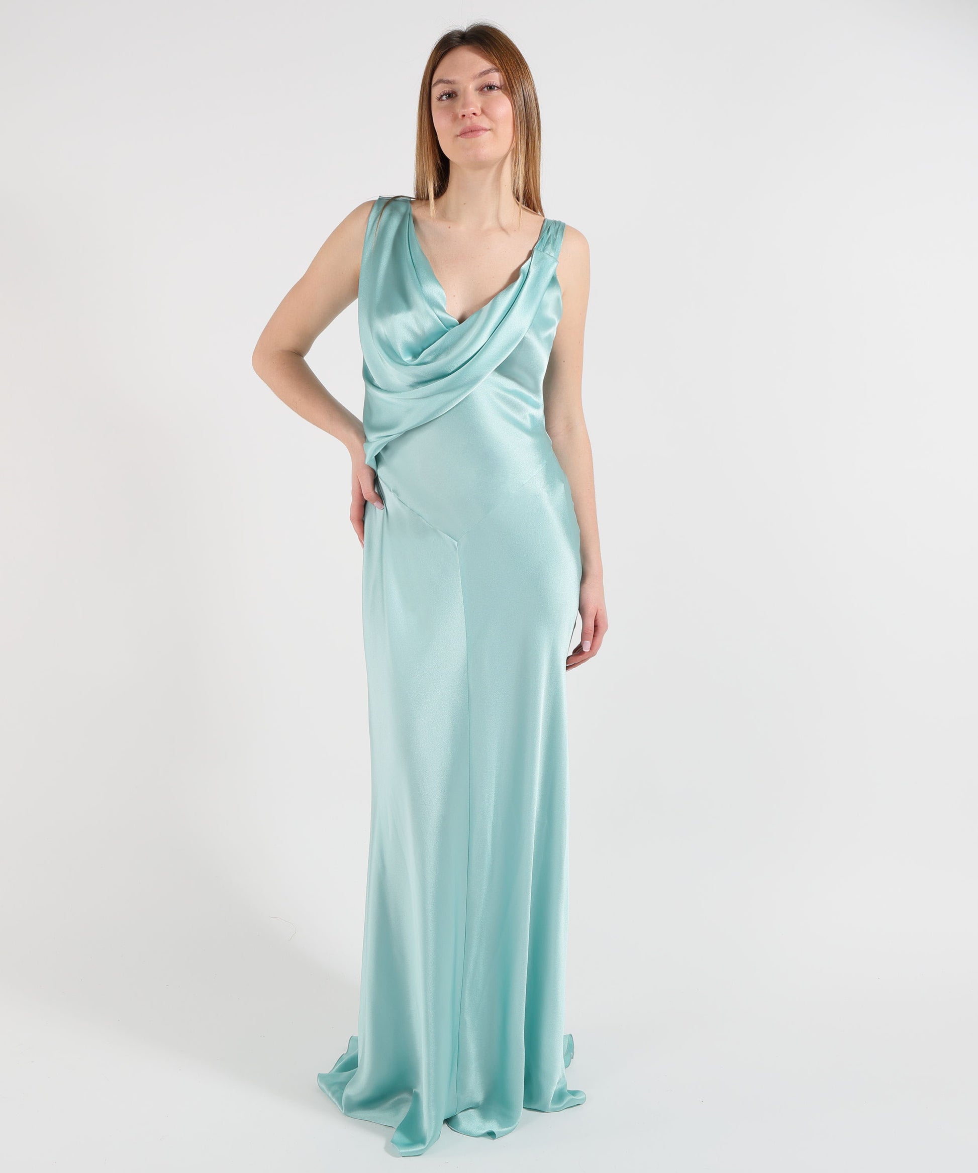 Raffinato e scenografico, questo abito lungo drappeggiato è pensato per valorizzare la silhouette con eleganza. La scollatura a V drappeggiata esalta il décolleté, mentre il design senza maniche dona leggerezza e femminilità. Il fondo con strascico aggiunge movimento e charme, rendendolo perfetto per occasioni speciali. Realizzato in misto seta, offre una texture fluida e sofisticata.