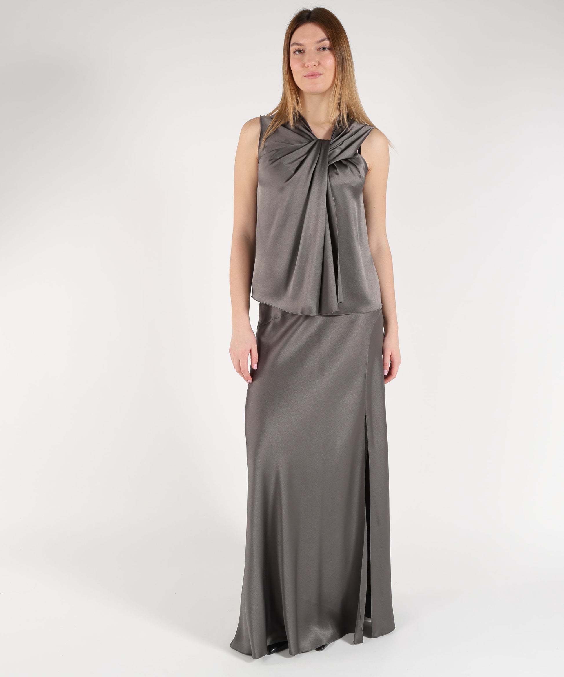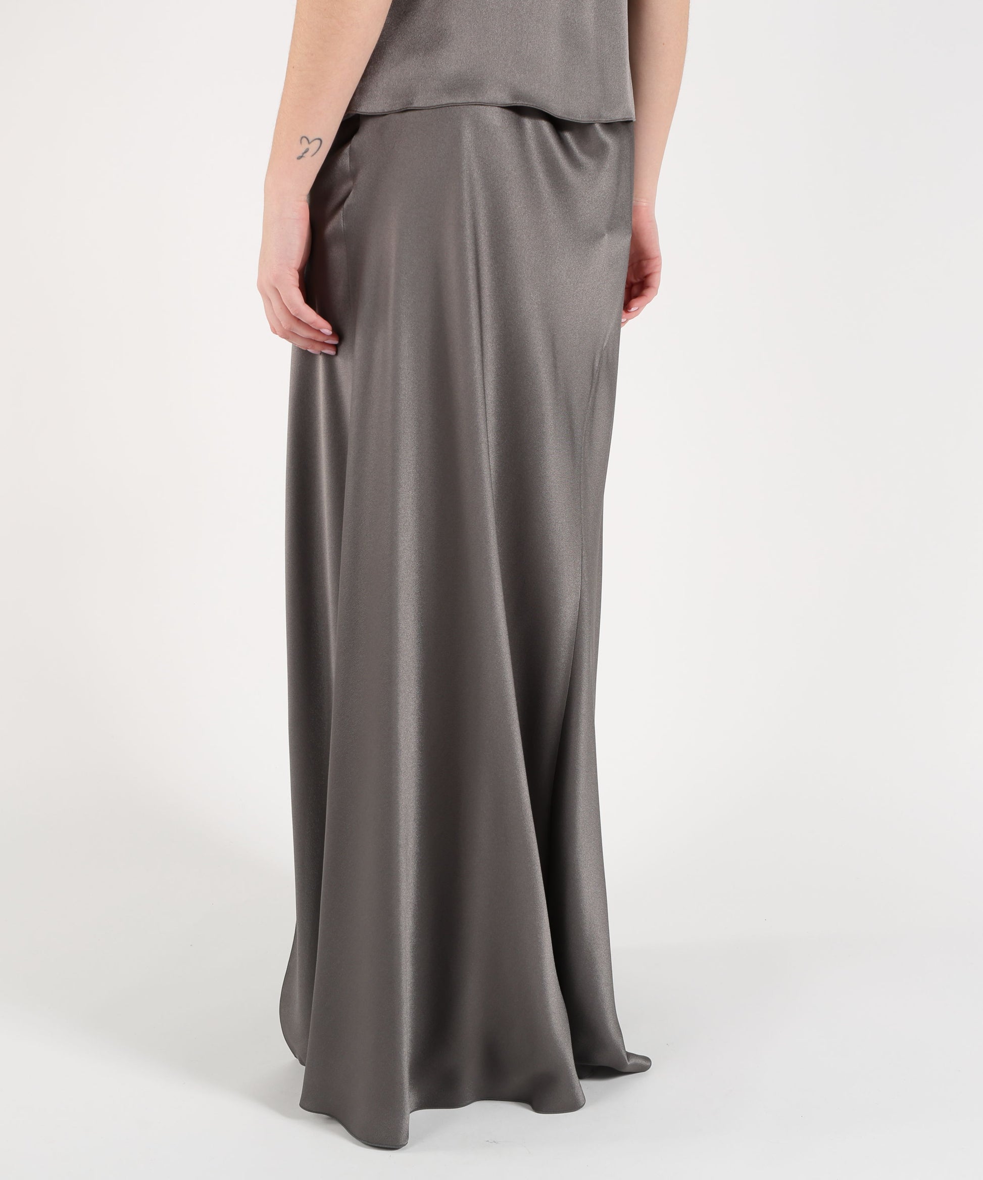 Elegante e sofisticata, questa gonna lunga in satin si distingue per il taglio sbiegato che valorizza il movimento e crea linee fluide. Il profondo spacco sulla sinistra aggiunge un dettaglio sensuale e contemporaneo, perfetto per look da sera o outfit chic.