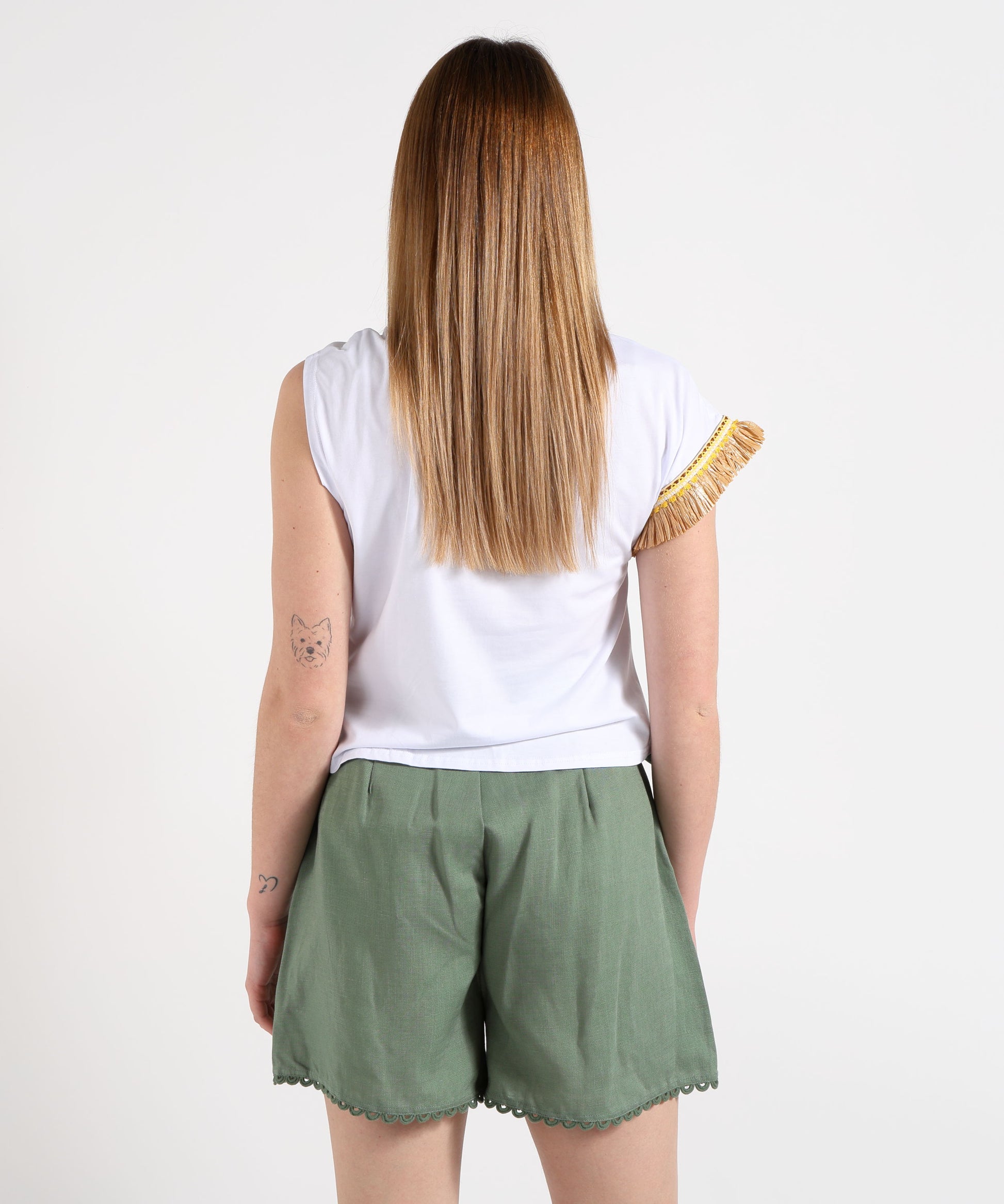Moderna e originale, questa t-shirt bianca da donna presenta maniche asimmetriche: una con dettaglio effetto paglia e l’altra annodata, per un look unico e contemporaneo. Il capo unisce semplicità e stile, perfetto da abbinare a jeans, pantaloni o gonne per outfit casual-chic e femminili. Caratteristiche principali