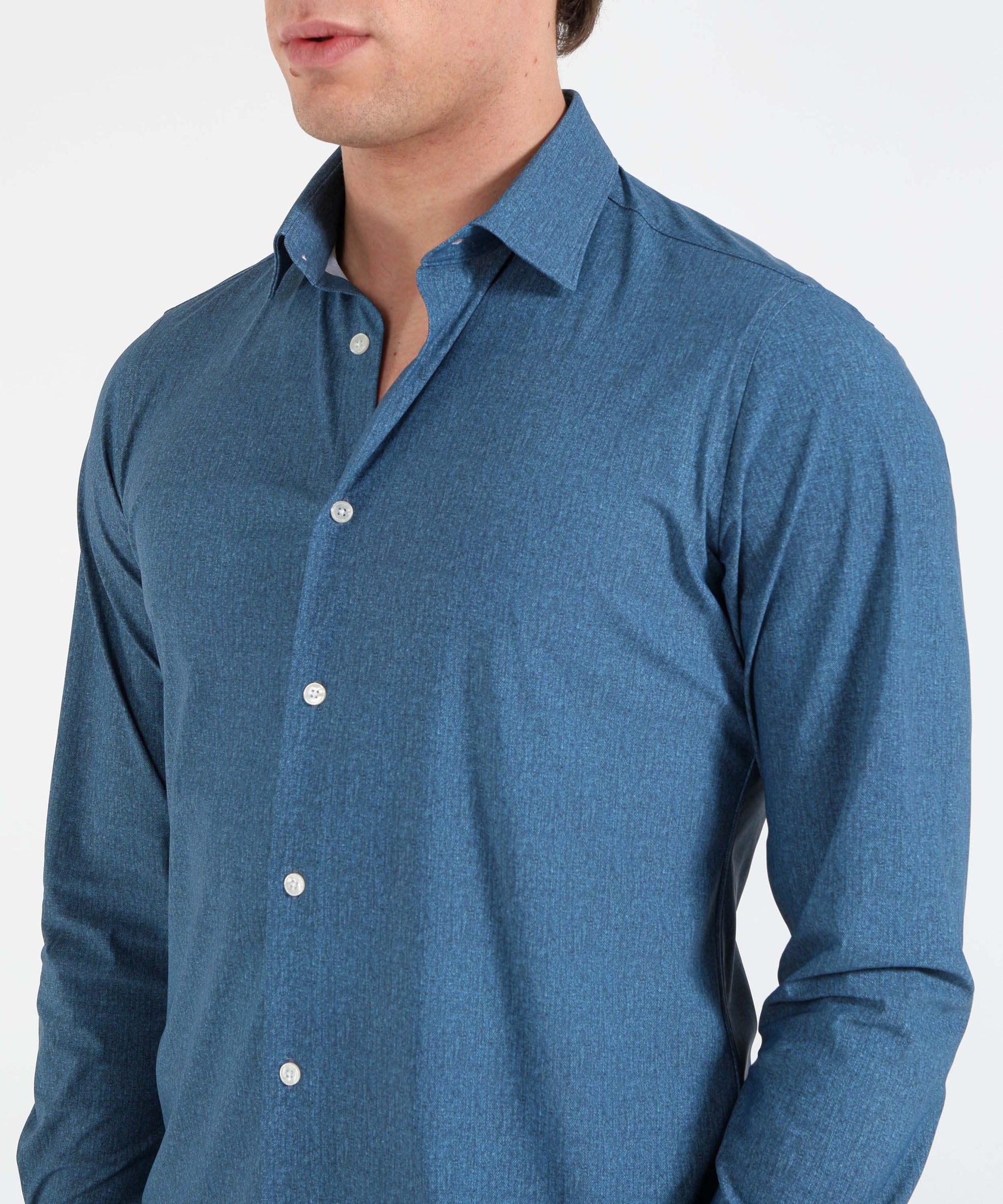 Moderna e versatile, questa camicia effetto denim unisce stile casual e dettagli sartoriali. Il collo Lord valorizza il design classico, mentre il polsino tagliato aggiunge un tocco contemporaneo e distintivo.