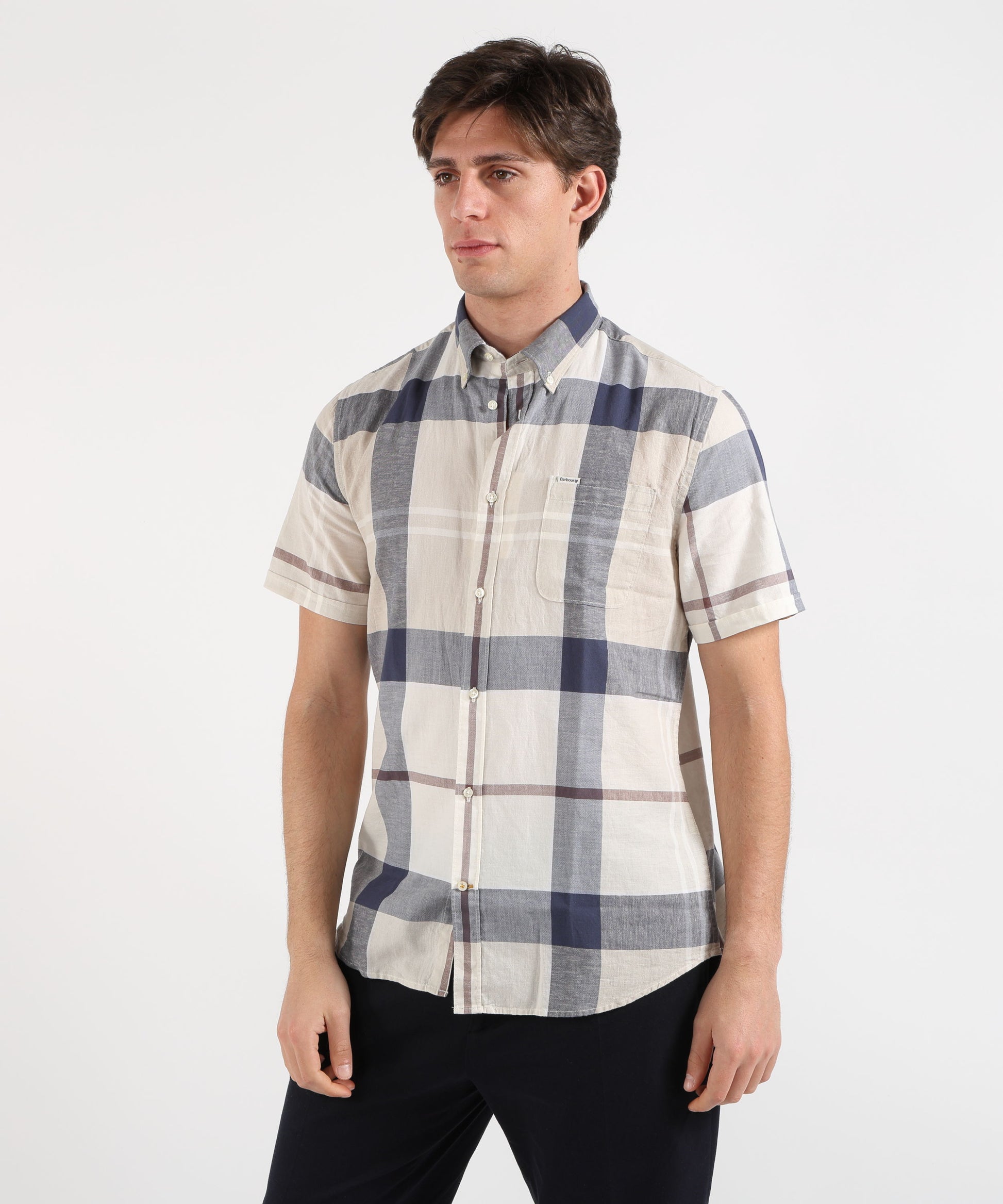 Stile country autentico con fantasia tartan su larga scala. Realizzata in misto cotone e lino per comfort superiore, con colletto button-down e taschino sul petto rifinito con etichetta e scudo Barbour. Perfetta per look casual e raffinati.