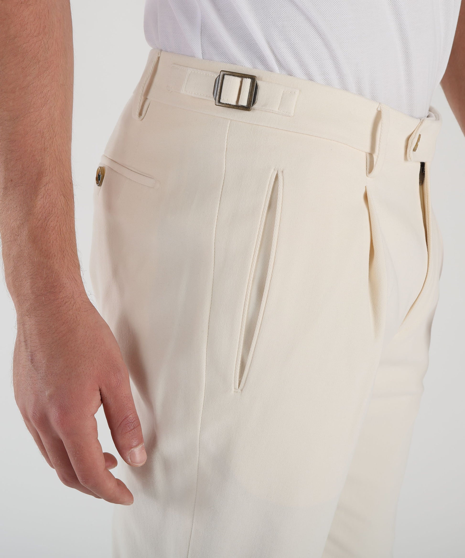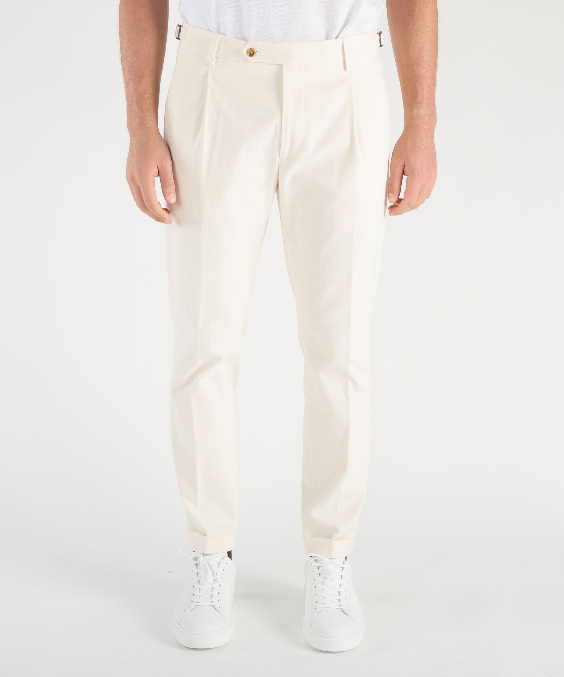 Pantaloni in caldo cotone con pinces frontale, fibbiette laterali sul cinturino e fondo con risvolto. Eleganti e versatili, perfetti per look smart casual e professionali.