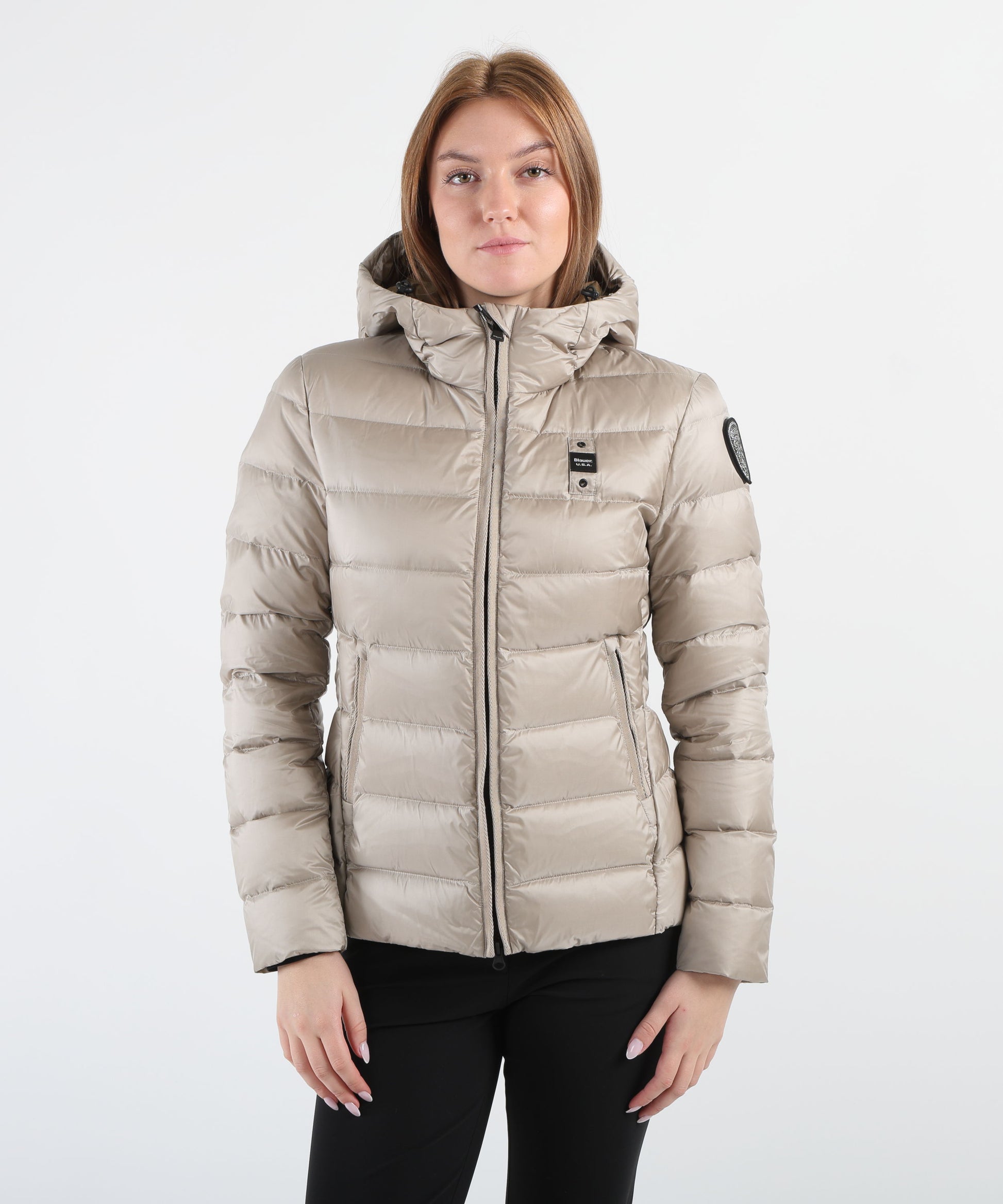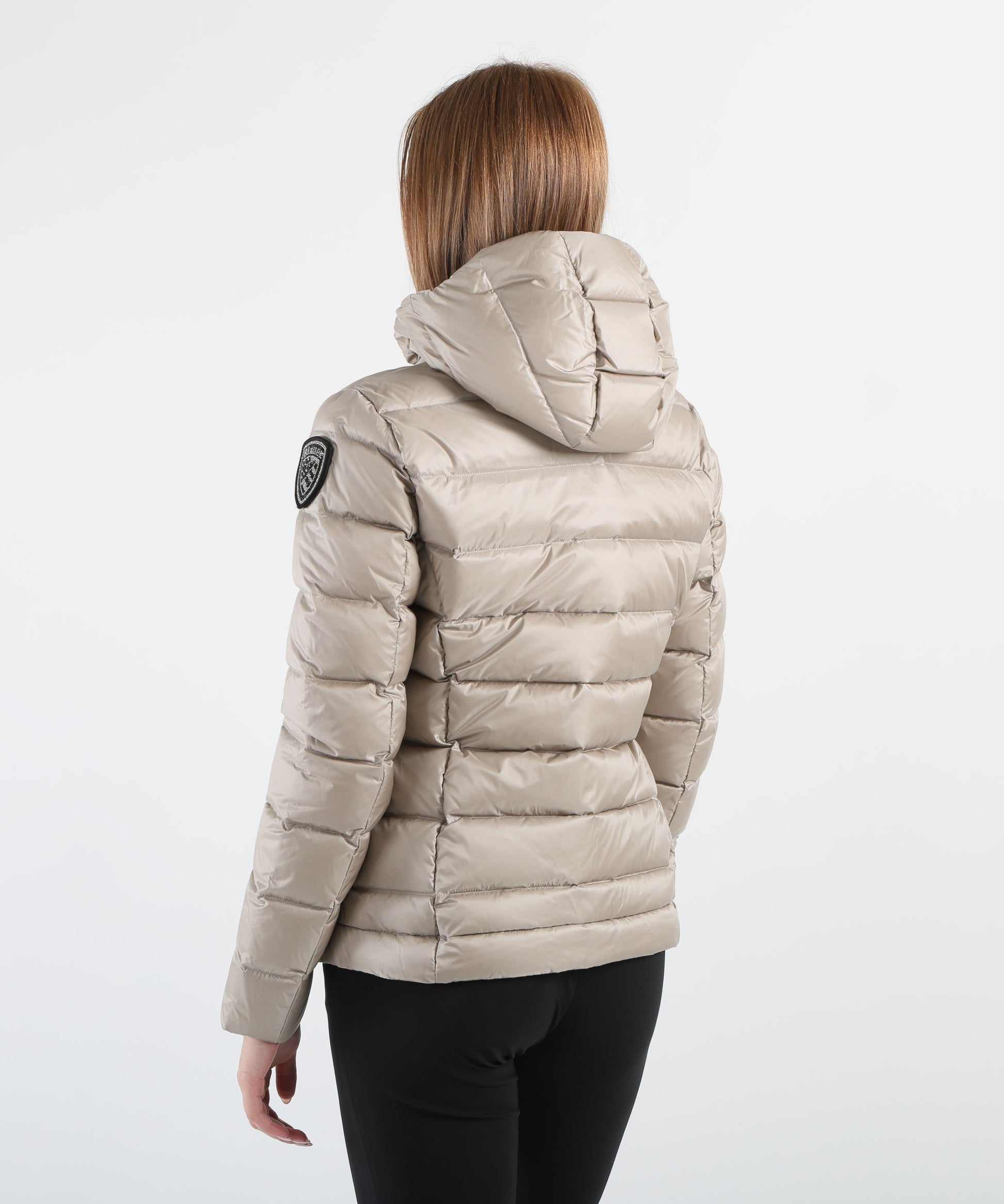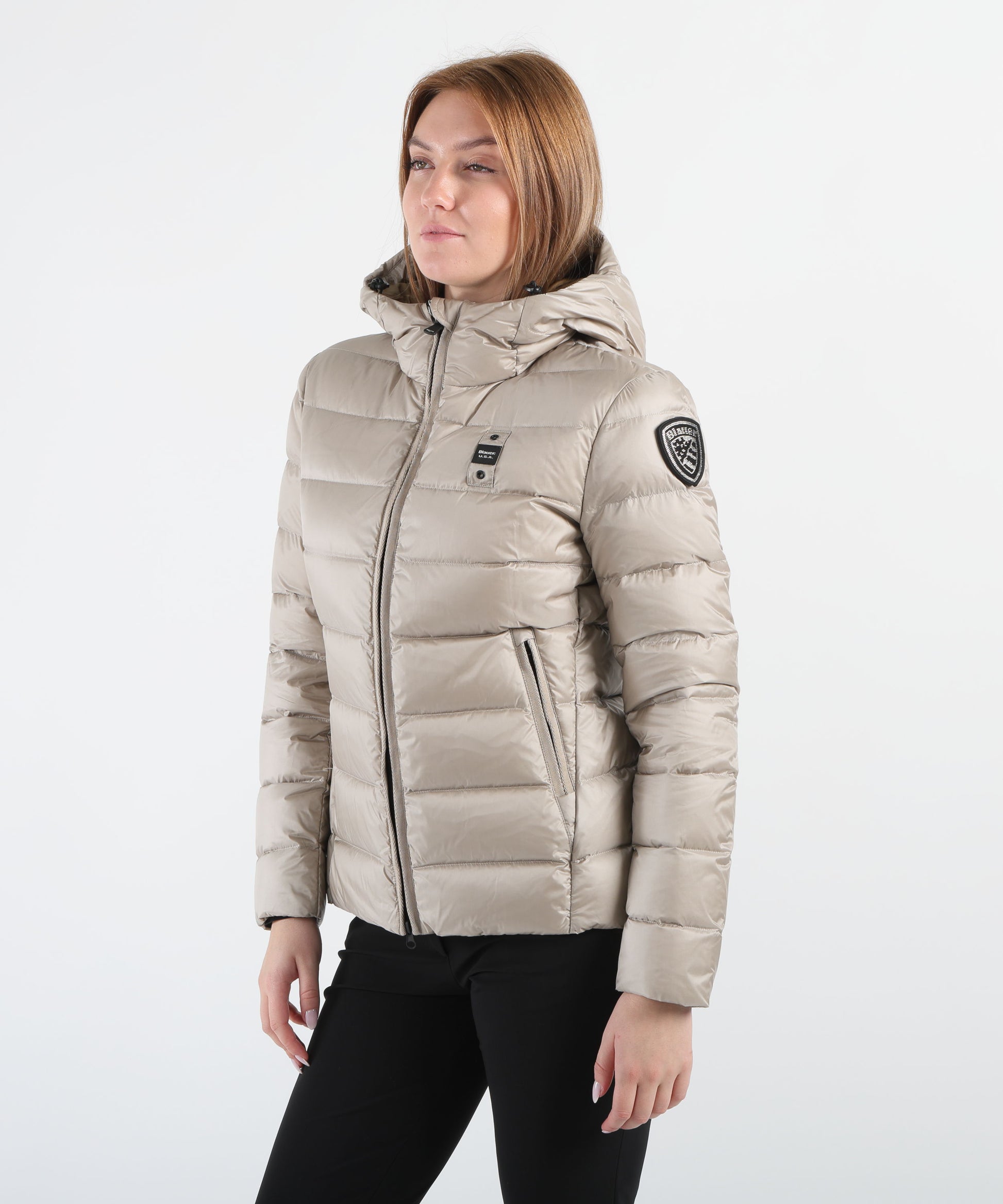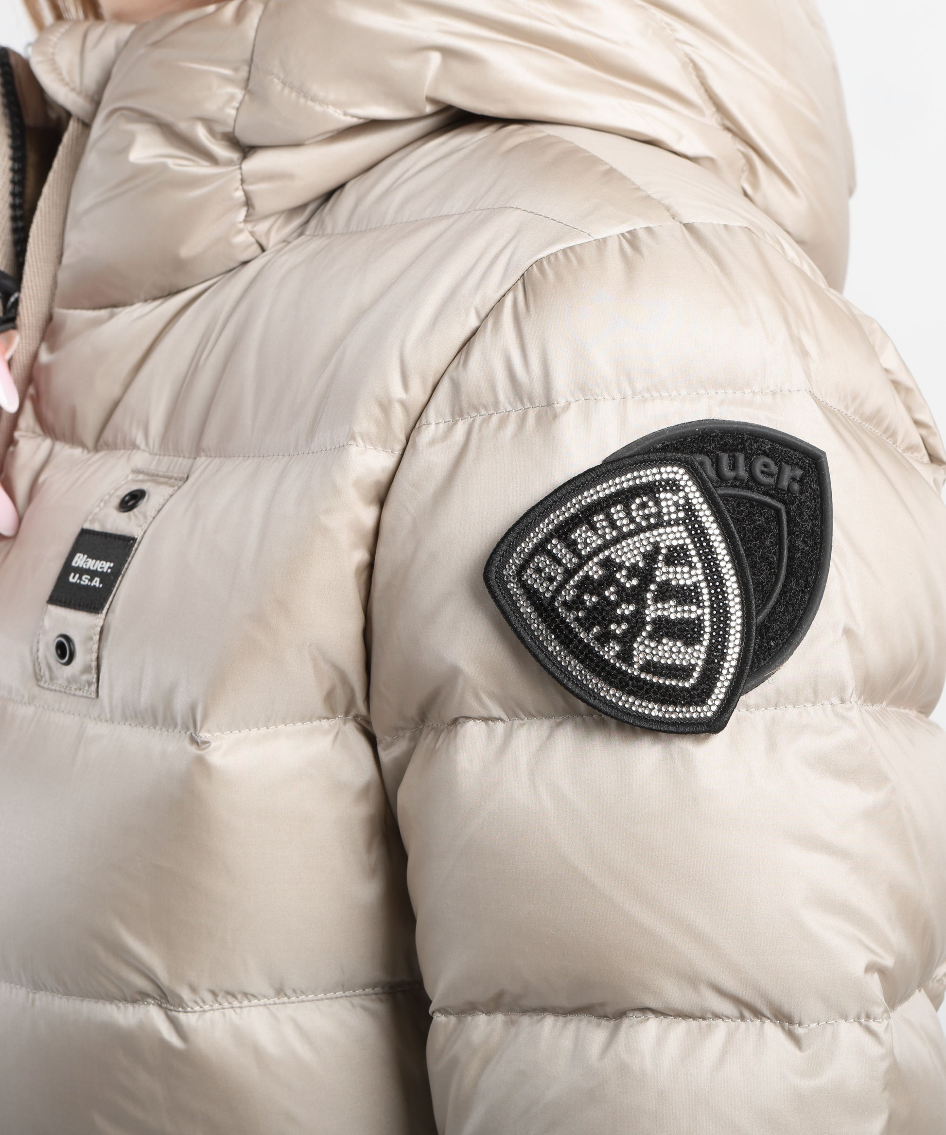 Piumino idrorepellente trapuntato a righe orizzontali con imbottitura leggera in piuma 90/10. Cappuccio fisso con coulisse, tasche esterne e interne con zip, patch glitterato con logo, perfetto per look caldi e fashion.