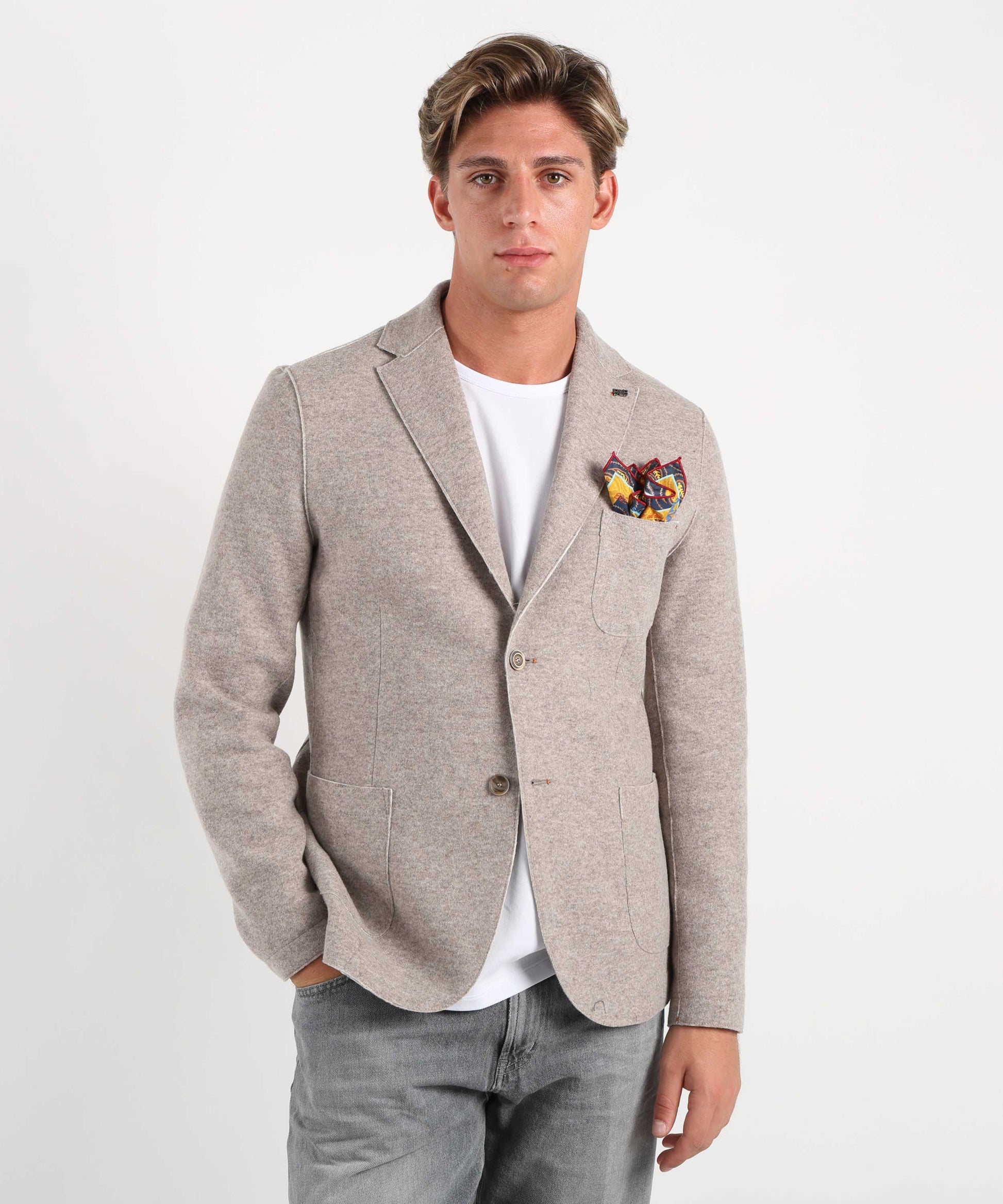 Giacca dal taglio a vivo con chiusura a due bottoni, tre tasche a toppa e rever classico, ideale per un look elegante e contemporaneo.