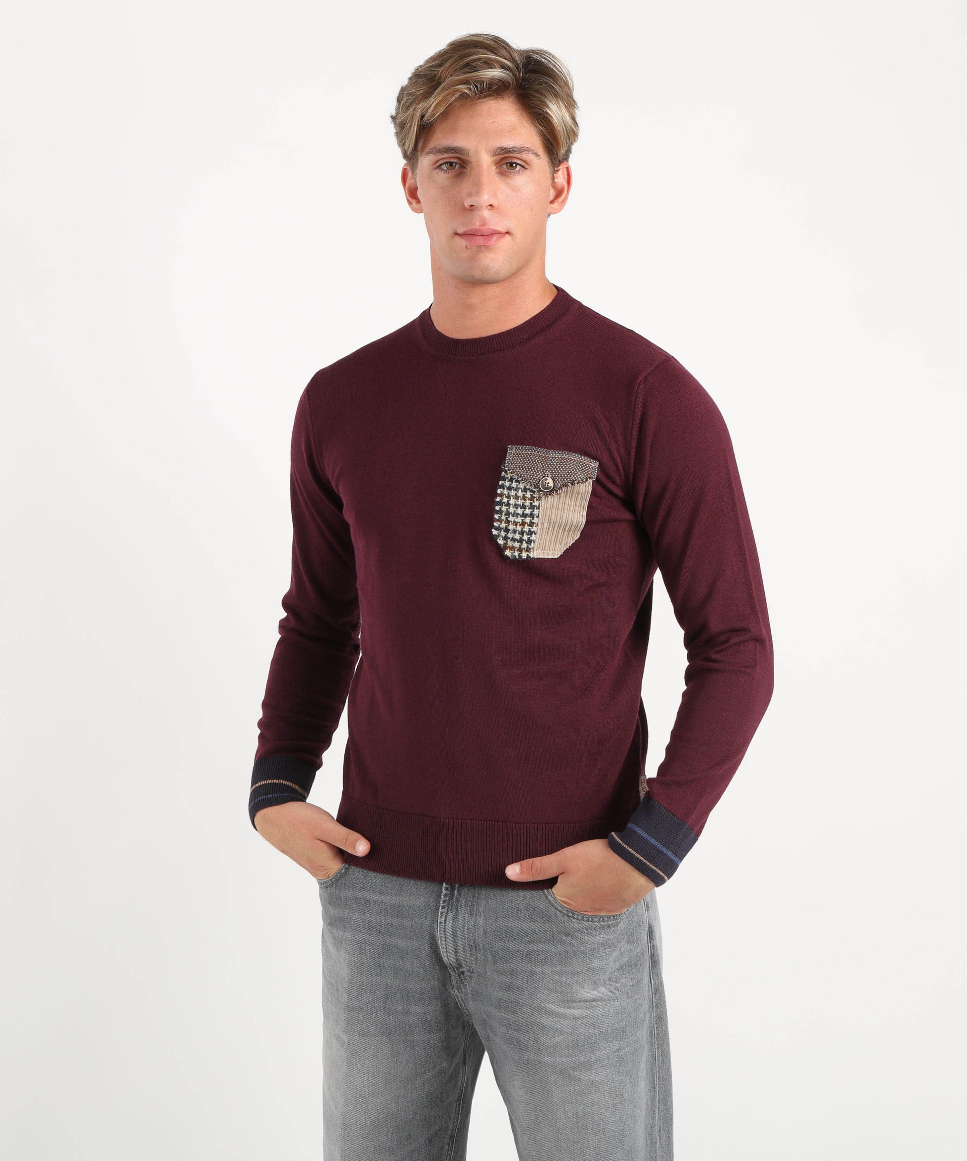 Maglia girocollo con tasca applicata a fantasia – Un capo casual e versatile che unisce praticità e stile. Realizzata in tessuto morbido e confortevole, presenta una linea regolare con girocollo classico e maniche lunghe. La particolarità è la tasca applicata con fantasia, che aggiunge un dettaglio originale e distintivo al design essenziale. Facile da abbinare a jeans o pantaloni, è perfetta per un look quotidiano che non rinuncia al tocco di personalità.