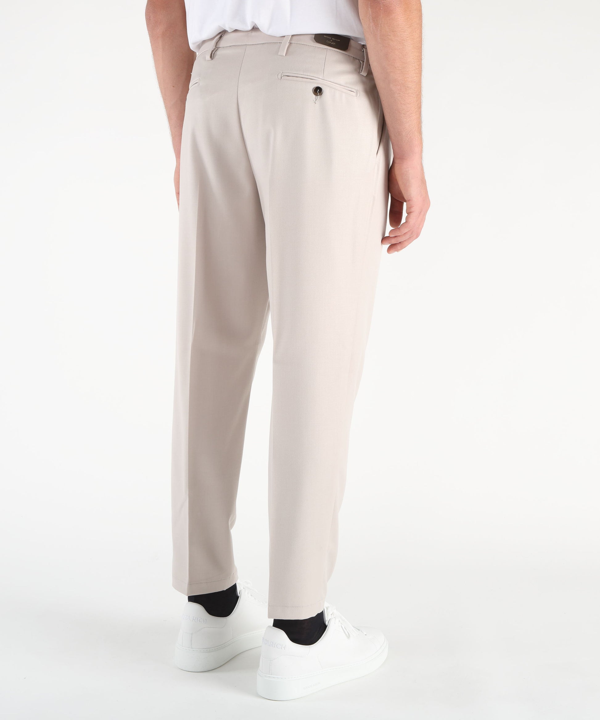 Pantaloni linea over con piega baciata sul davanti ed elastici laterali sul cinturino. Tasche America funzionali, comfort e stile casual contemporaneo.