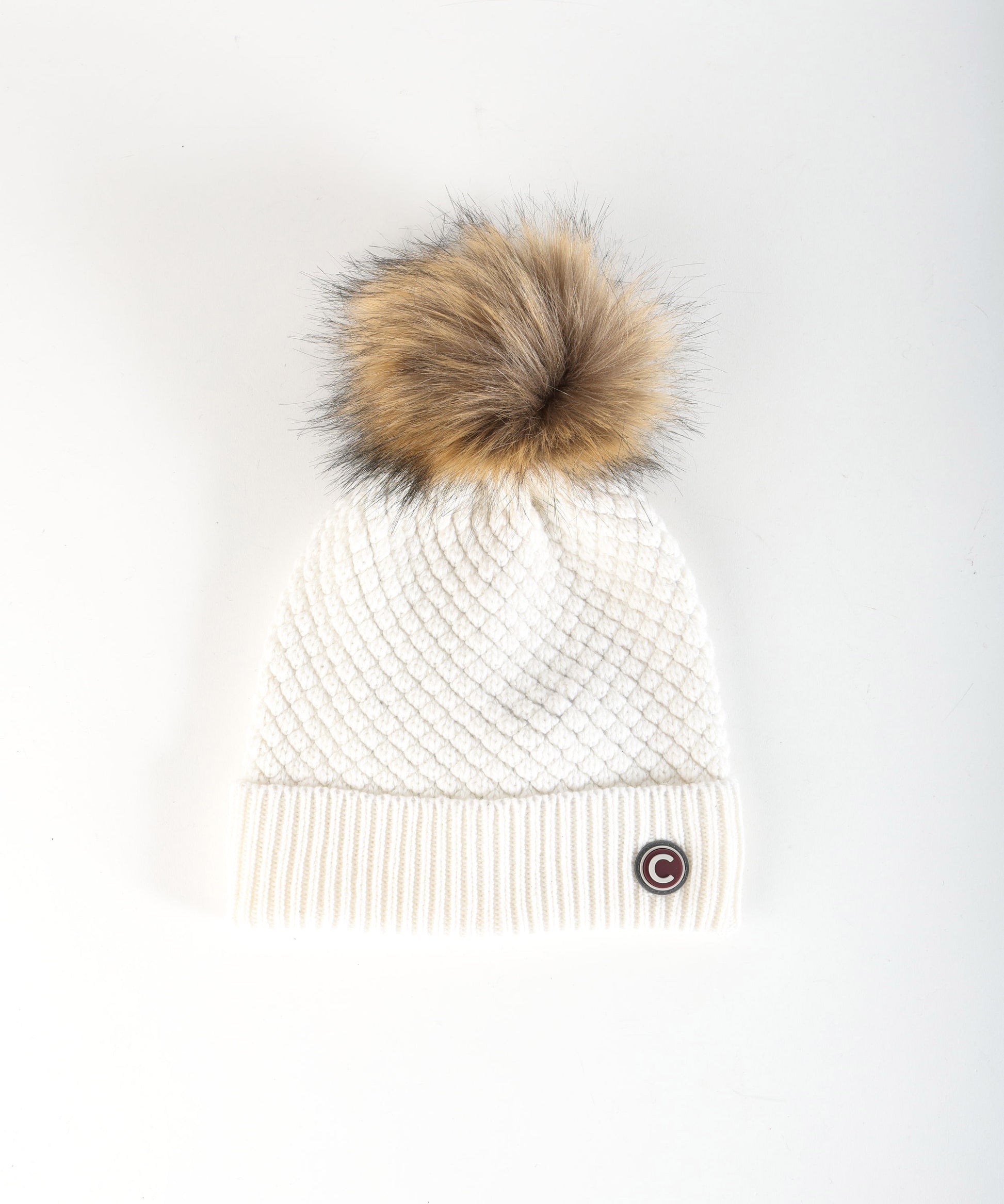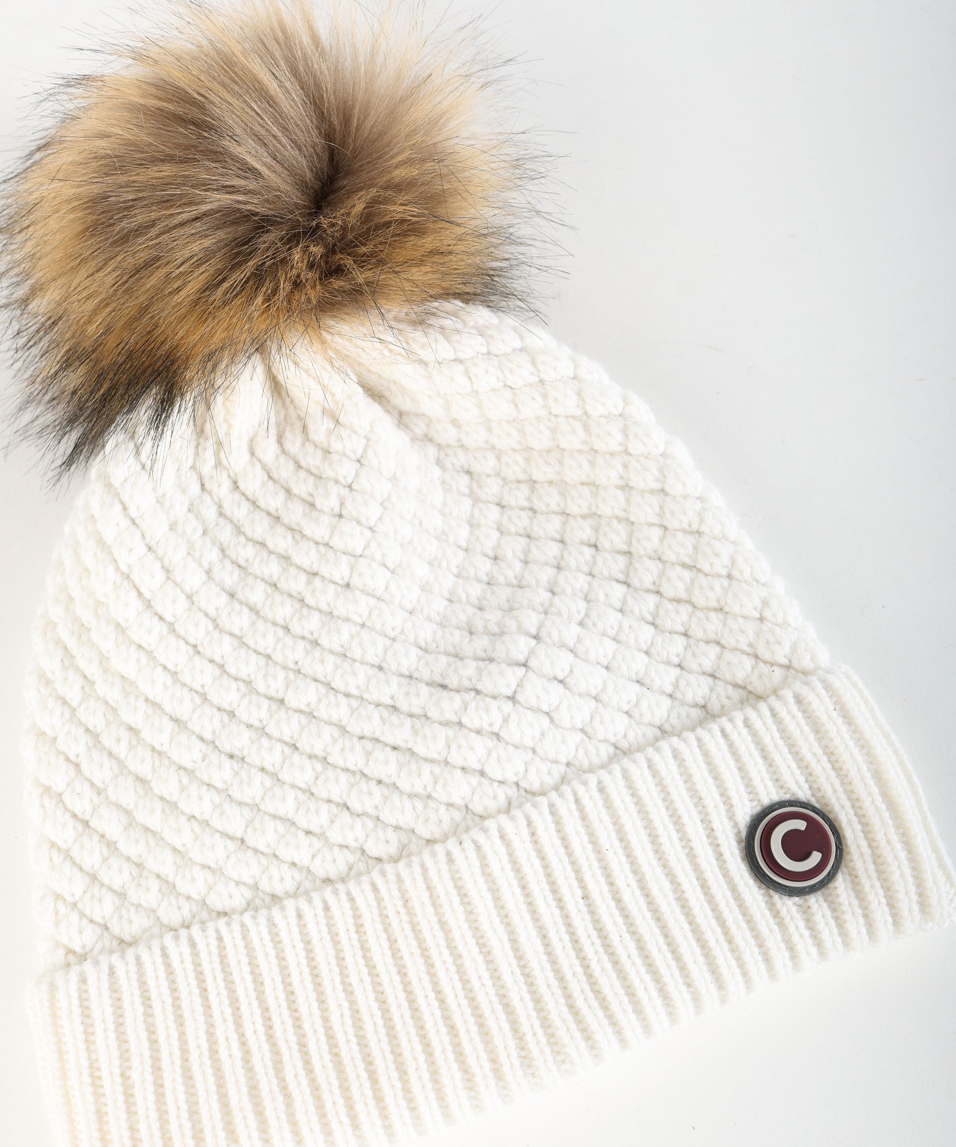 Con pompon in pelliccia sintetica, risvolto a costine e grana di riso, questo