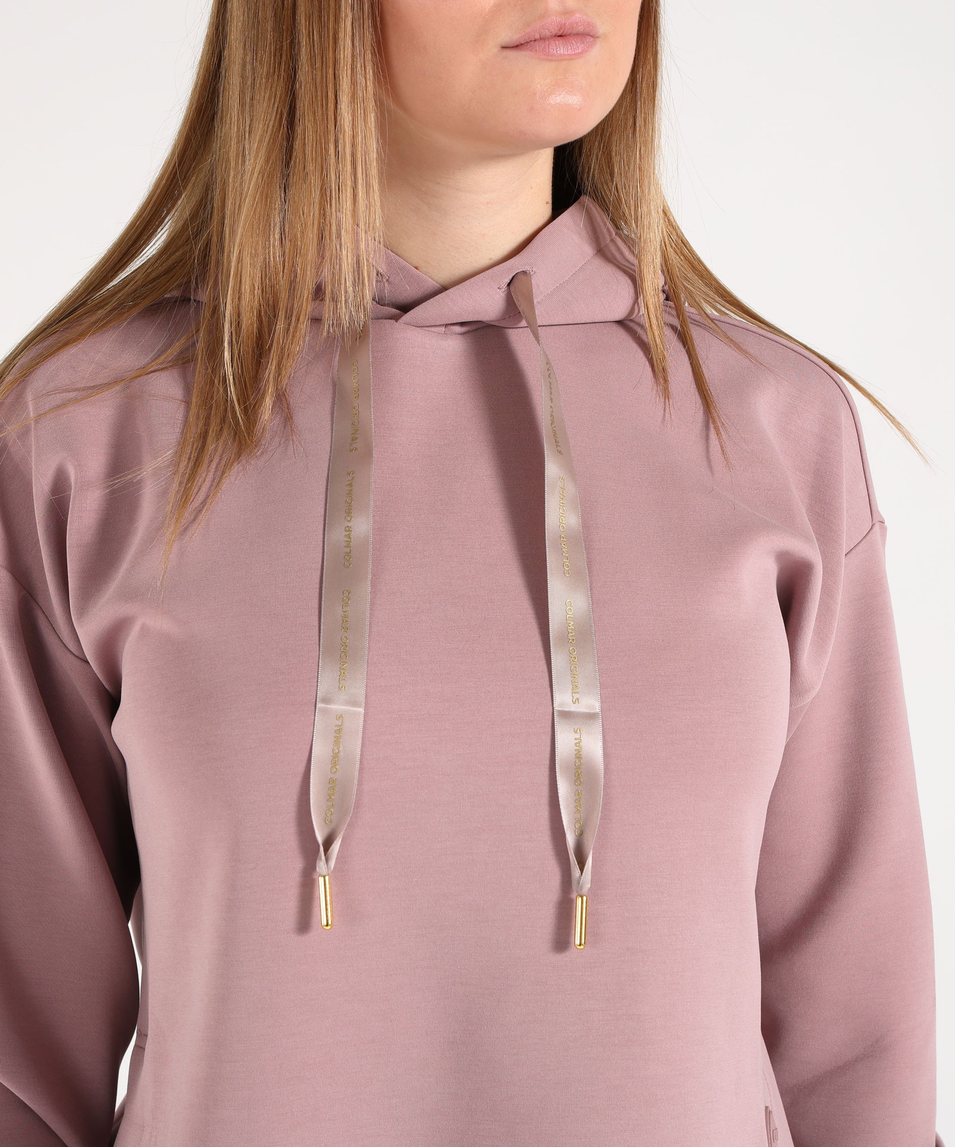 Felpa donna Colmar in cotone modal, con cappuccio regolabile, spacchetti laterali e logo sul fondo. Fit over crop con spalla scesa, comoda e femminile, perfetta per look casual e sportivi.