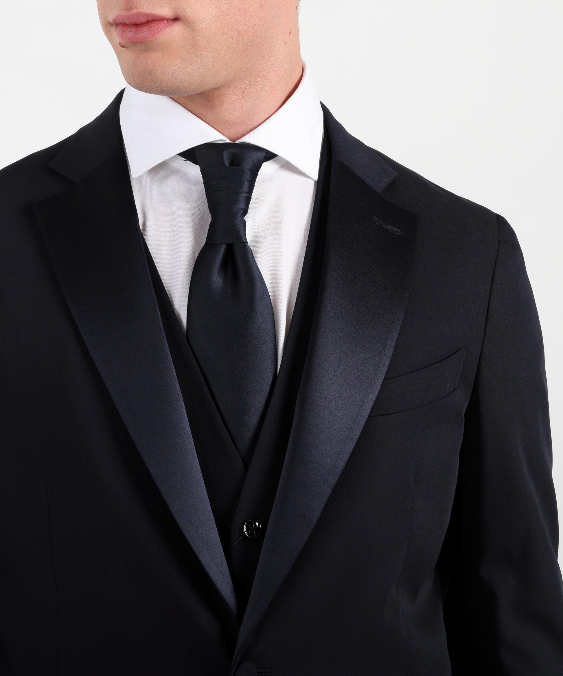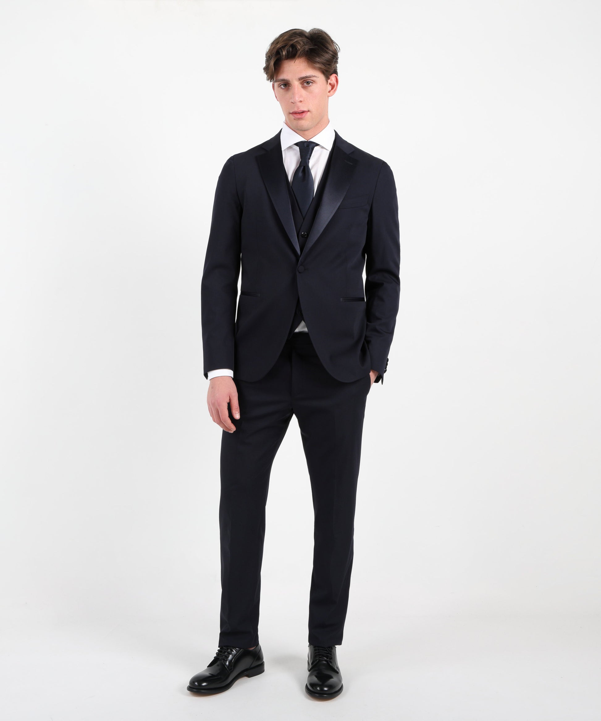 Abito tre pezzi dal taglio moderno Drop 8, composto da giacca, gilet e pantaloni coordinati. La giacca monopetto presenta un elegante rever classico rifinito in raso, chiusura a 1 bottone foderato, tasche a filo e spacchi laterali per una vestibilità comoda e slanciata. Il gilet a 4 bottoni completa il look con un tocco formale e raffinato. I pantaloni sono realizzati con linea pulita senza pences e tasche all’americana, per un design essenziale e contemporaneo. Ideale per cerimonie, eventi eleganti o look sartoriali da occasione.