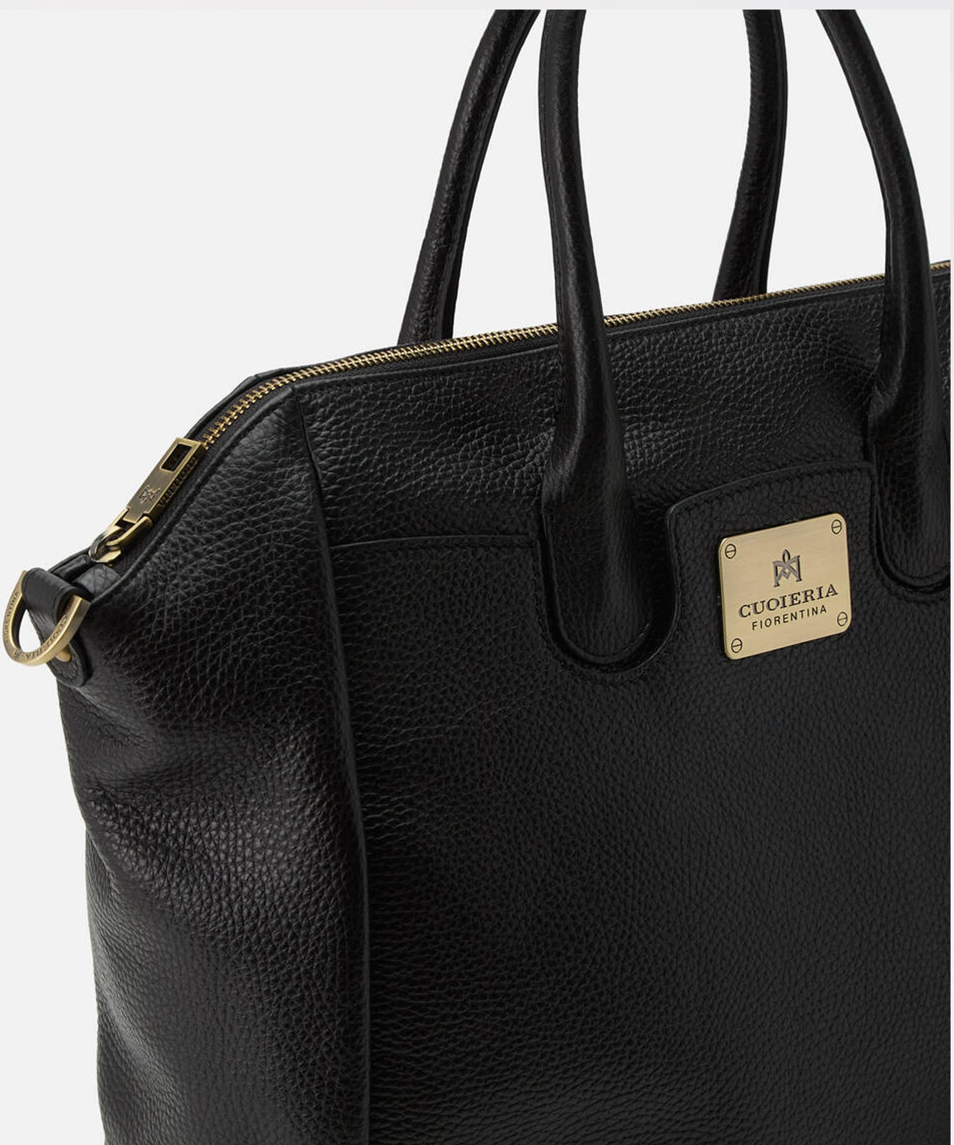 Tote bag Bella Selleria in pelle di vitello pieno fiore con dettagli artigianali e targhetta logata effetto ottone. Ampio scomparto interno, tracolla rimovibile e tasca esterna con bottone magnetico, perfetta per look quotidiani eleganti.