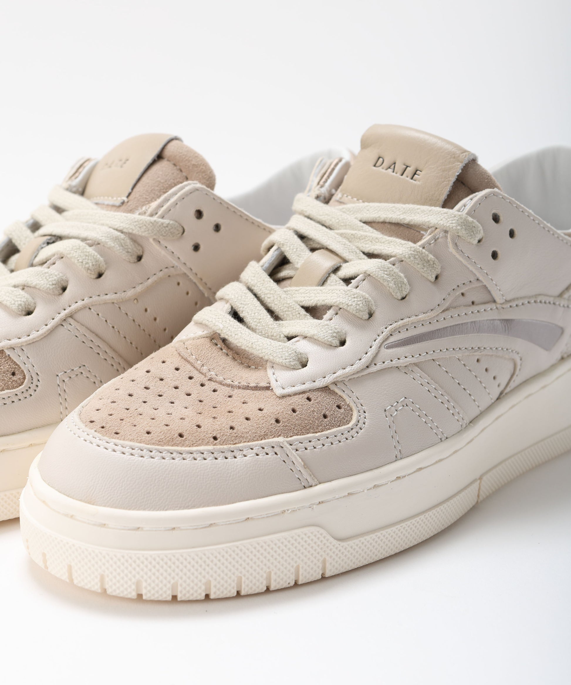 Le sneakers D.A.T.E. combinano design contemporaneo e comfort quotidiano, ideali per look casual e urbani. Realizzate in pelle premium con inserti in camoscio, presentano un collarino laminato oro rosa che aggiunge un tocco di stile sofisticato. La punta traforata migliora la traspirazione, mentre la linguetta con scritta D.A.T.E. e il logo quadrato impresso lateralmente completano il design iconico.