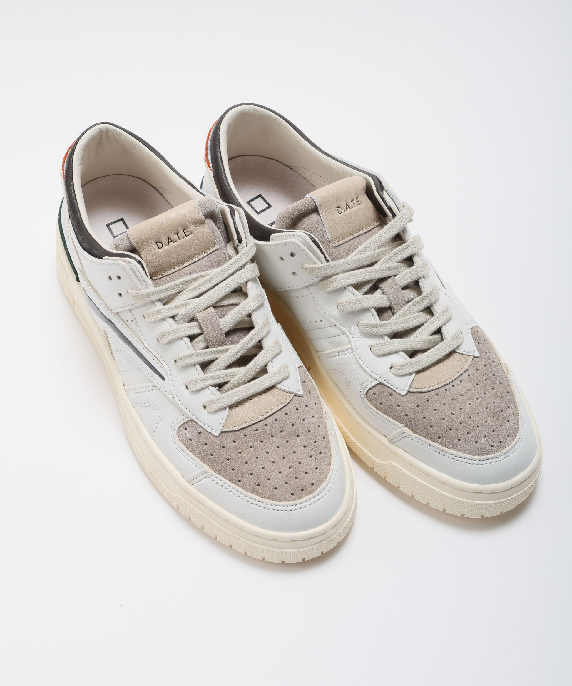 Queste sneakers uniscono stile contemporaneo e comfort quotidiano. La tomaia in pelle bianca e camoscio tortora presenta una punta traforata per garantire traspirabilità, mentre i dettagli in pelle e camoscio arancio e verde scuro sul tallone donano un tocco distintivo e moderno.