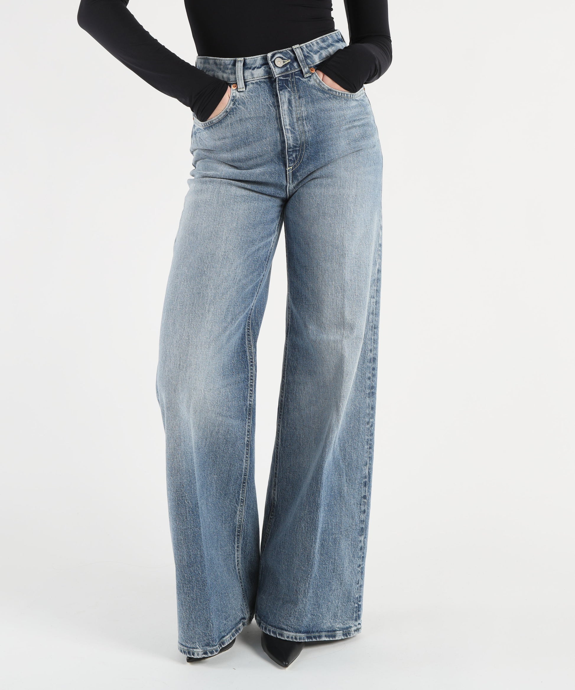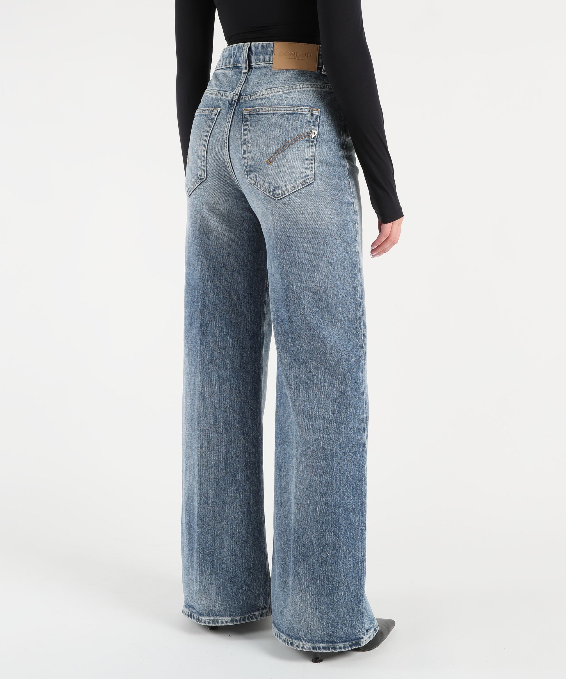 Wide leg fit con vita regolare e gamba a palazzo, in denim stretch riciclato 12 ½ oz. Lavaggio chiaro vintage pulito e logo Dondup, per un look casual chic e contemporaneo.