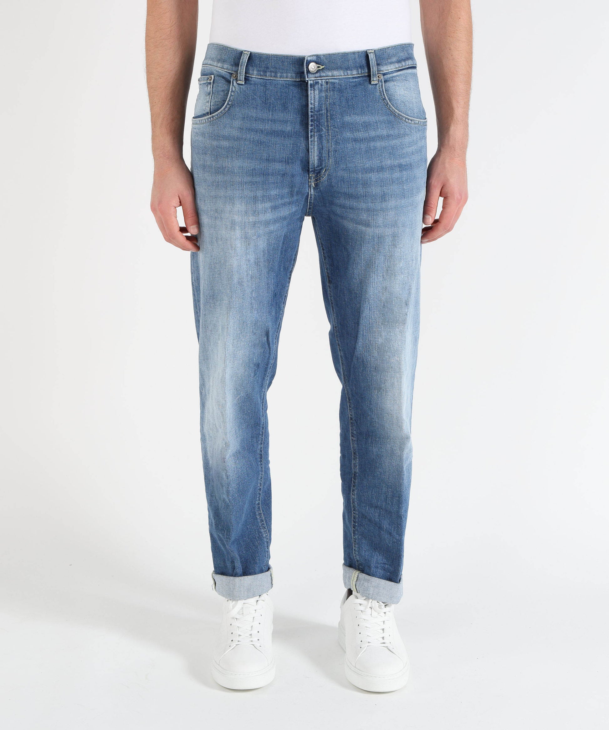 Jeans modello Ervin a cinque tasche in denim stone washed medio chiaro, loose fit con fondo 18 cm. Comodi e casual, perfetti per look quotidiani e contemporanei.