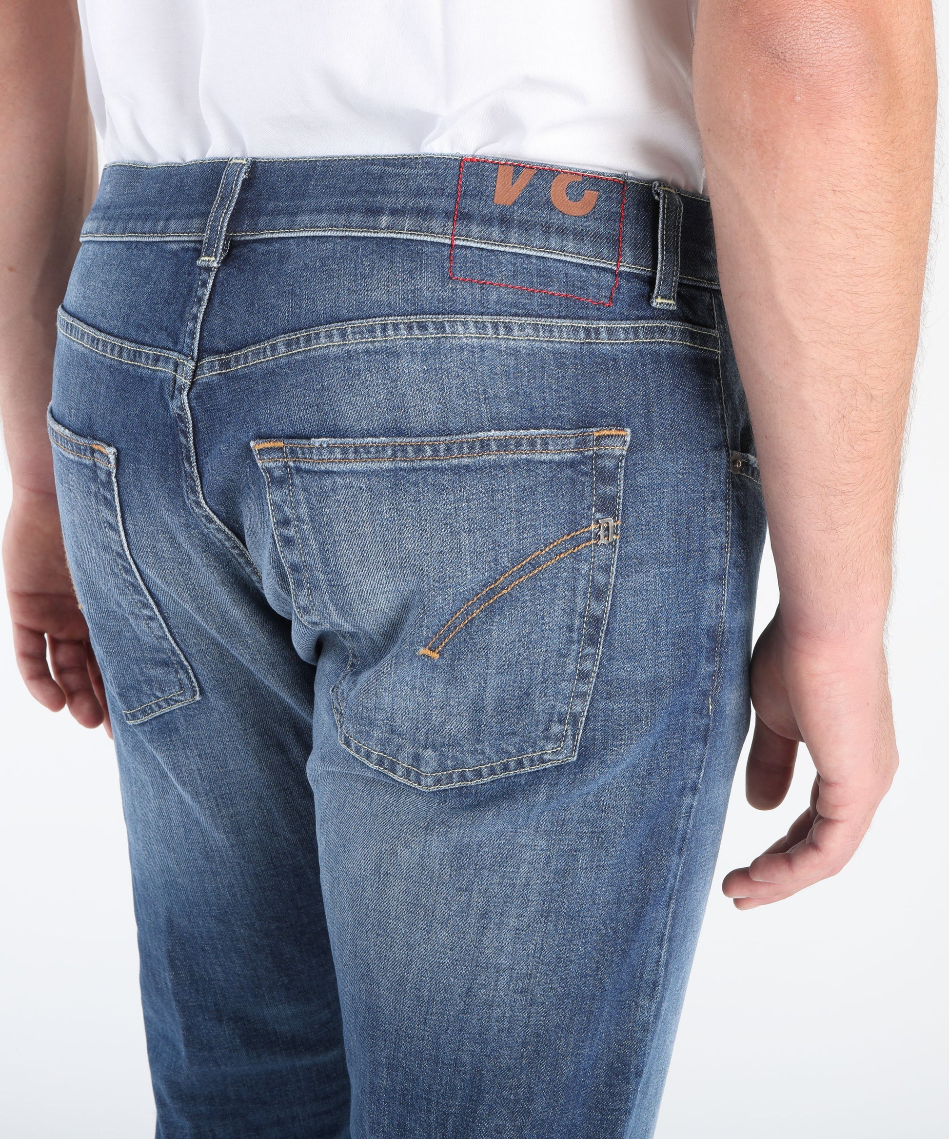Jeans Dian Dondup a cinque tasche con vestibilità carrot slim e vita bassa, realizzati in denim stretch responsabile con lavaggio medio chiaro e dettagli rammendati.