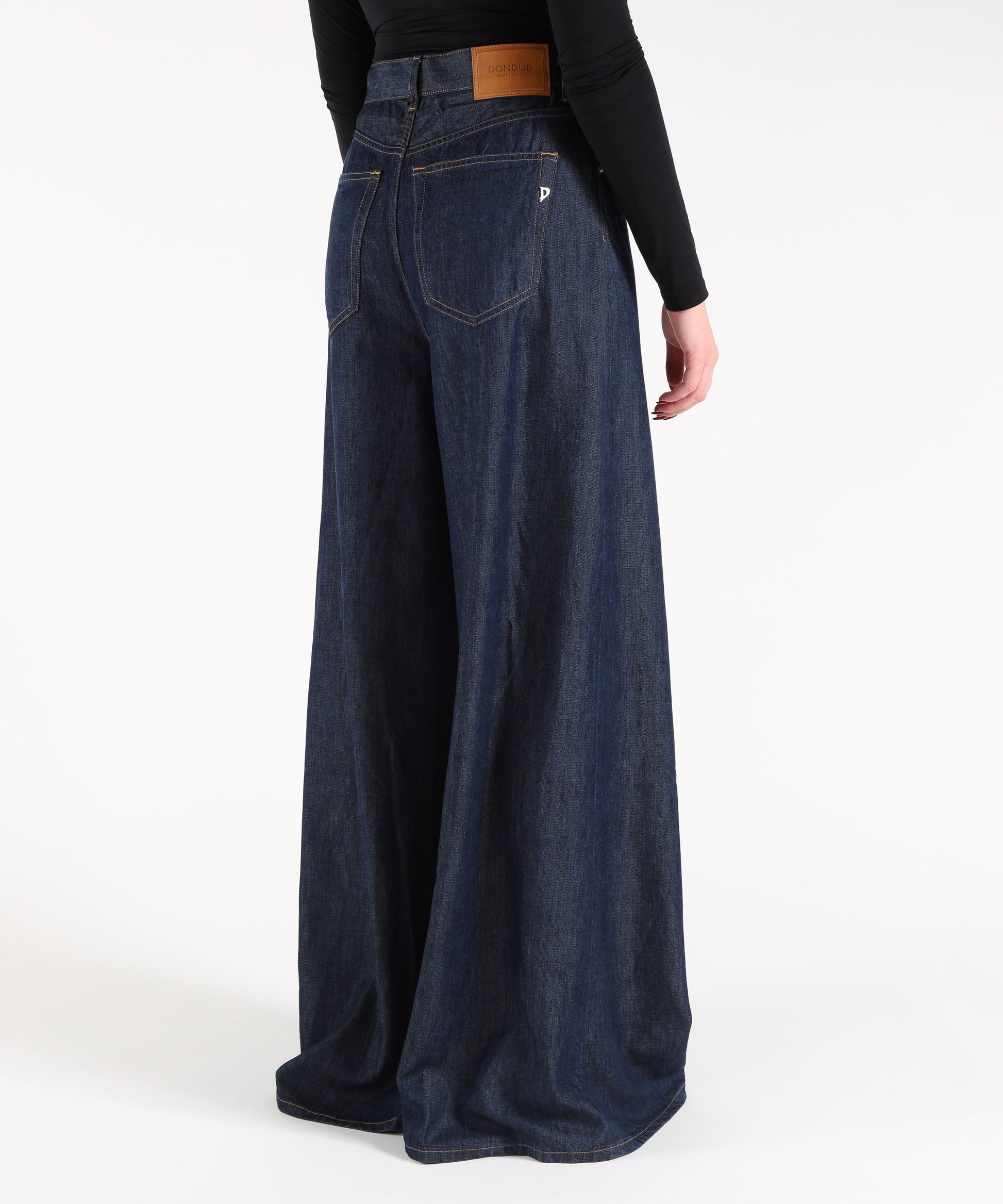 Jeans donna Dondup Maggie wide leg a gamba palazzo con pince sul davanti, vita regolare e cinque tasche. Denim lyocell blu 9 oz scuro pulito con logo distintivo, perfetti per look casual chic.