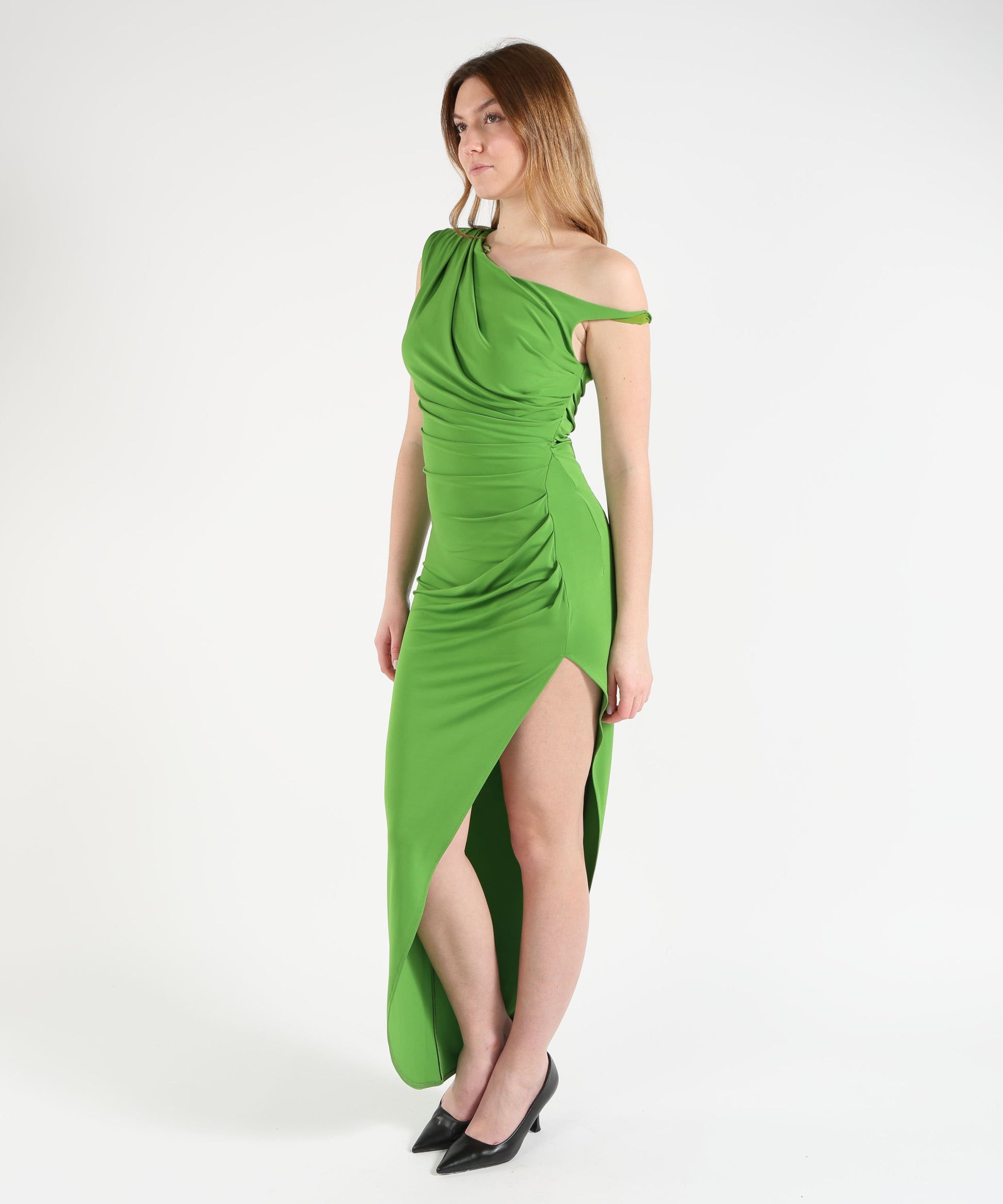 Abito monospalla in jersey crêpe aderente con spallina imbottita, mezzaluna in metallo dorato, gonna asimmetrica con spacco laterale, slip in tulle elasticizzato e zip invisibile laterale. Elegante e seducente.