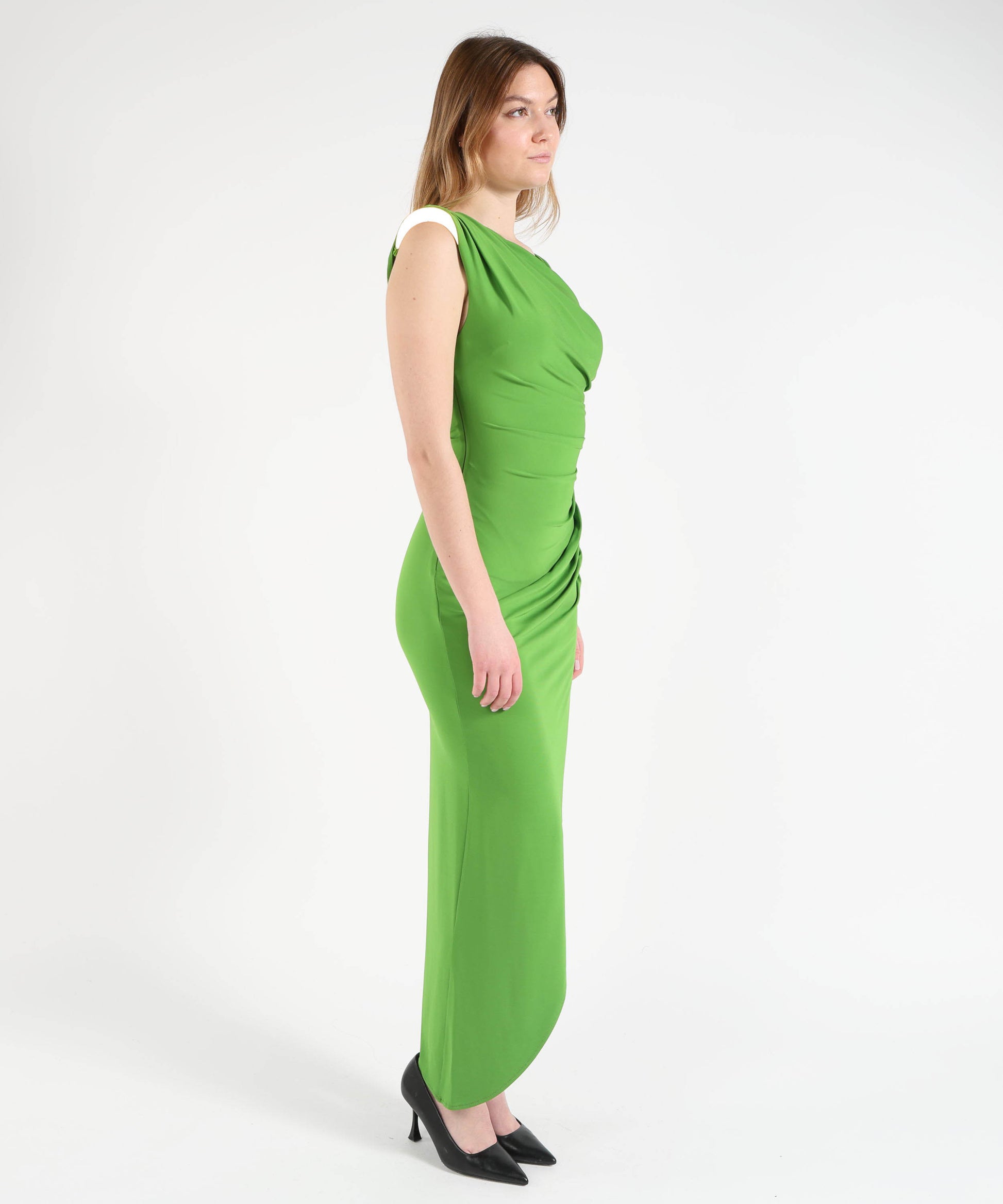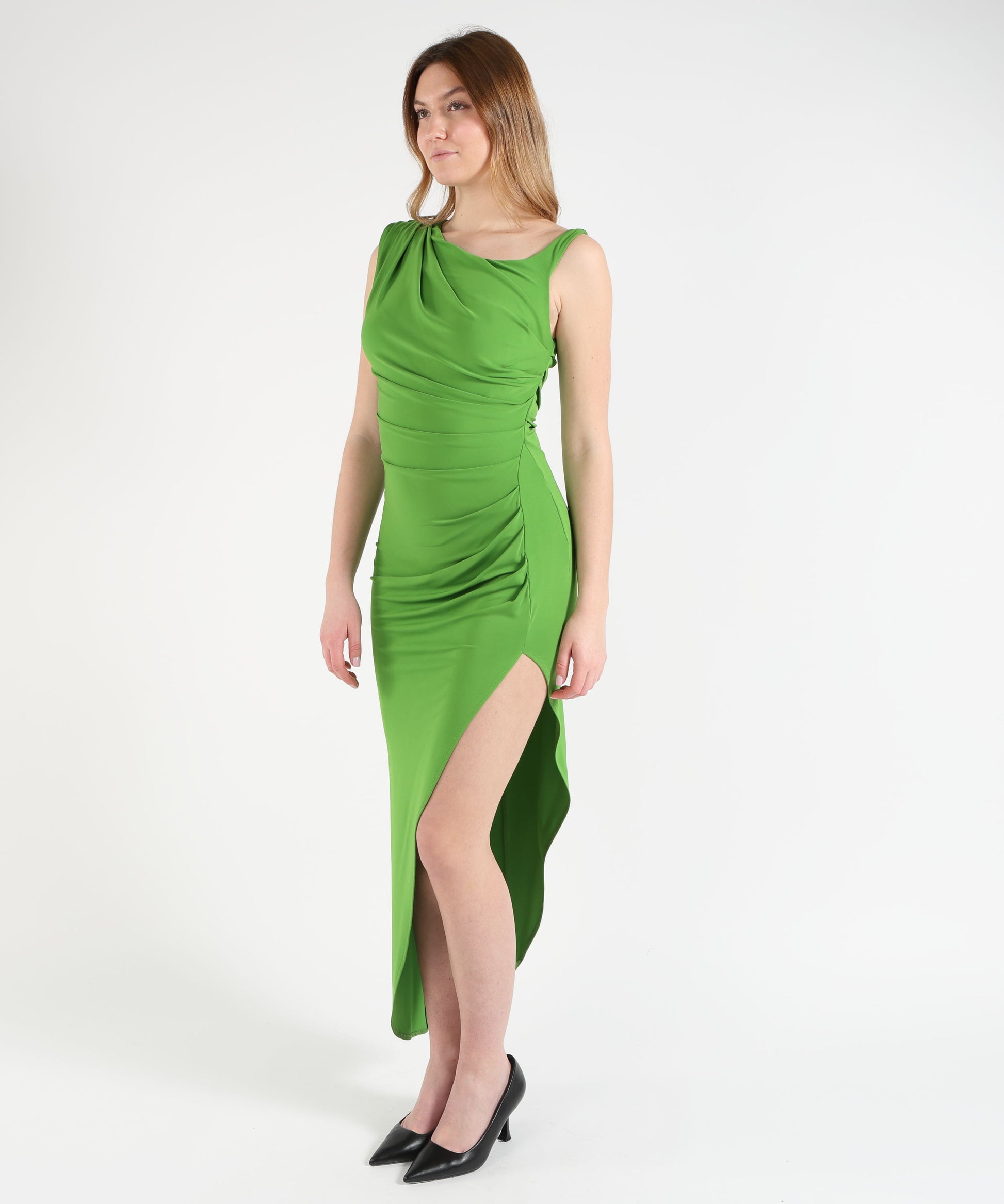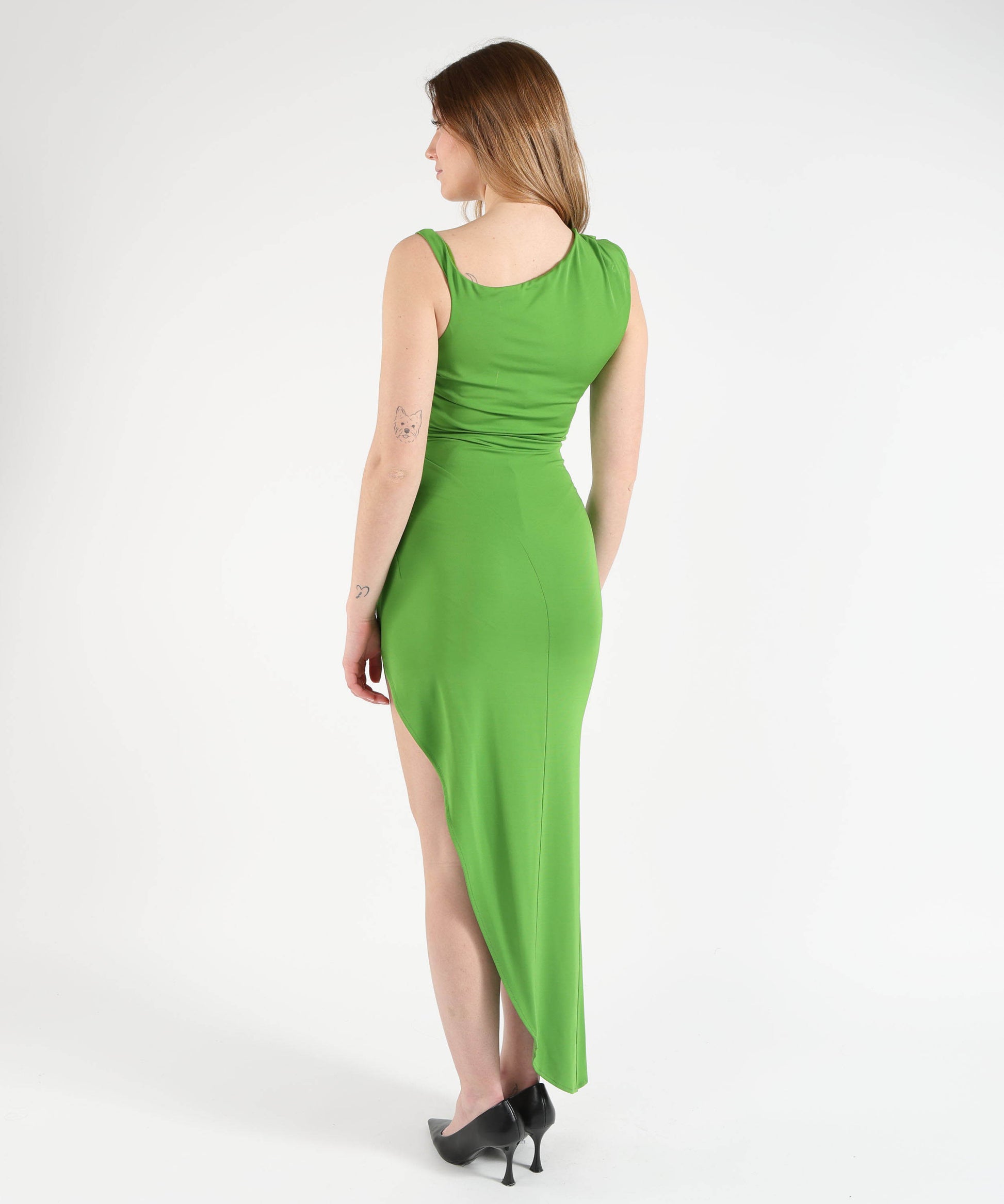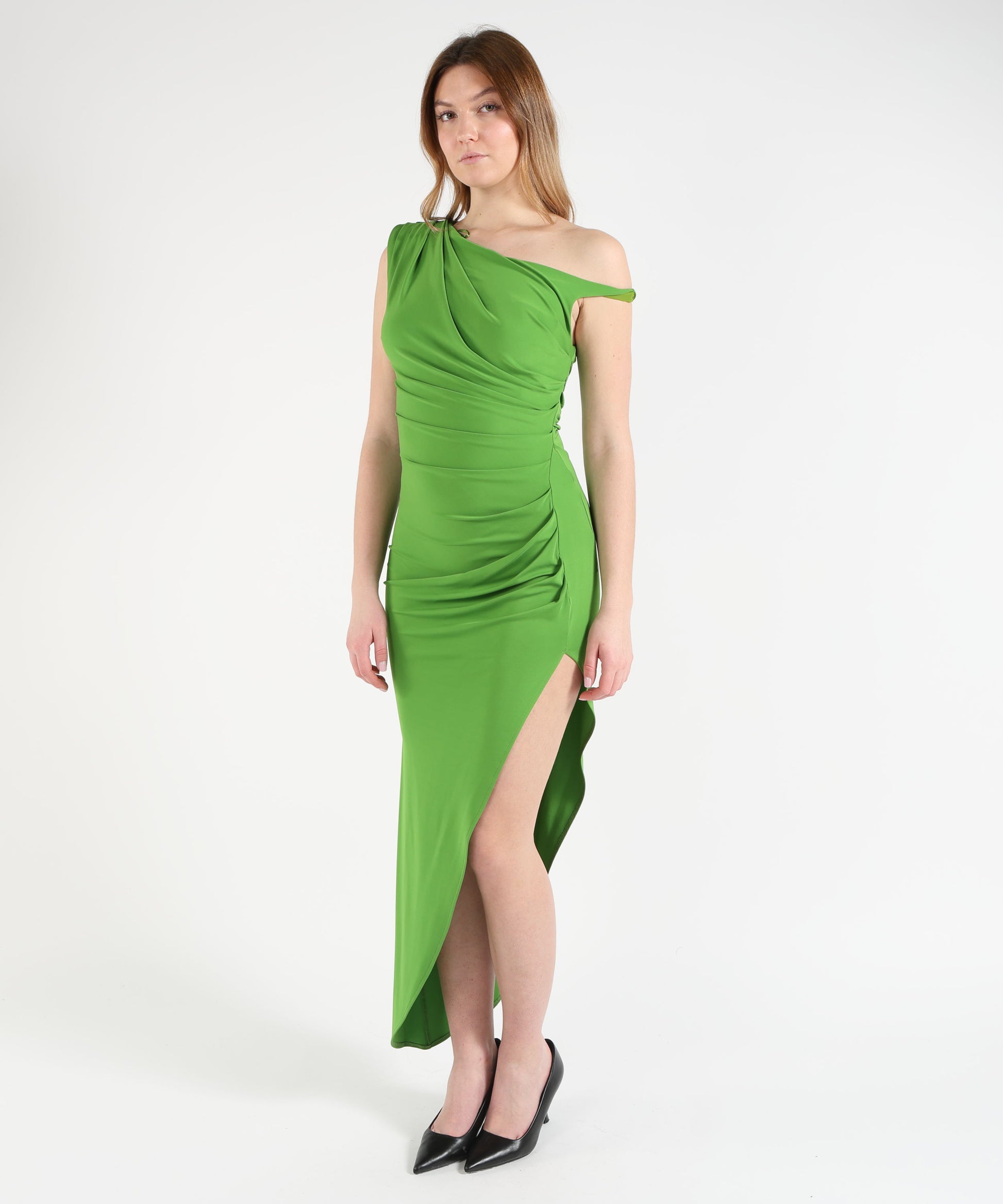 Abito donna in jersey crêpe dalla vestibilità aderente, un capo elegante e seducente, perfetto per occasioni speciali. Il modello presenta un design monospalla strutturata, impreziosito da una mezzaluna in metallo dorato che dona luce e carattere al décolleté. La gonna asimmetrica con profondo spacco laterale valorizza la silhouette e aggiunge un tocco femminile e sensuale. Il capo include spallina imbottita, slip interno in tulle elasticizzato per comfort e sicurezza e zip invisibile laterale per una chiusura discreta. Dettagli prodotto: