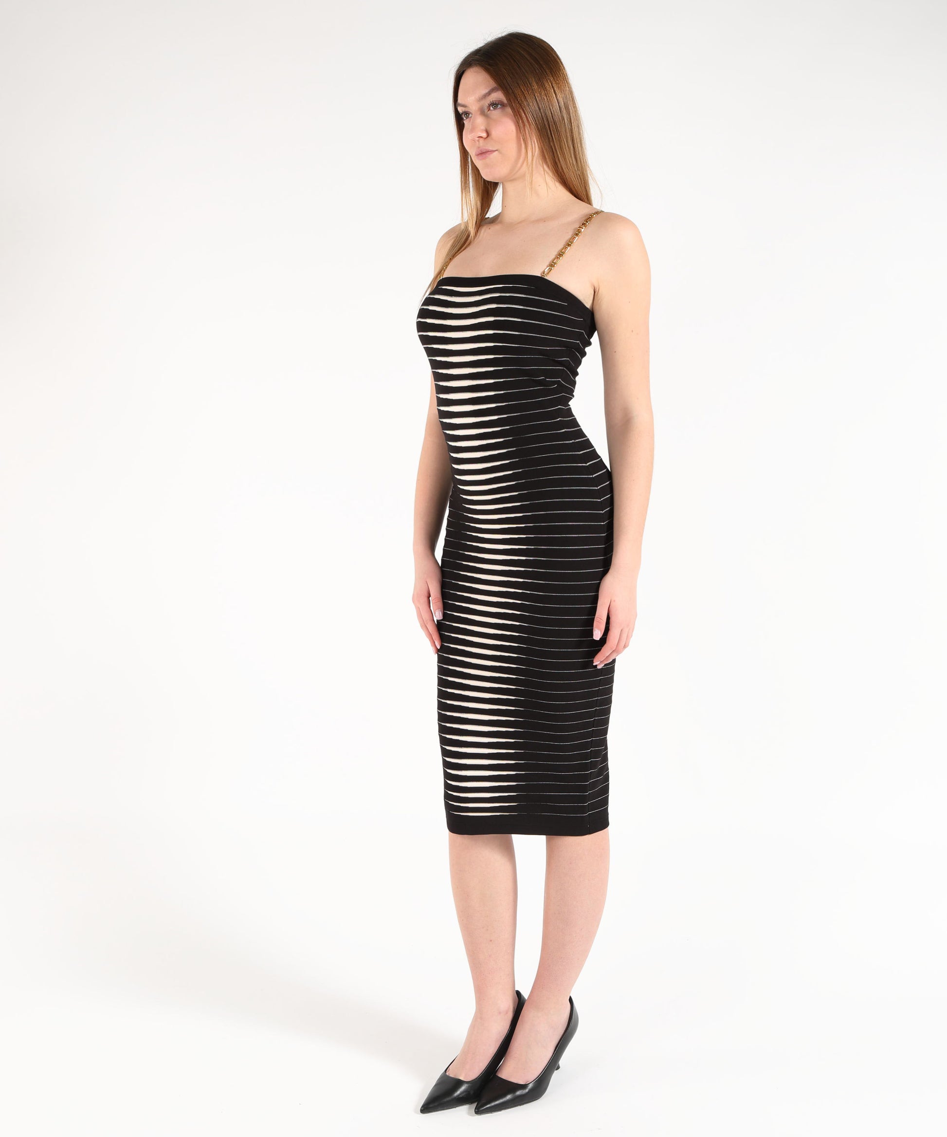 Abito tubino donna in maglia jacquard a righe dégradé effetto zebra, con spalline gioiello amovibili in catena dorata e vestibilità aderente. Elegante, moderno e versatile per occasioni speciali.