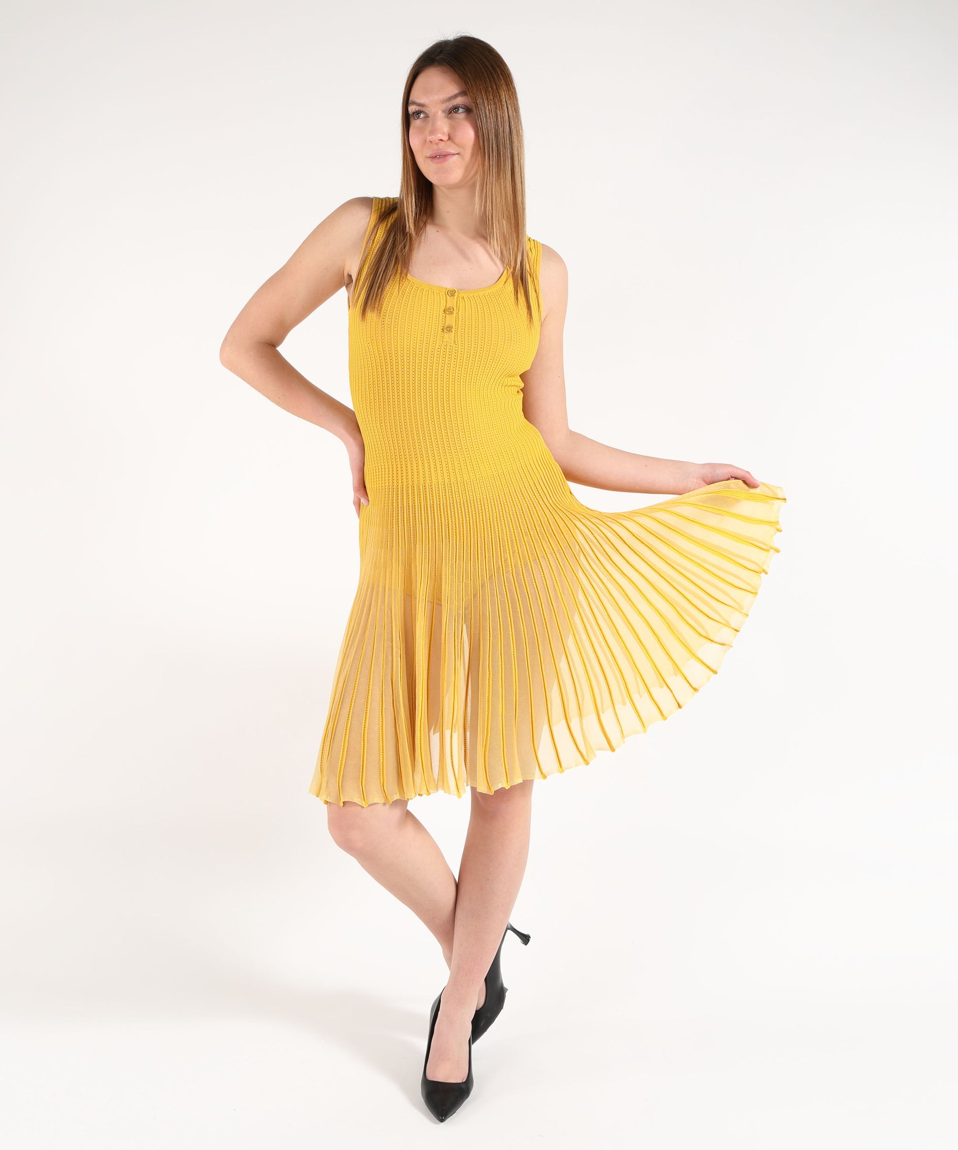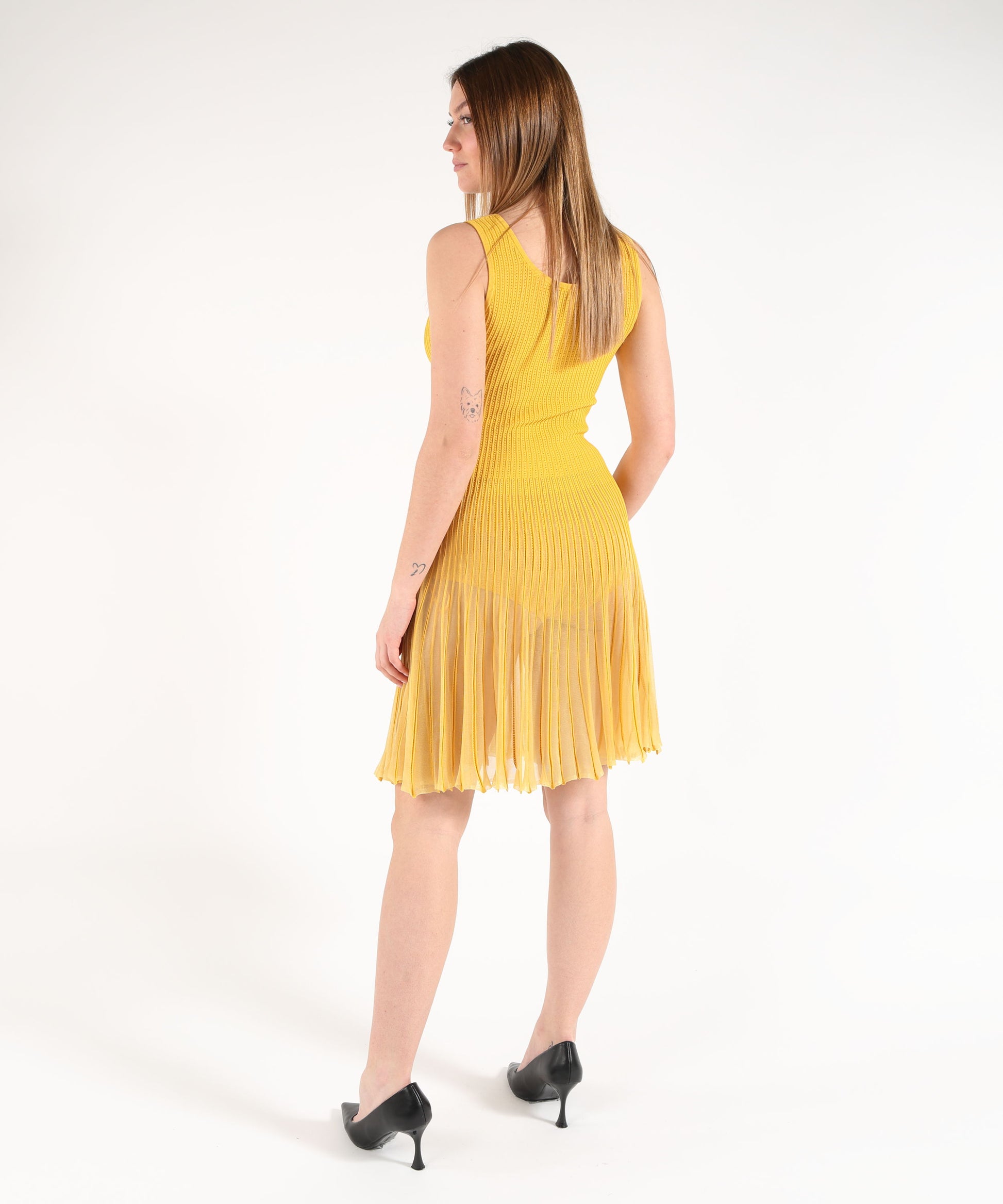 Abito donna in maglia aderente smanicato con scollo ampio, effetto plissé grazie a costine traforate e culotte abbinata. Dettagli metallici dorati con logo per un look elegante e sofisticato.