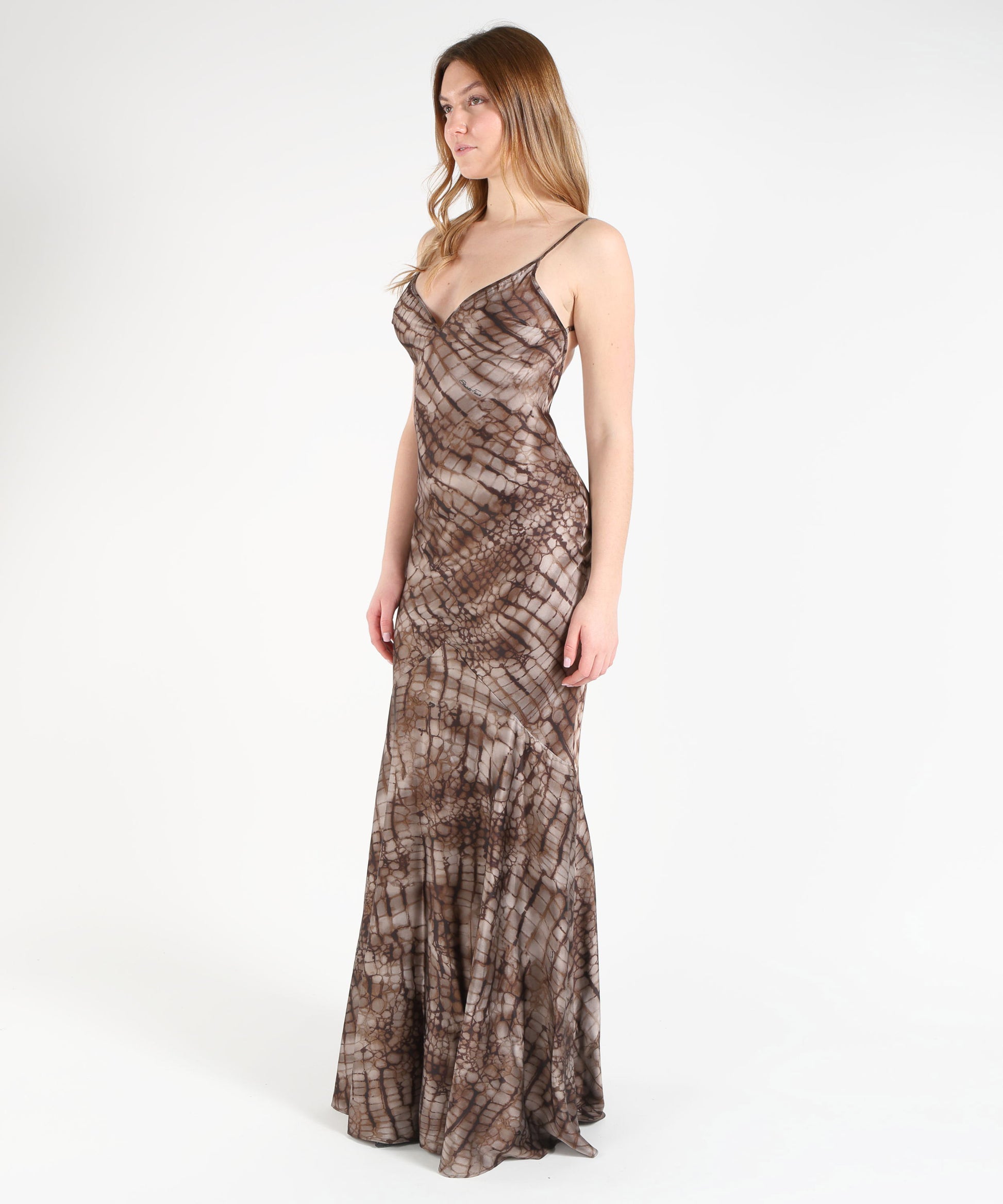 Abito da sera donna in raso stretch dalla vestibilità slim, elegante e scenografico. Il modello presenta spalline sottili e retro scoperto, mentre la stampa all-over a tema alligatore dona un tocco audace e contemporaneo ispirato a forme naturali. La gonna a spicchio si apre in morbidi volumi sul fondo, creando movimento e leggerezza ad ogni passo.