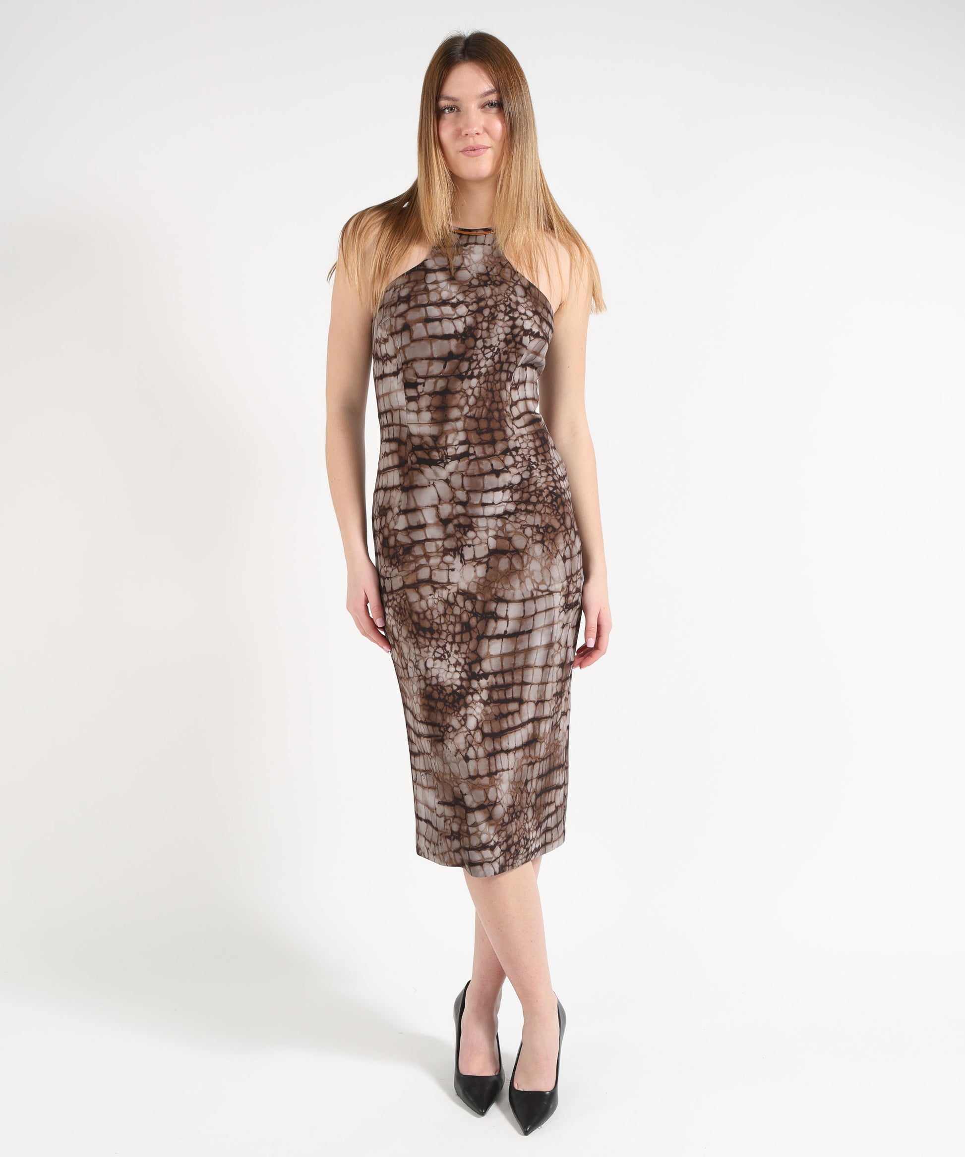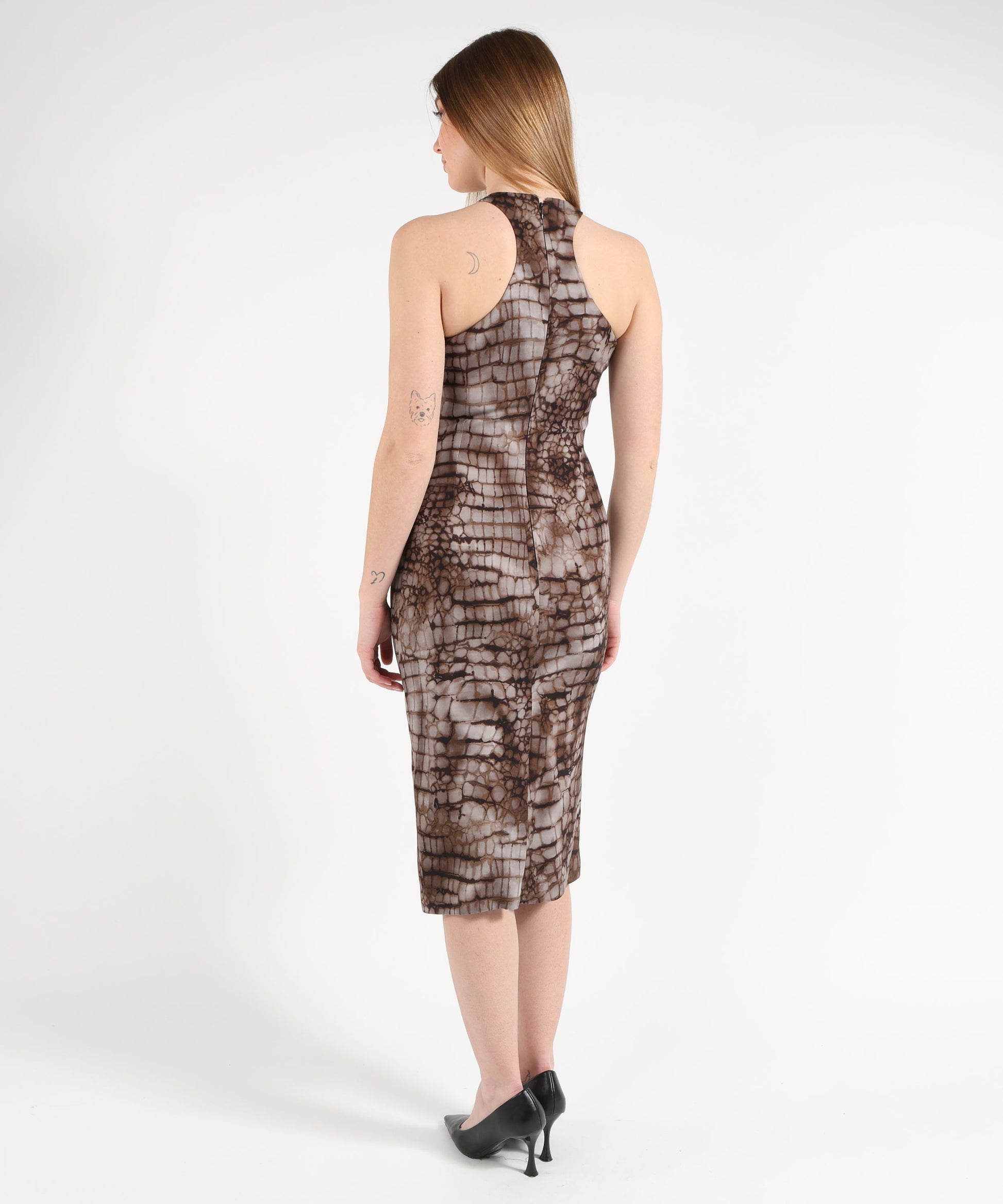 Abito tubino Elisabetta Franchi in misto viscosa con motivo alligatore marrone/beige, scollo olimpionico, accessorio oro, spacco e zip sul retro. Elegante e aderente.