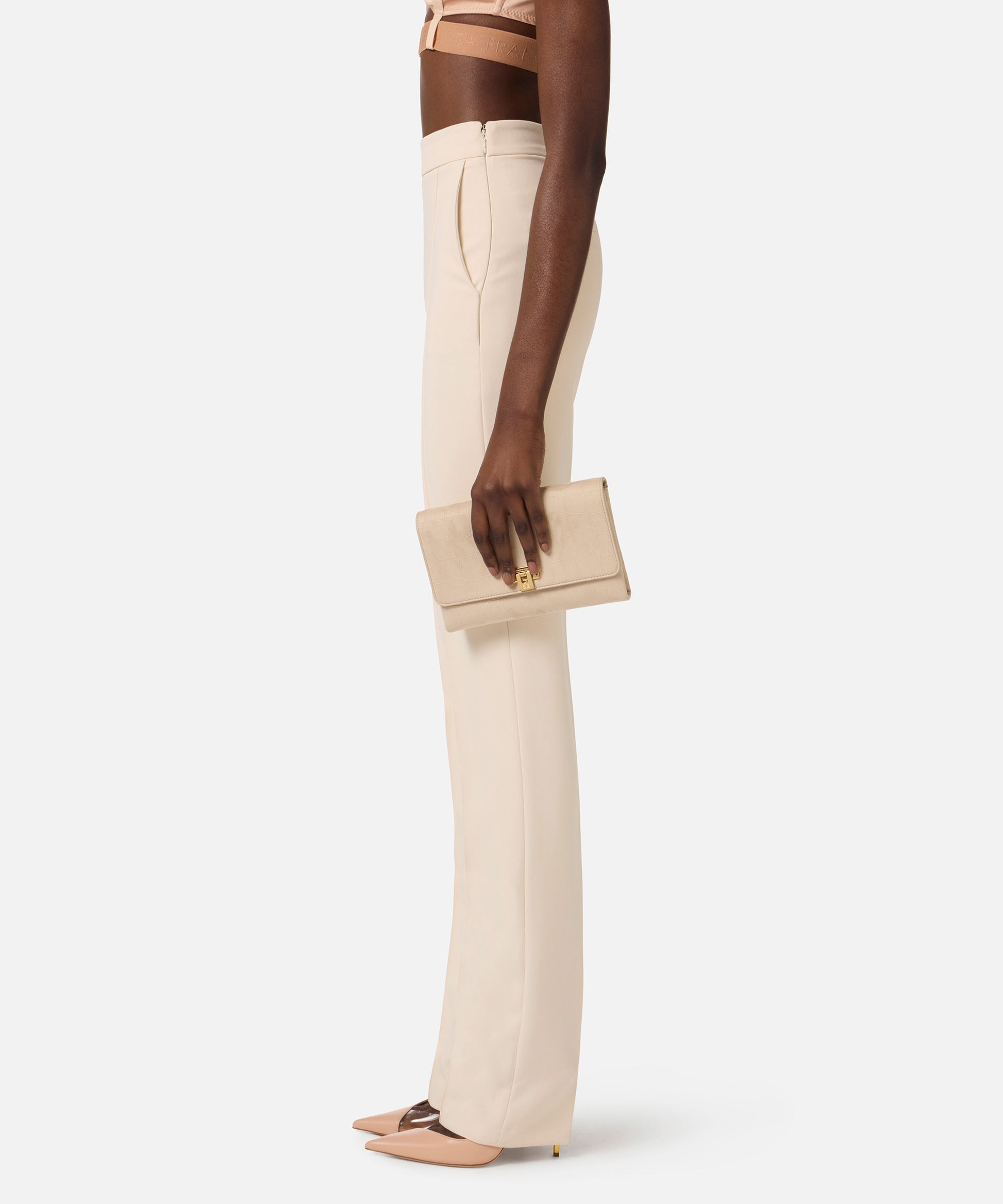 Borsa a mano Elisabetta Franchi in ecopelle beige con finitura effetto coccodrillo, design elegante e moderno. Dotata di chiusura a scatto e dettagli in metallo dorato con catena. Accessorio versatile, Made in Italy, ideale per look da giorno e da sera.
