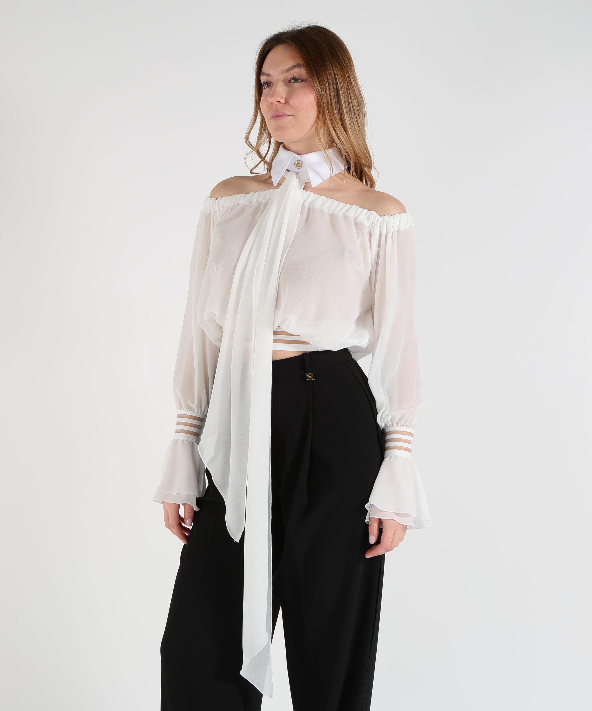 Camicia cropped in chiffon regular fit con scollo omerale, collo classico, maniche lunghe e ampie con polsini. Chiusura con gancio e nodo sul retro, arricciature, logo e applicazioni a contrasto.