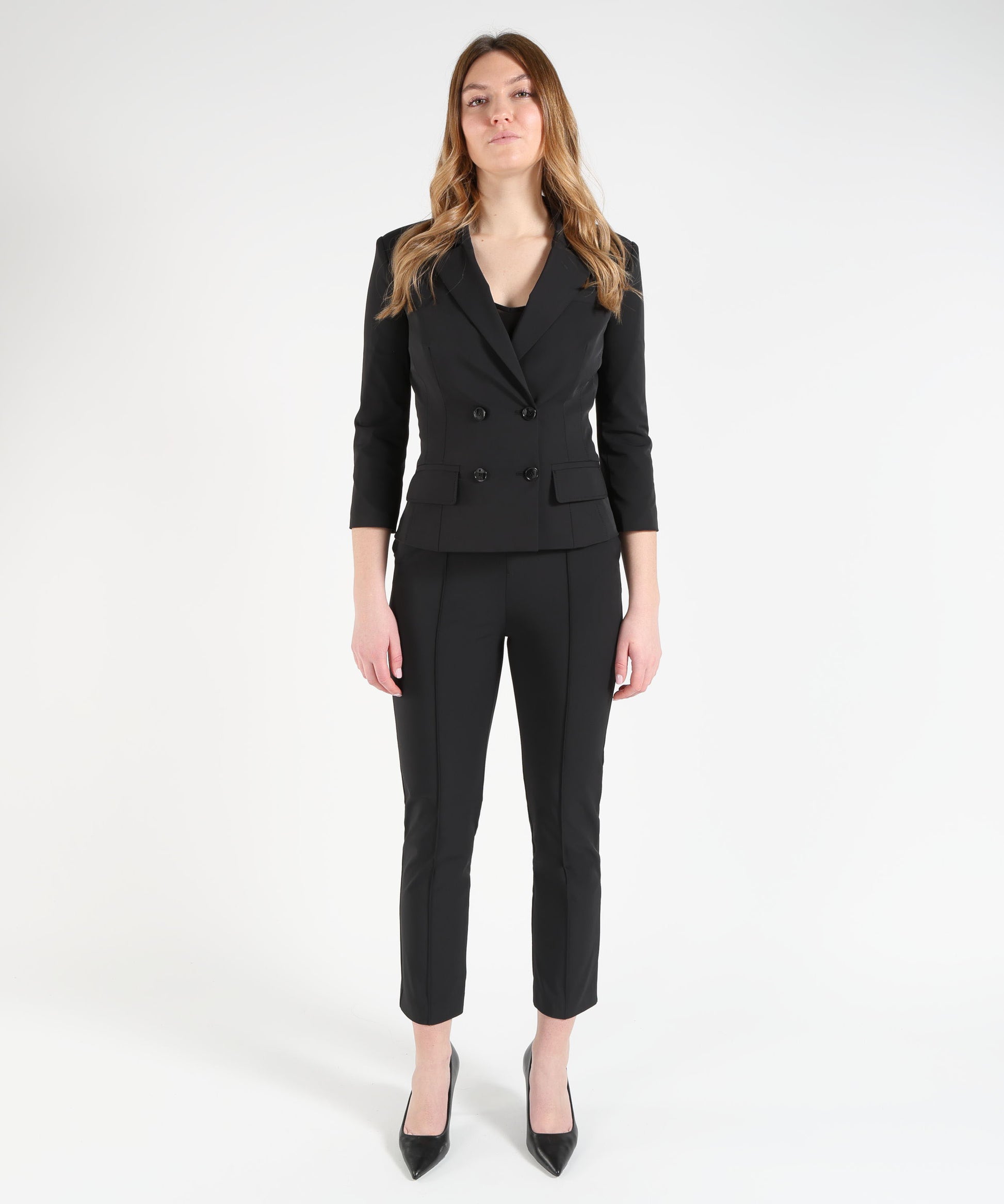 Giacca blazer da donna realizzata in tessuto tecnico bielastico, studiato per garantire una vestibilità confortevole e allo stesso tempo strutturata. Il modello presenta rever classico e maniche a ¾, dettagli che conferiscono al capo un’eleganza moderna e femminile. La linea aderente valorizza la silhouette, mentre il punto vita è enfatizzato dalla cintura coordinata con placca in metallo dorato impreziosita dal logo inciso con lavorazione laser, elemento distintivo che dona luce e carattere al design. Le patte applicate, le impunture decorative e i bottoni in tono completano la giacca con un’estetica curata e raffinata. All’interno, la fodera in raso assicura comfort e una vestibilità impeccabile, mentre le spalline imbottite definiscono la struttura del capo. Dettagli prodotto:
