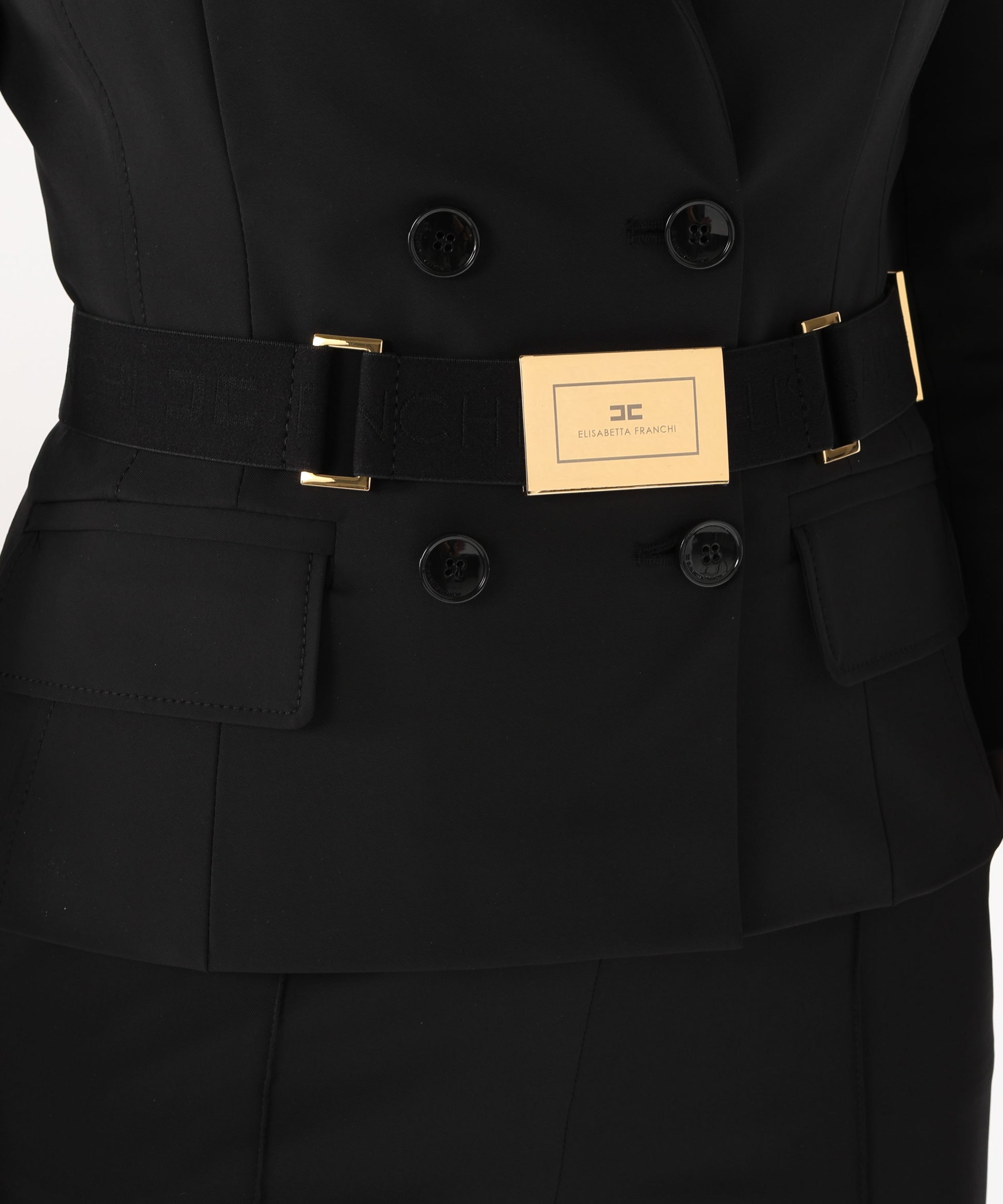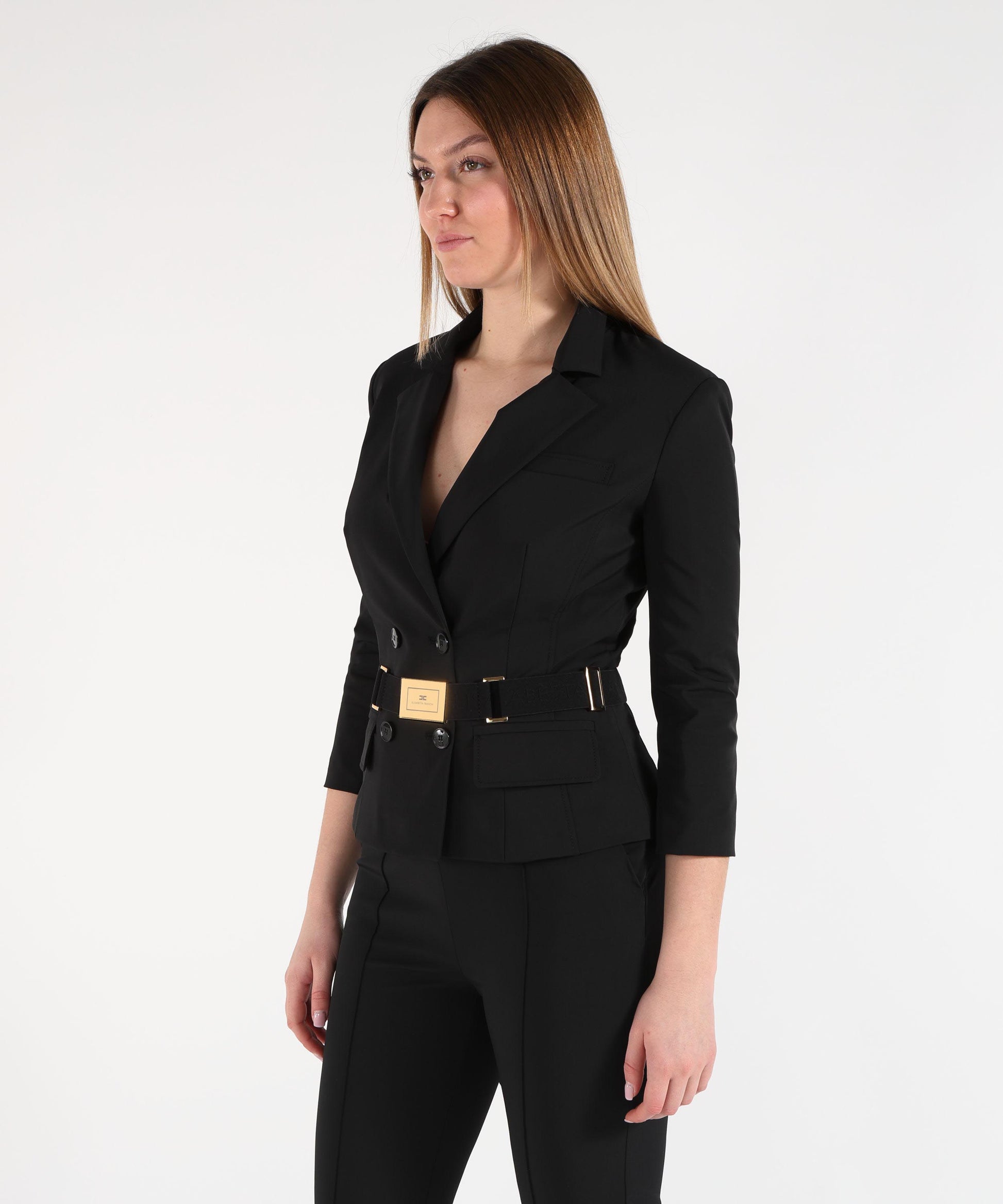 Giacca blazer in tessuto tecnico bielastico con vestibilità aderente, rever classico e maniche a ¾. Dotata di cintura in vita con placca in metallo dorato con logo laserato, spalline imbottite, patte applicate e fodera in raso. Elegante e strutturata.